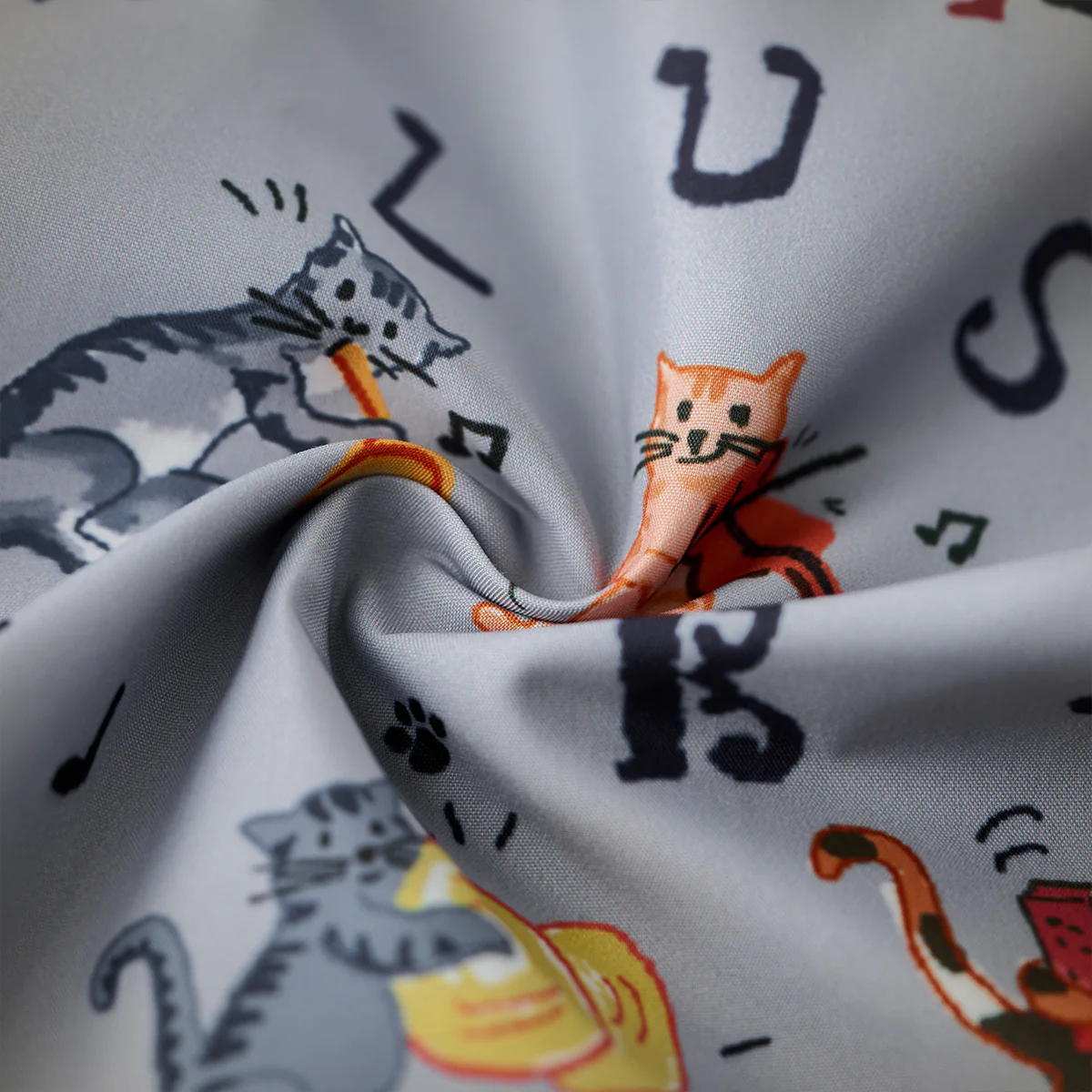 茶色いギター猫がアコースティックギターを演奏、ポーズはライブ感のある動きで、尻尾までリズムを刻んでいるよう。青灰色の猫がサックスを構え、楽譜や音符が周囲に舞っている演出ある。オレンジ猫がアコーディオンを抱えて演奏、脇を広げて大きく胴体を開閉している動作がユーモラス。ピンク寄りのオレンジの猫がバイオリンを弾く、背筋を伸ばし、クラシックな姿勢だ。黄色ベースの猫がシンバルを叩く、アニメ風にエネルギッシュで、尻尾を使っている描写もある。黒っぽい猫がタクトを持ち、周囲を指揮している。