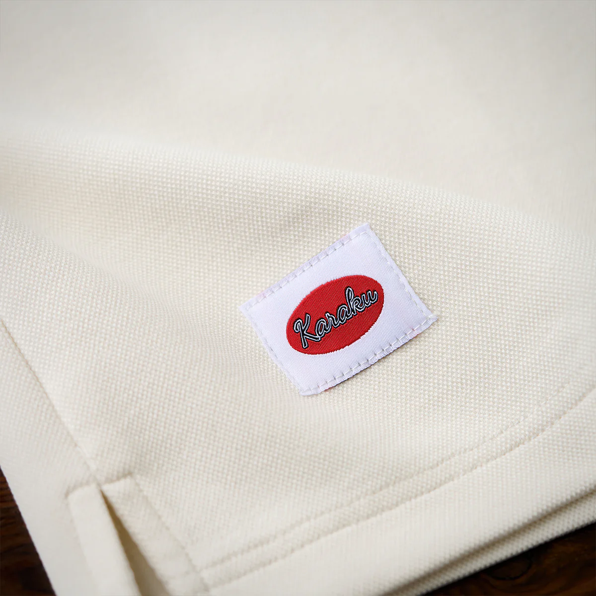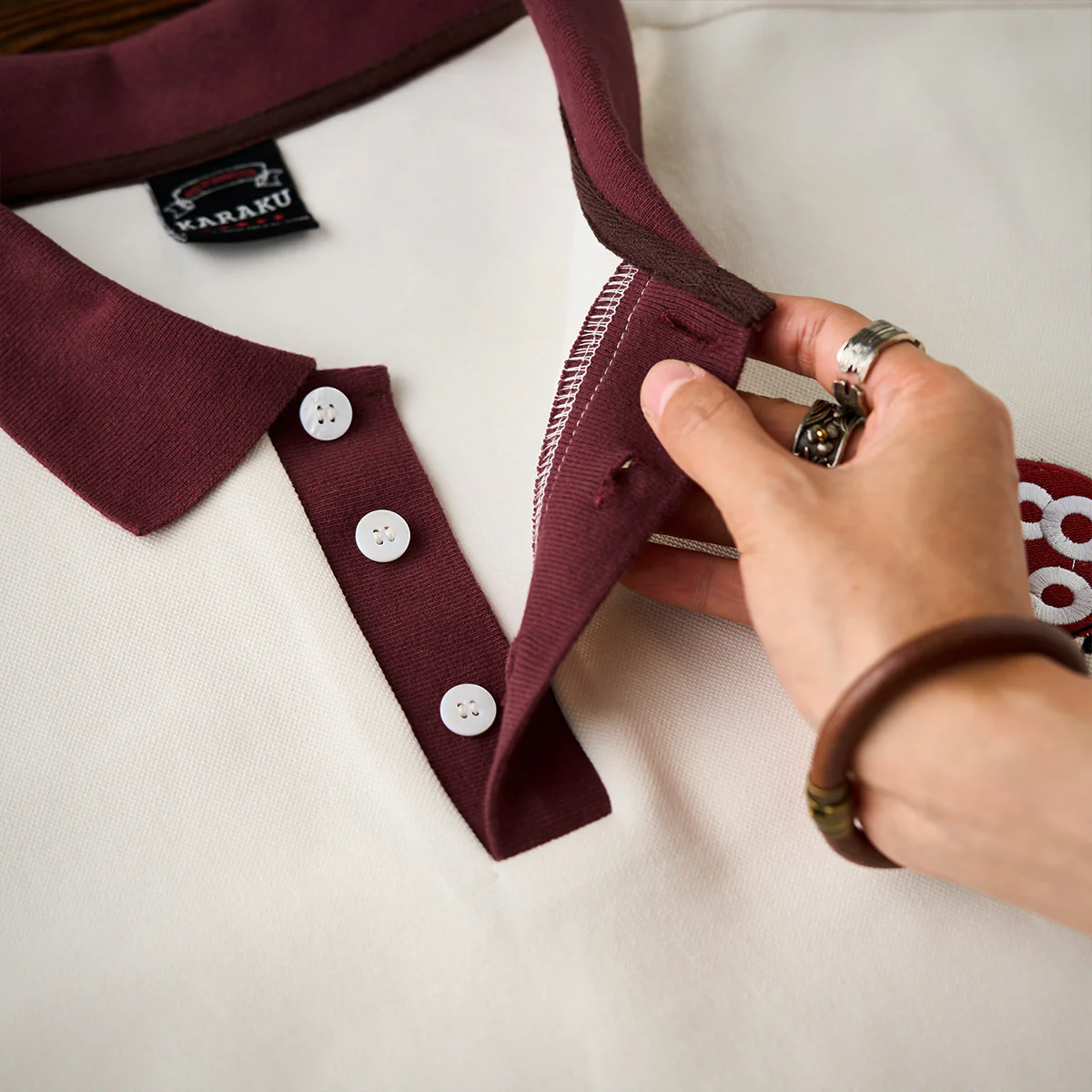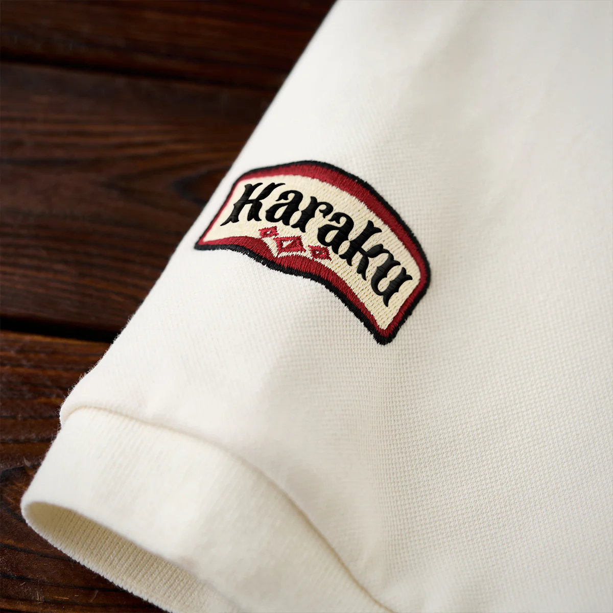 「Karaku Plus」のロゴ刺繍が袖口に配置され、視覚的なアクセントを加え。レッドxブラックの糸が使われて、ナチュラルな生地色と調和。