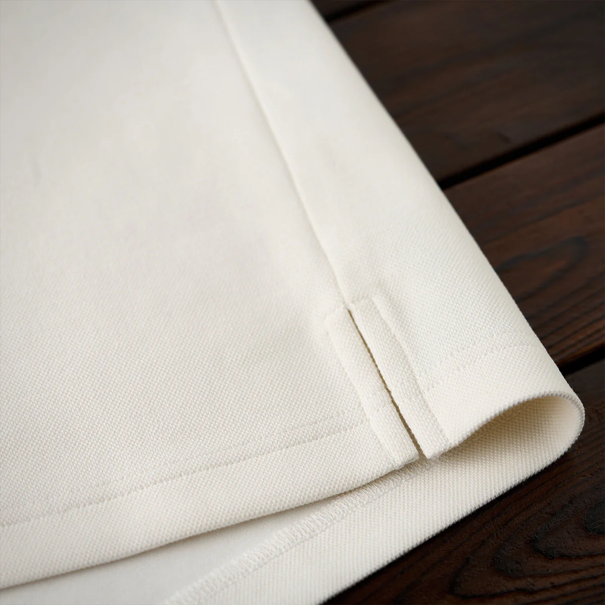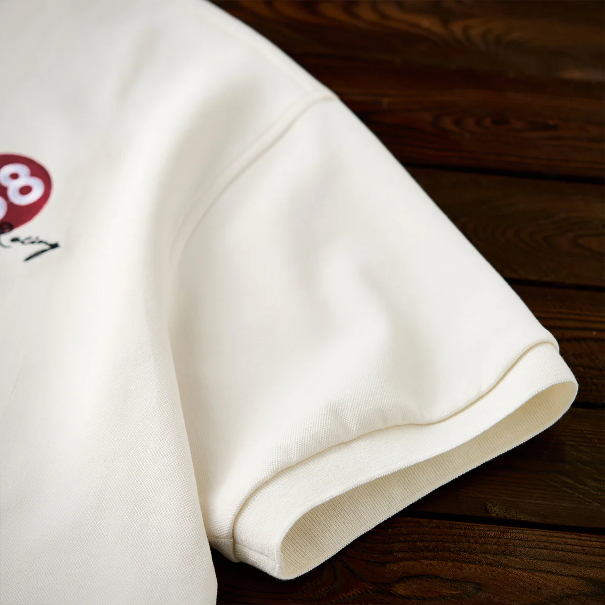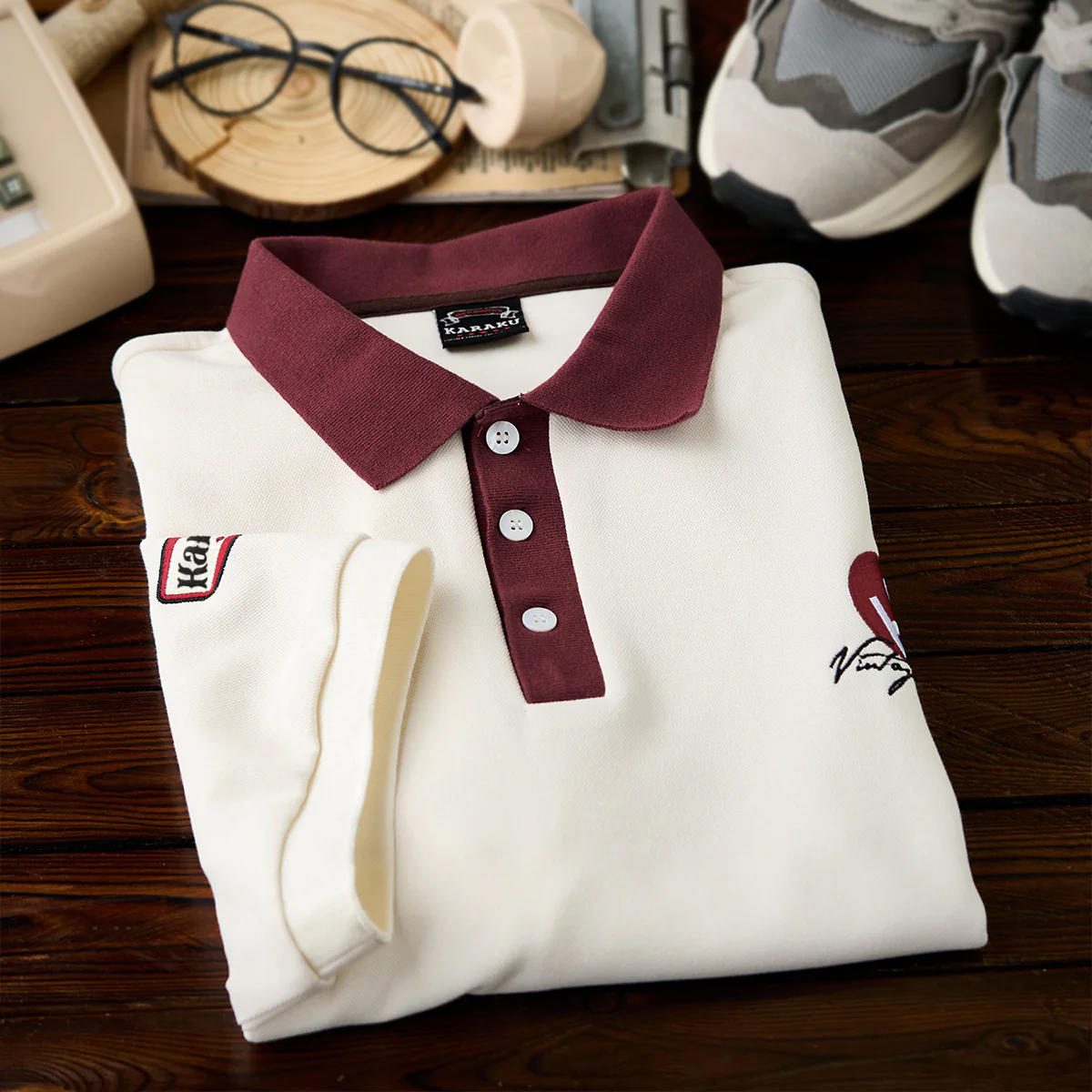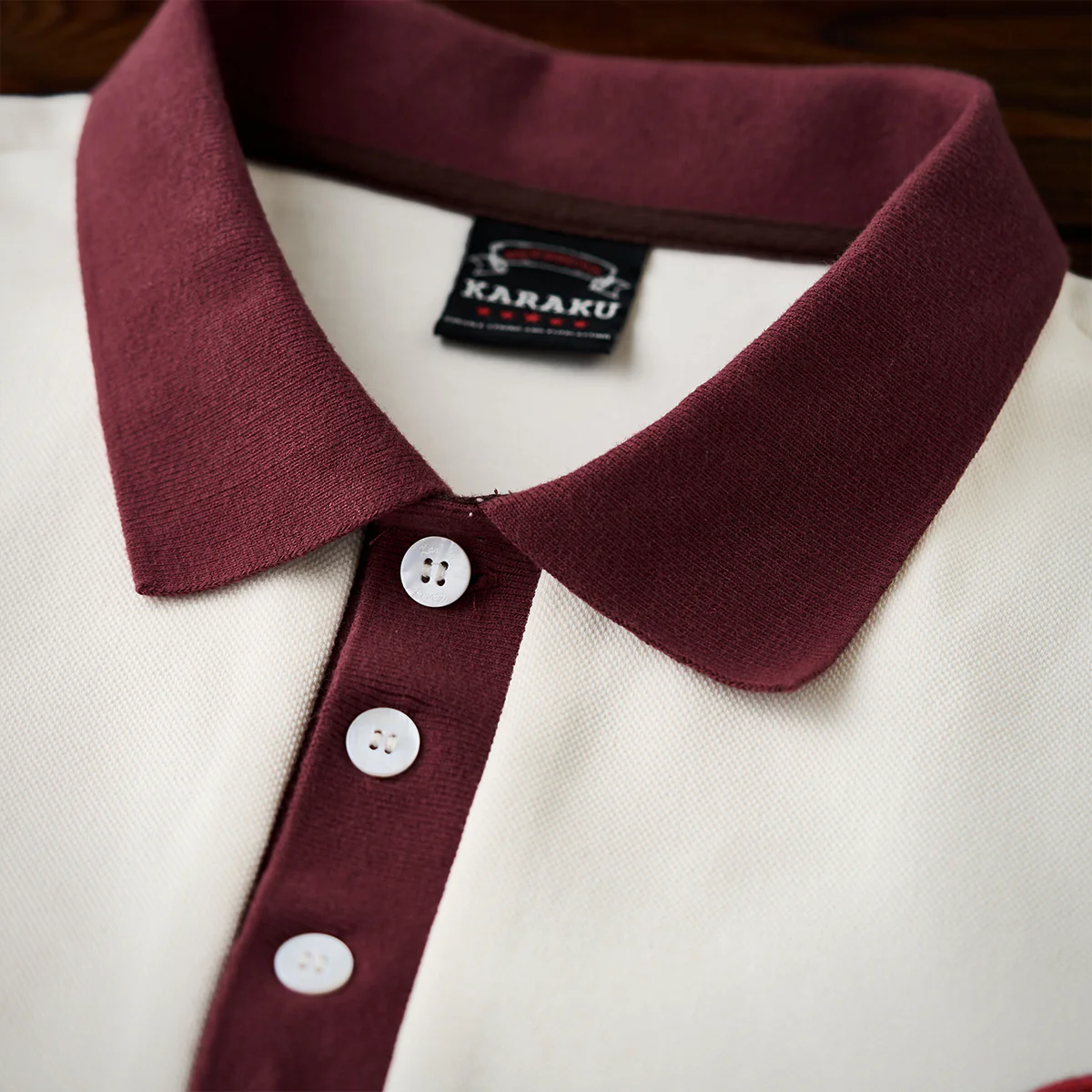 「Karaku Plus」のロゴ刺繍が袖口に配置され、視覚的なアクセントを加え。レッドxブラックの糸が使われて、ナチュラルな生地色と調和。