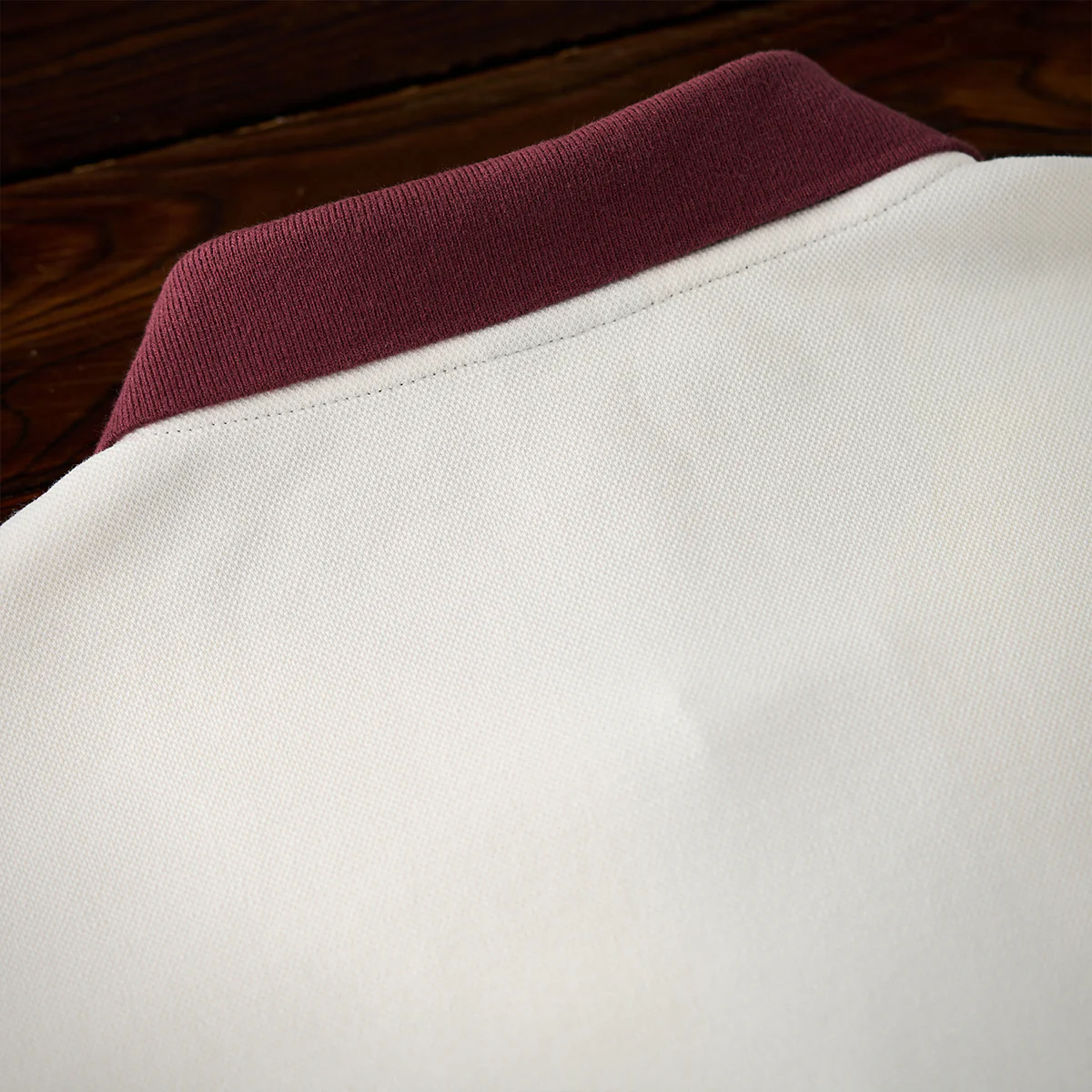 ポロのクラシックな襟元とボタンが特徴で、カジュアルながらも少しフォーマルな印象を与え、特にワインレッド襟が強調されて、スタイル感をアップさせている。