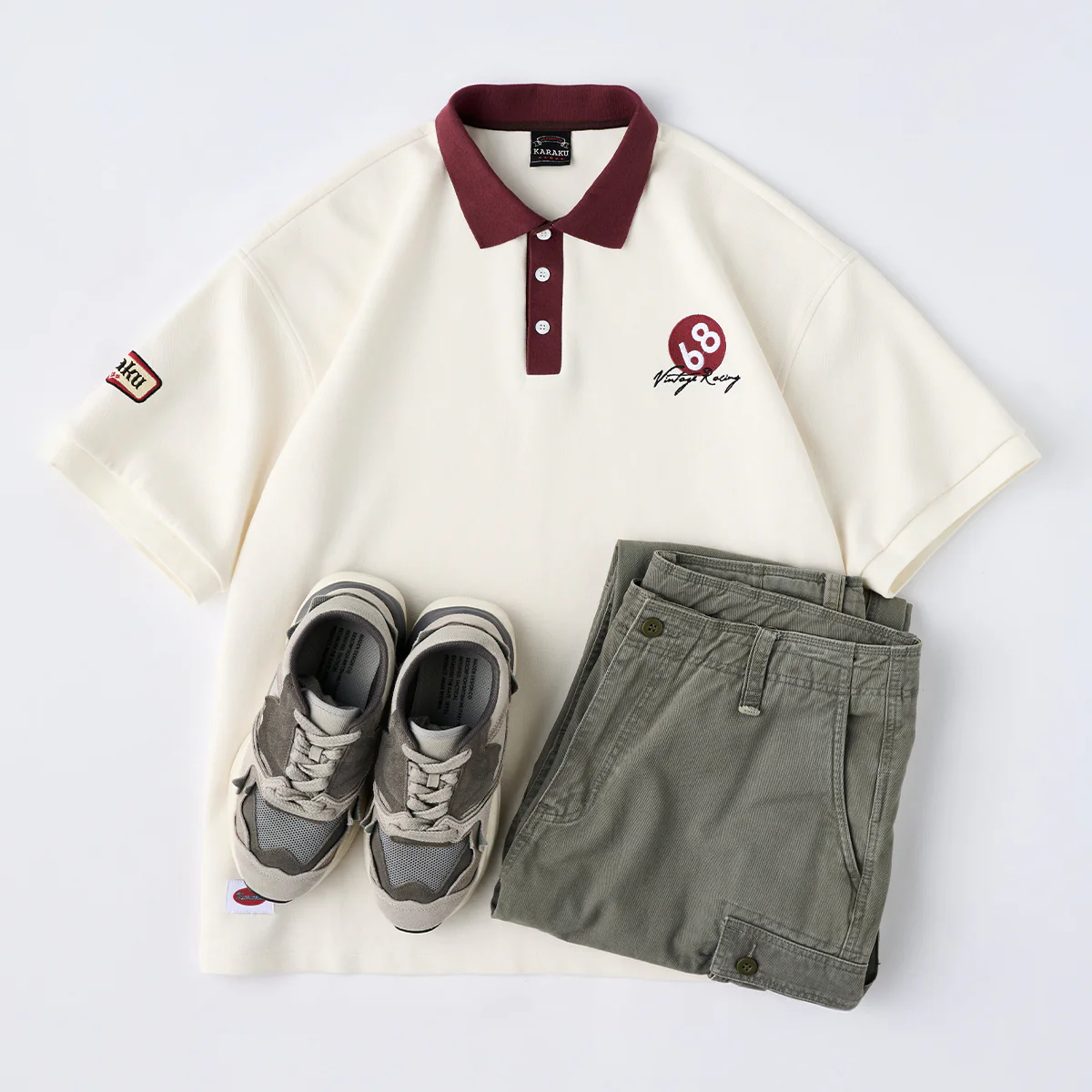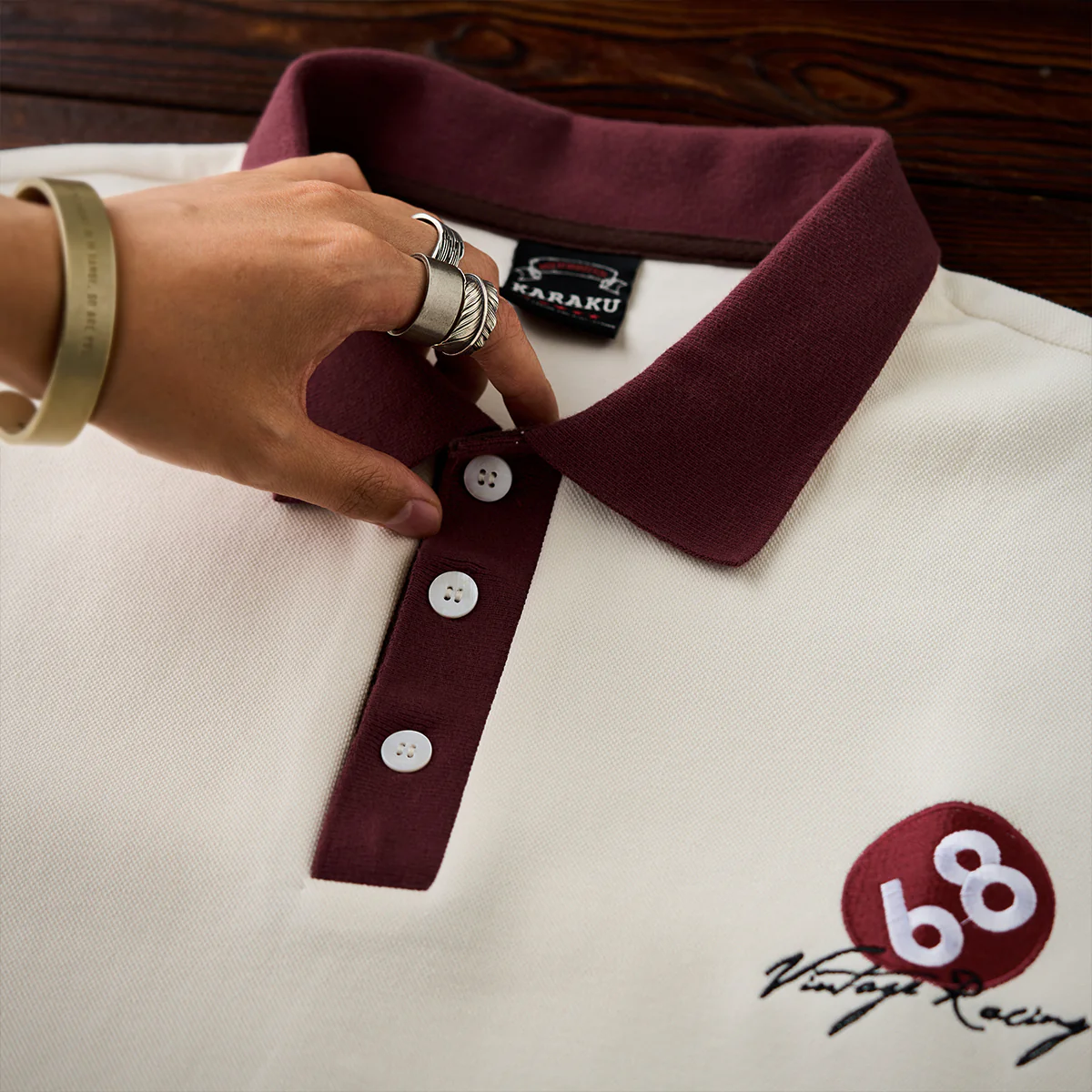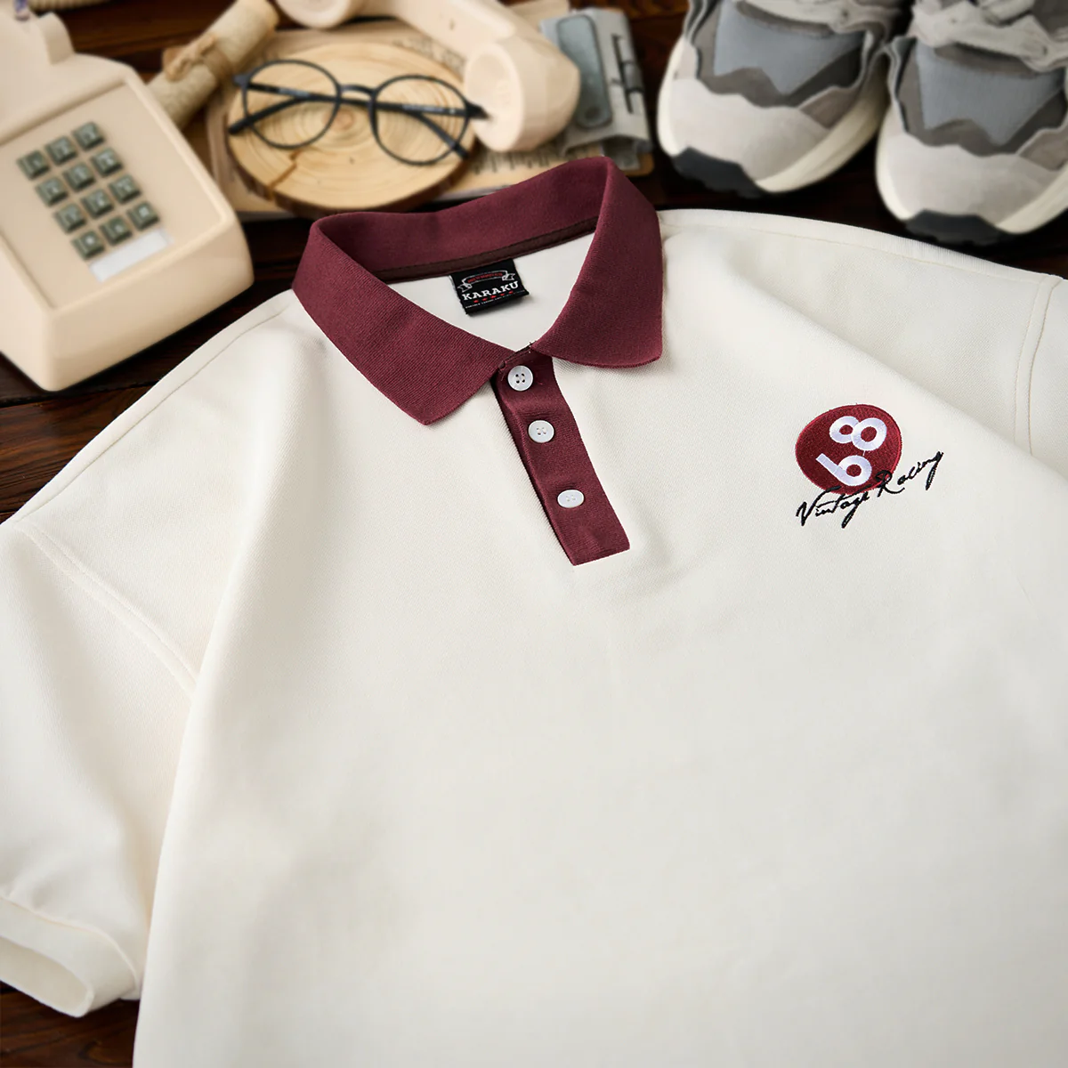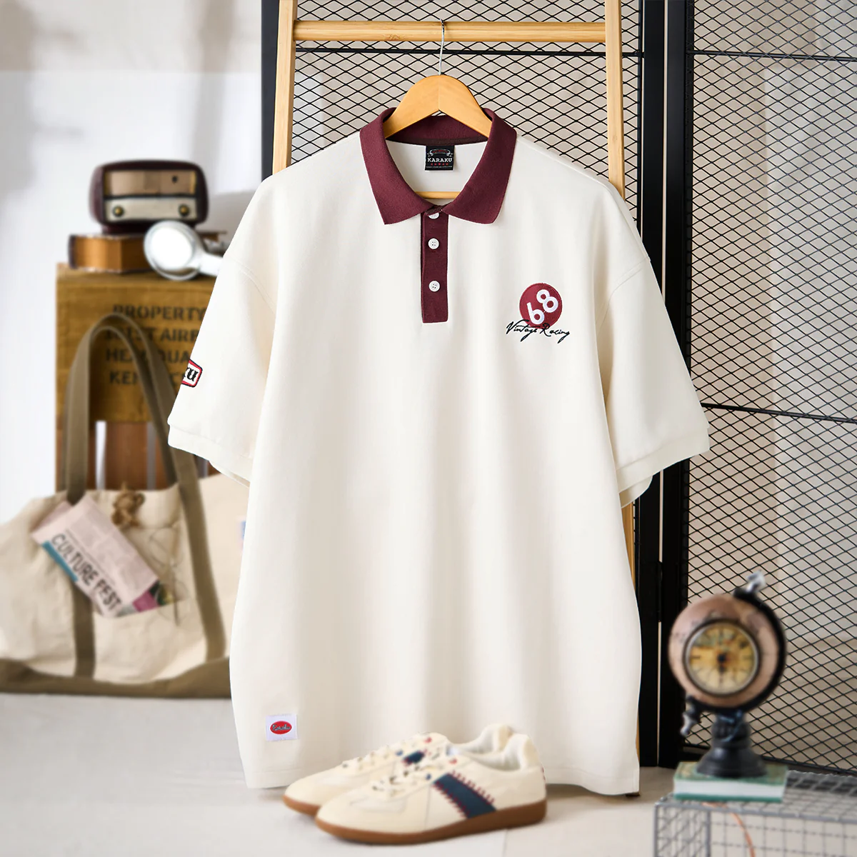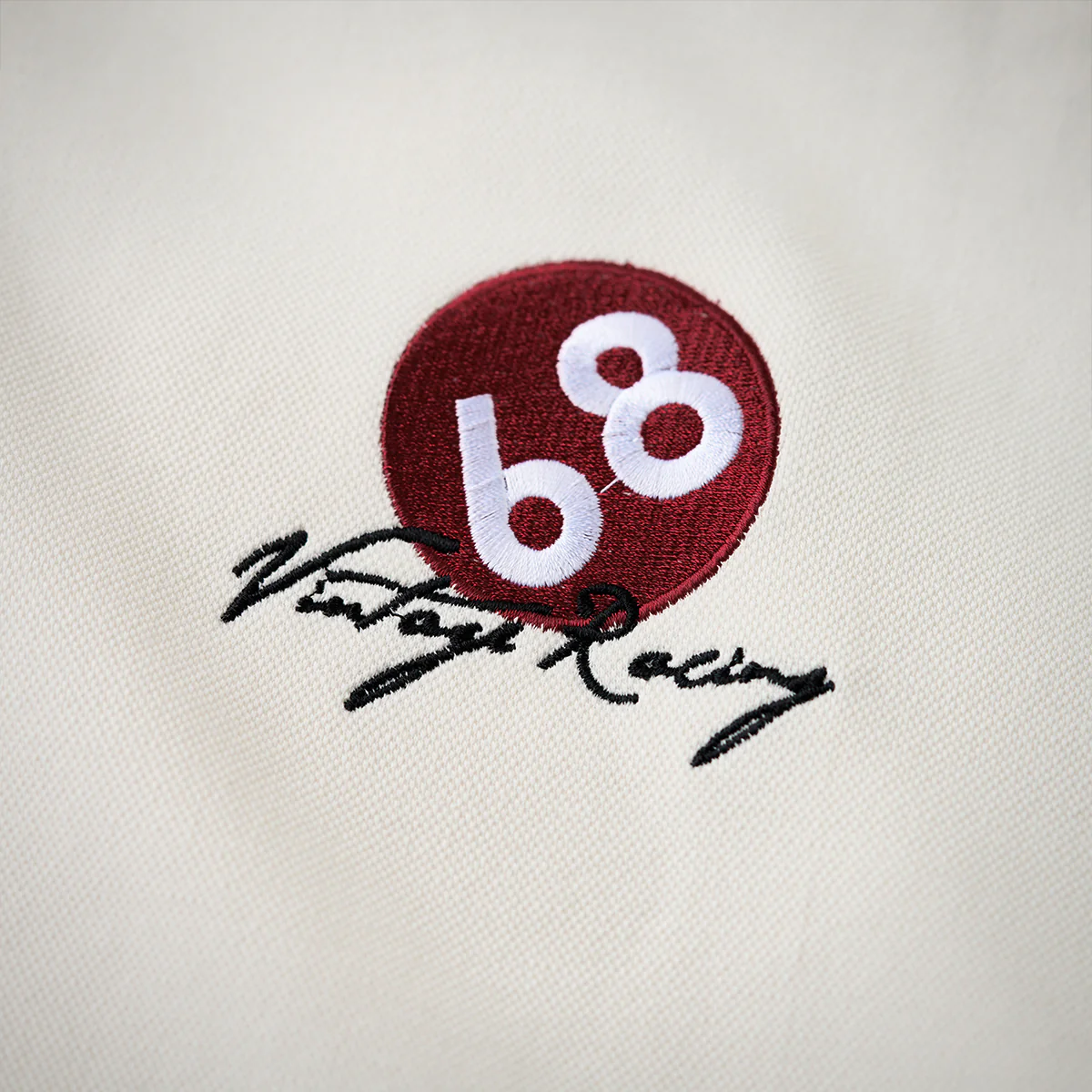 右胸に「68 Vintage Racing」刺繍入り、手書き調で、スピード感や個性を感じさせるタッチ。硬すぎず、カジュアルなレーシング感を演出している。