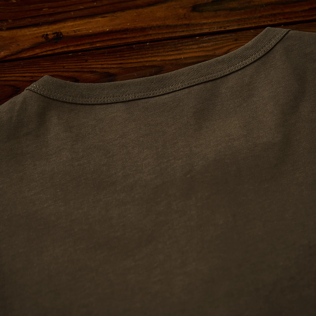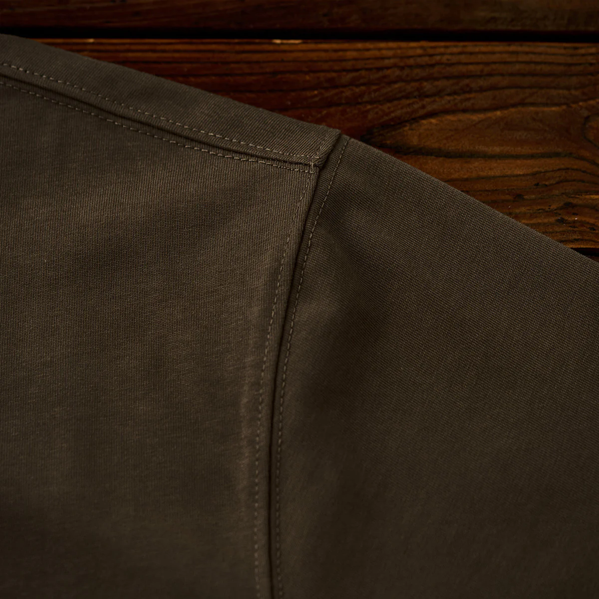 ヘンリーネックと呼ばれる特徴的な首元のスタイルで、襟が3ボタンで閉じられるデザインで、スタイリッシュで洗練された外観を与える。