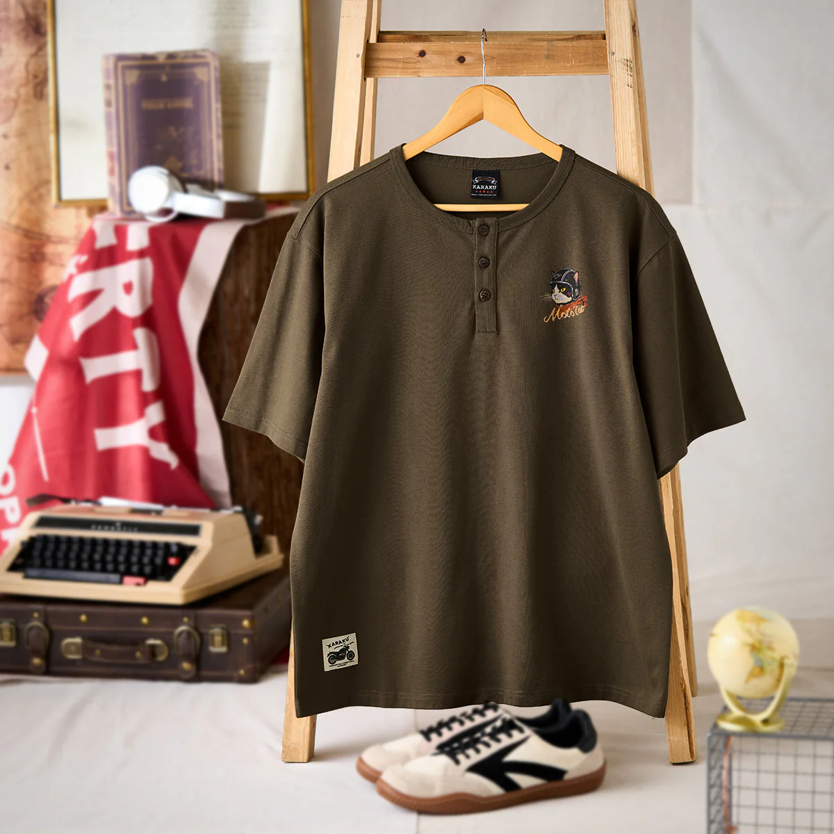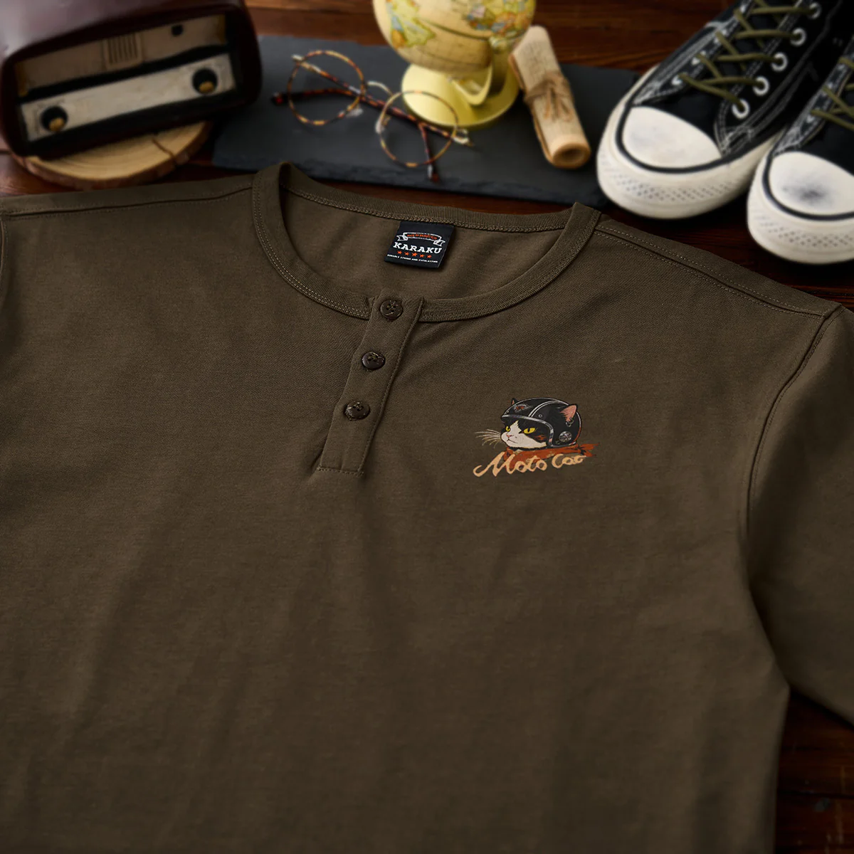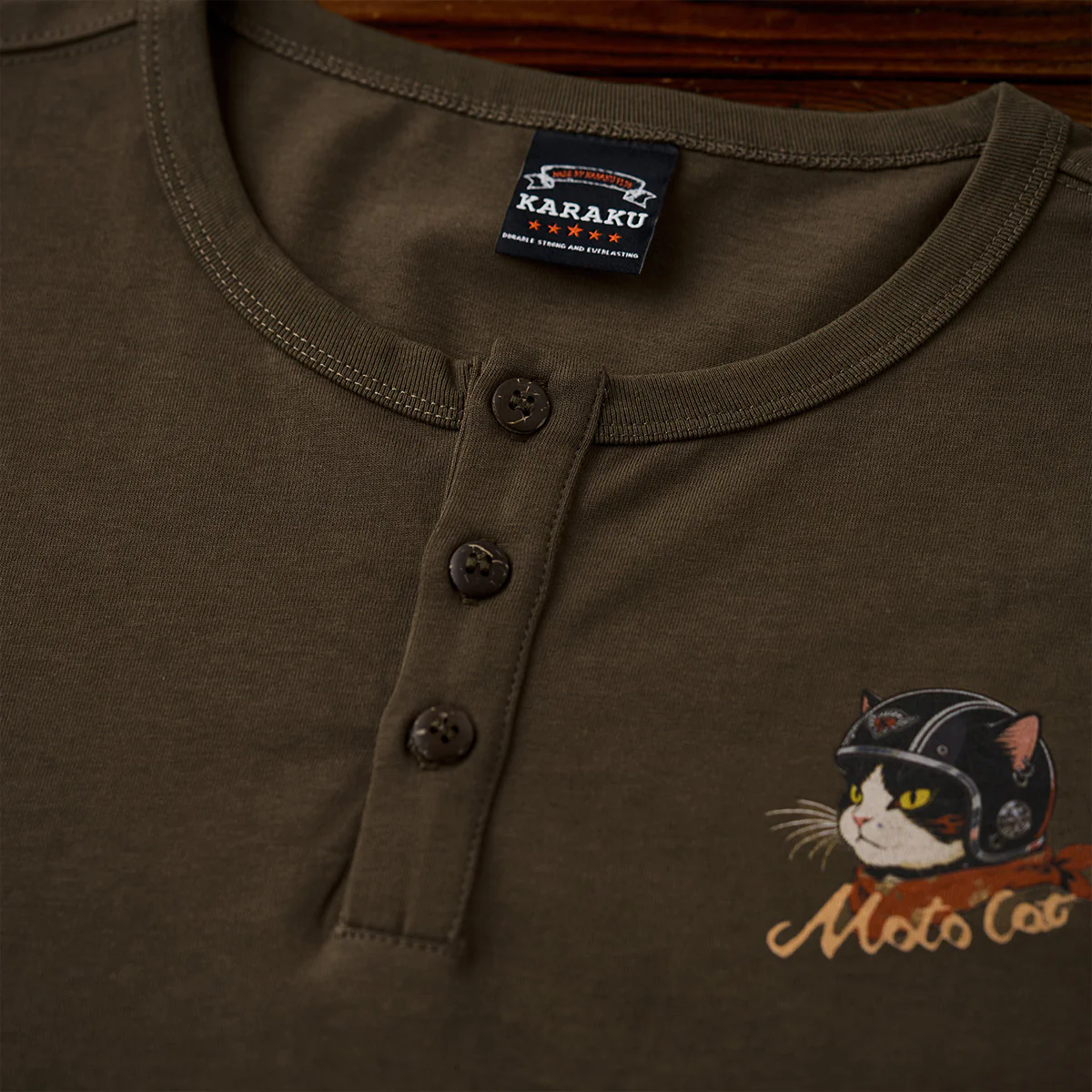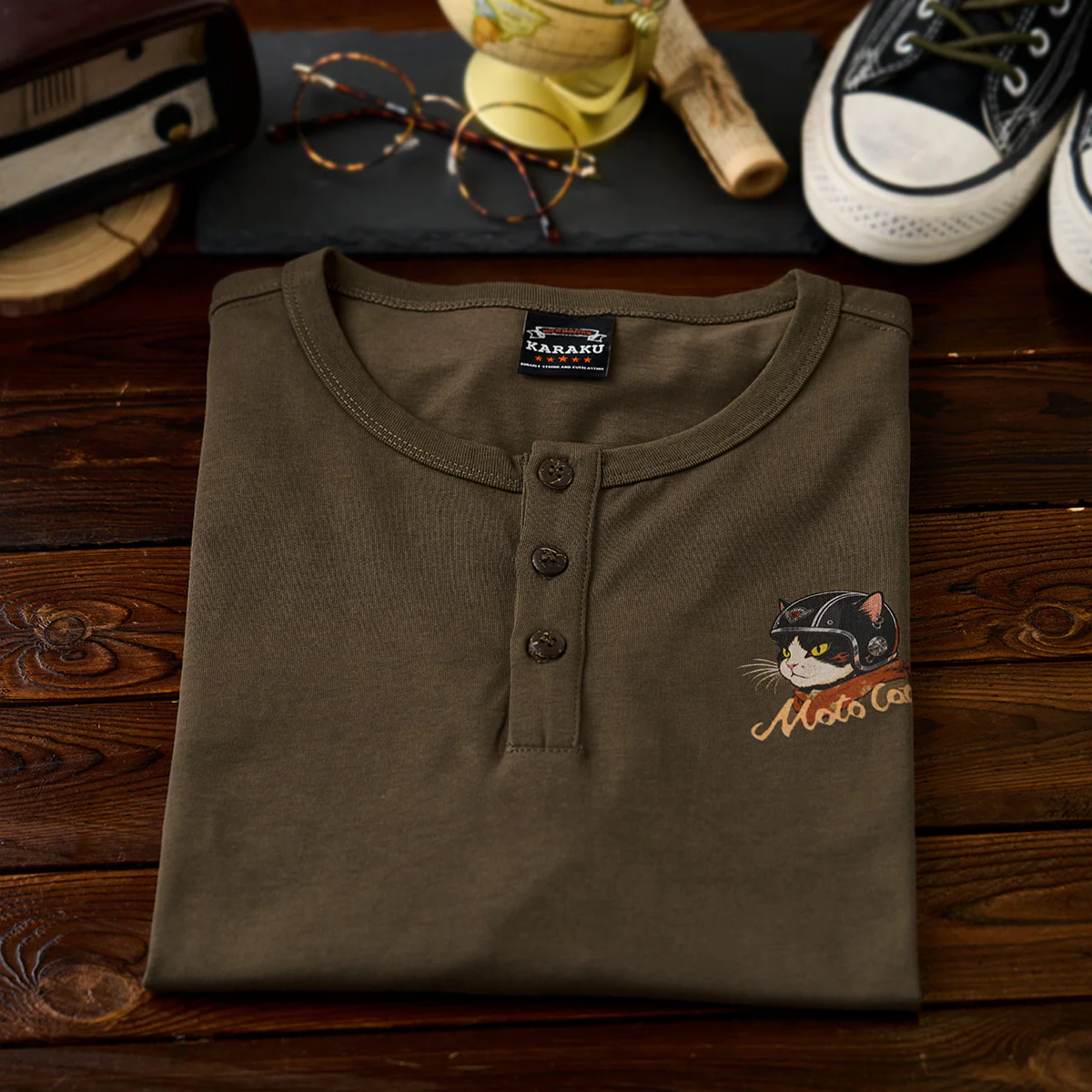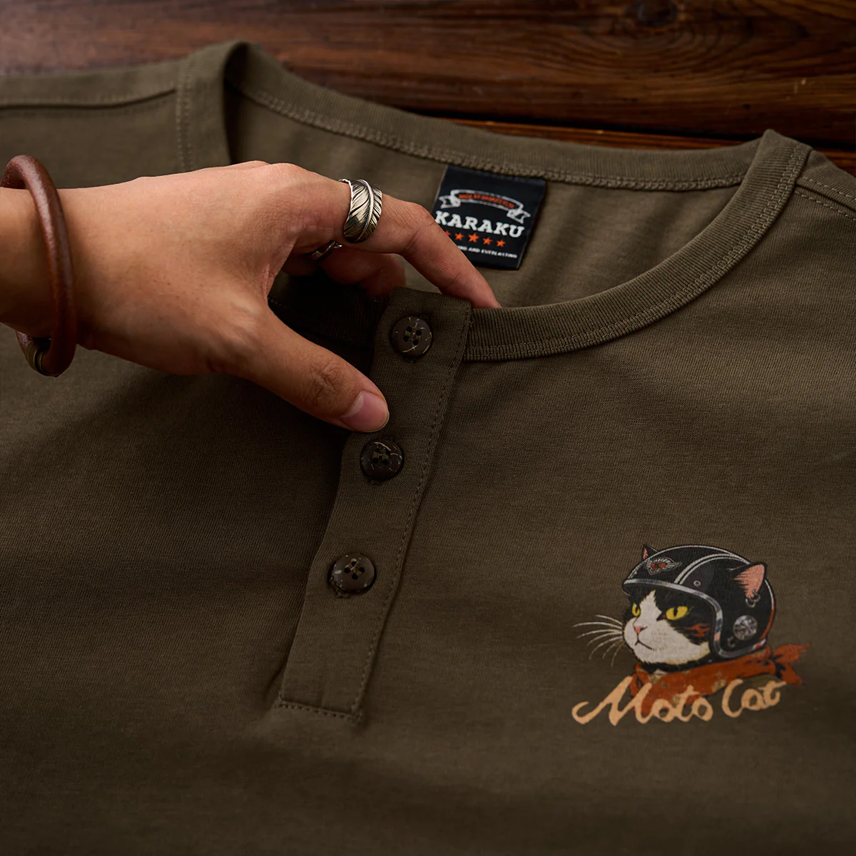 「ヘルメットを被った猫」プリントヘンリーネックTシャツ