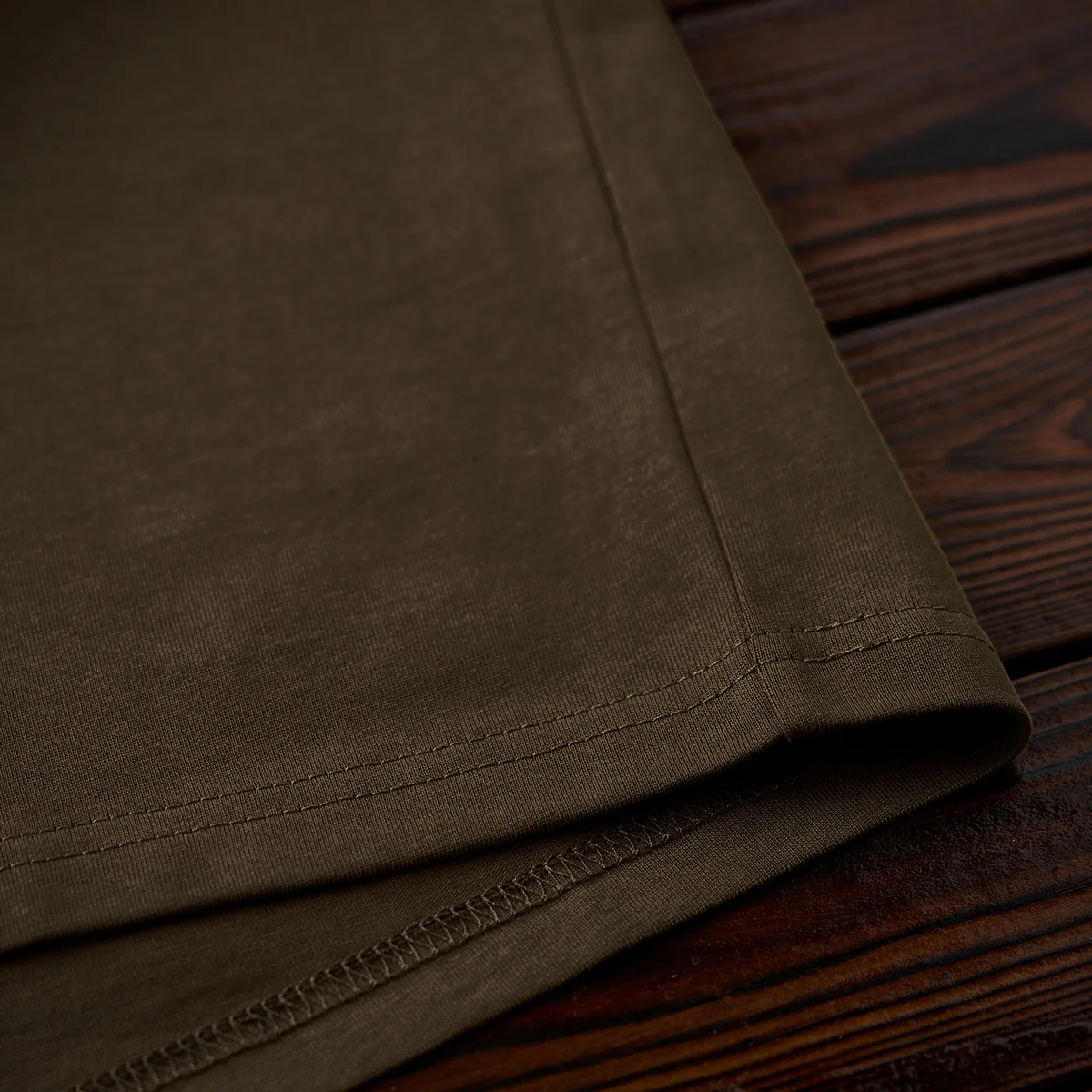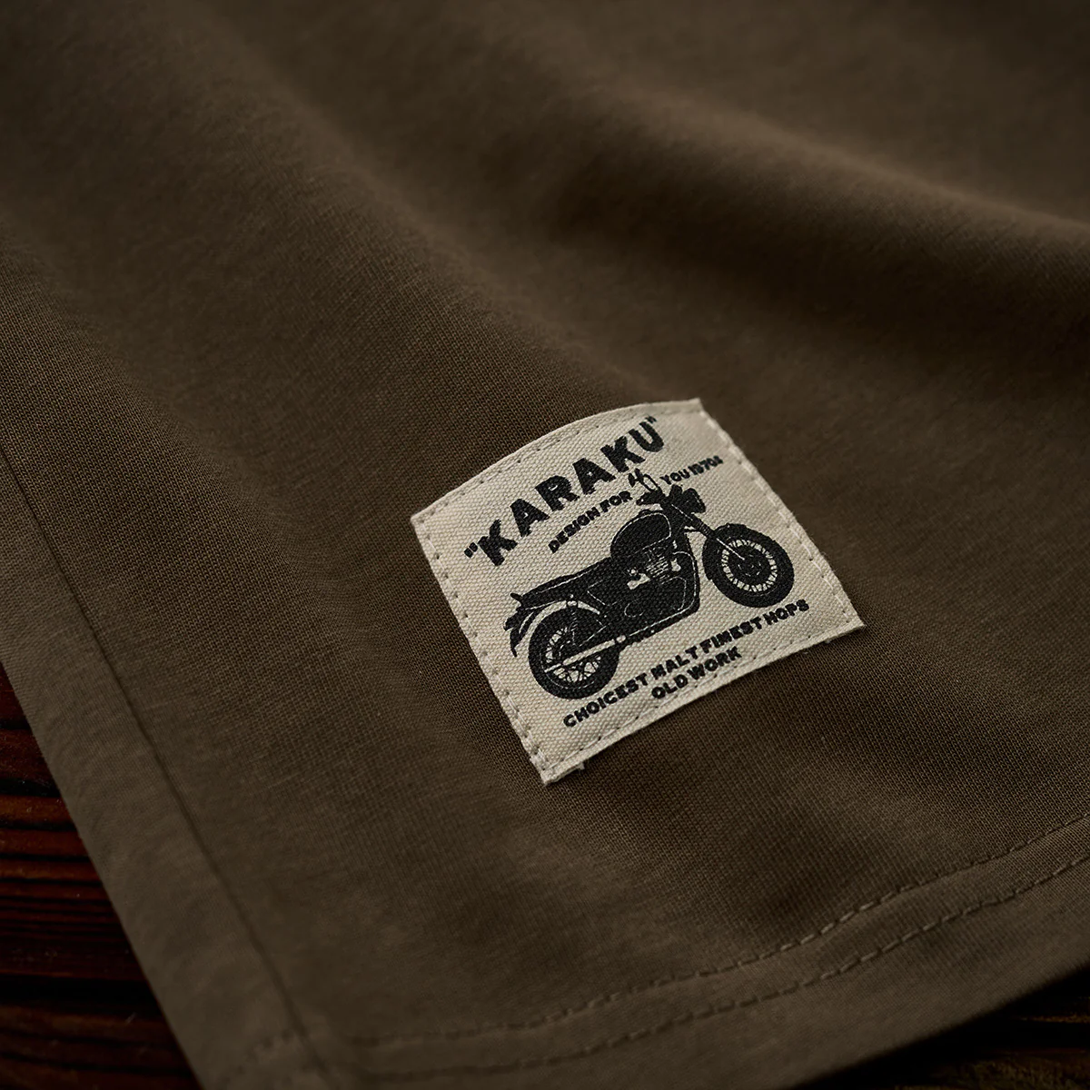ベースのアーミーグリーンに対して、プリントは黒、赤、オレンジなどのコントラストのある色を使用して、デザインを際立たせている。