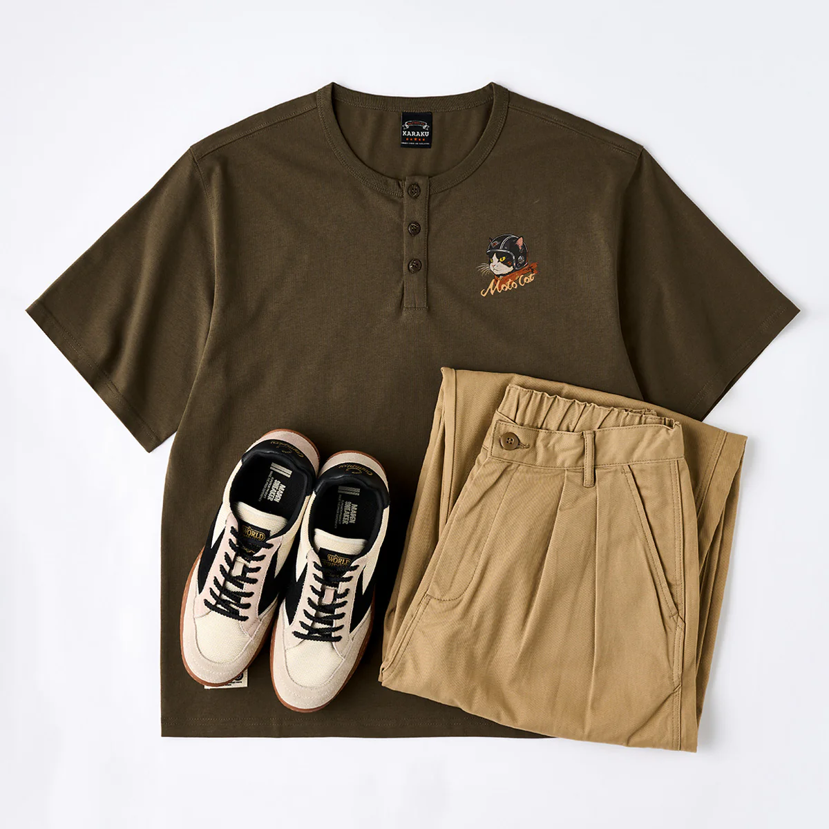 • 「ヘルメットを被った猫」プリントヘンリーネックTシャツ