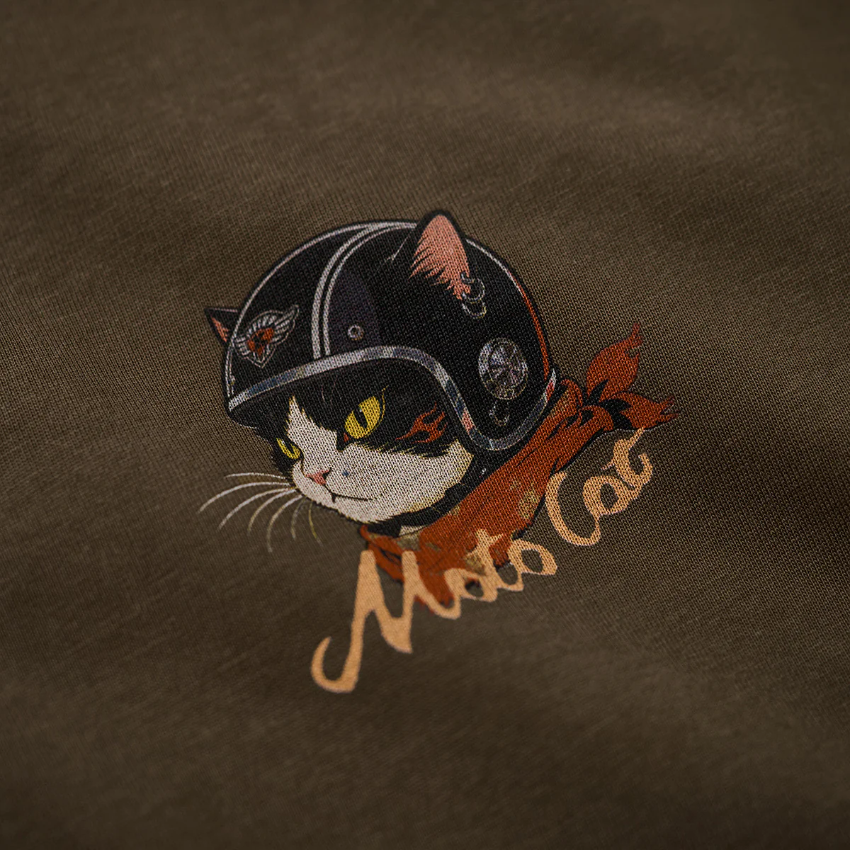 ヘルメットを被った猫が中心のデザインになって、猫の表情には自信と冒険心が感じられ、ユニークで親しみやすい印象を与え。バイカーやモーターカルチャーを意識した、スピード感や力強さを強調している。