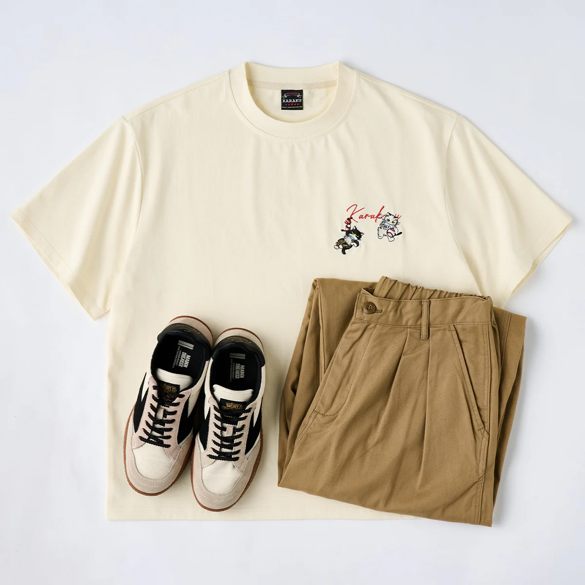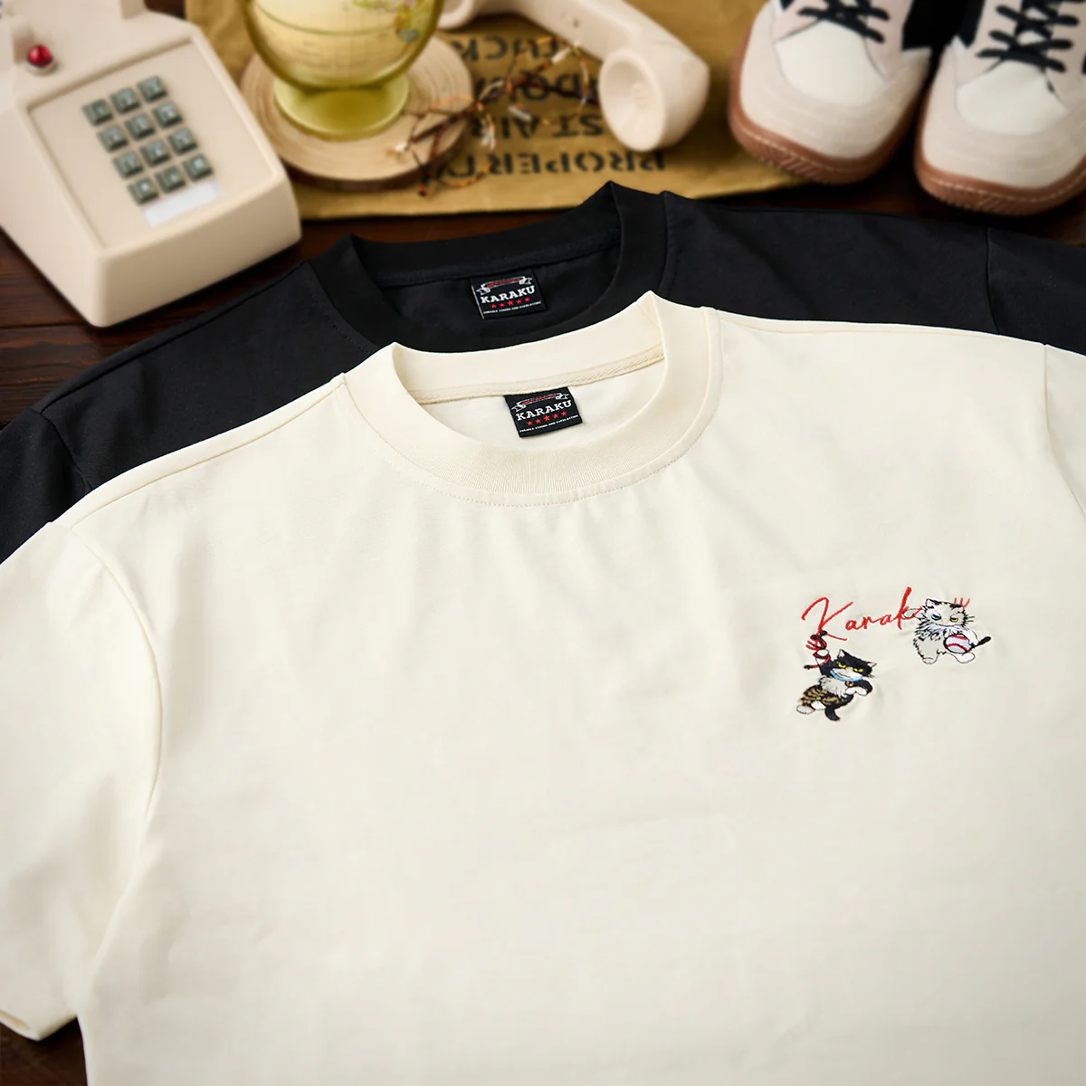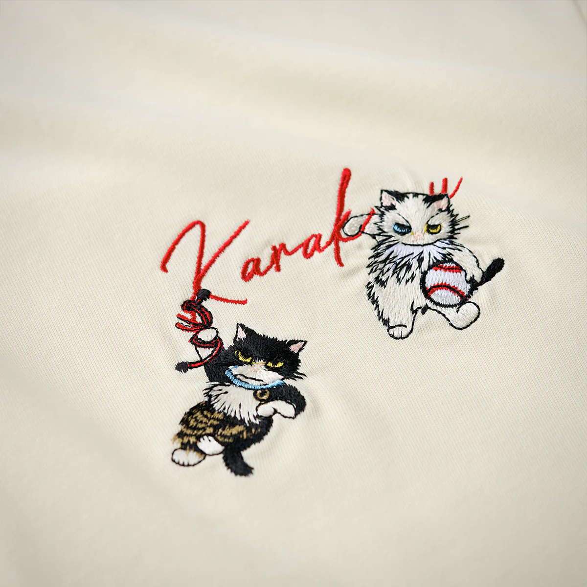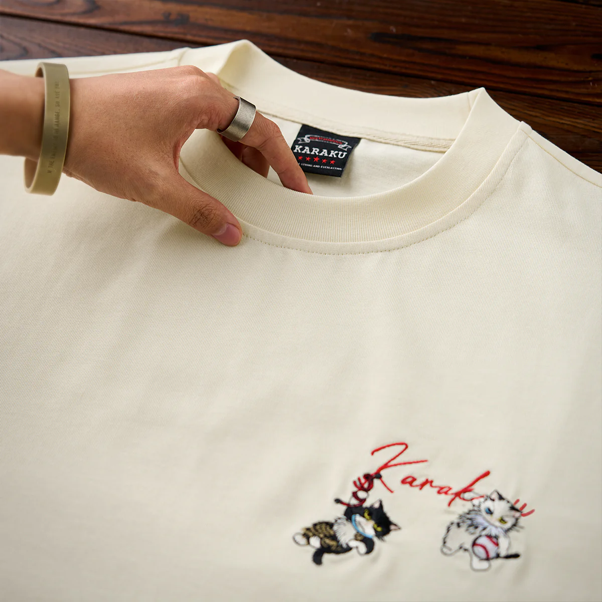 遊び心あふれる猫たちが主役のコットンTシャツが登場!胸元には、ブランド名「Karaku」にぶら下がる2匹の猫を刺繍で表現。黒猫はロープにぶら下がり、白猫は片手でしっかり掴まりながら、もう一方の手でちゃっかり野球ボールを抱える姿が愛らしいワンポイントに。猫たちの仕草の違いが個性を引き立て、見るたびにクスッと笑えるデザインです。裾には赤いタグのディテール付きで、細部にまでこだわった一枚。シンプルながらも個性を演出したい日にぴったりのTシャツです。