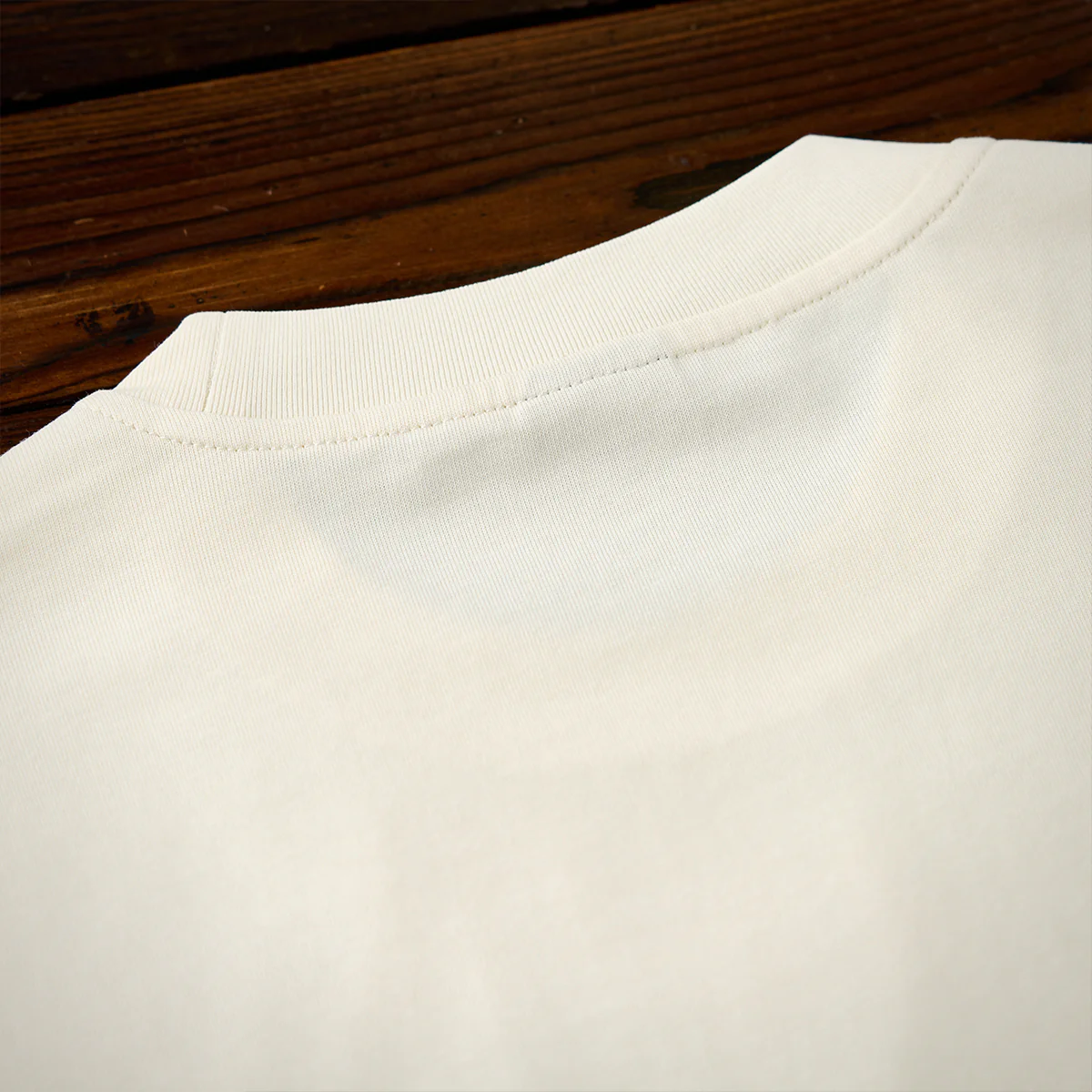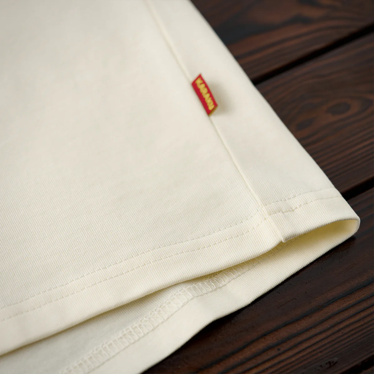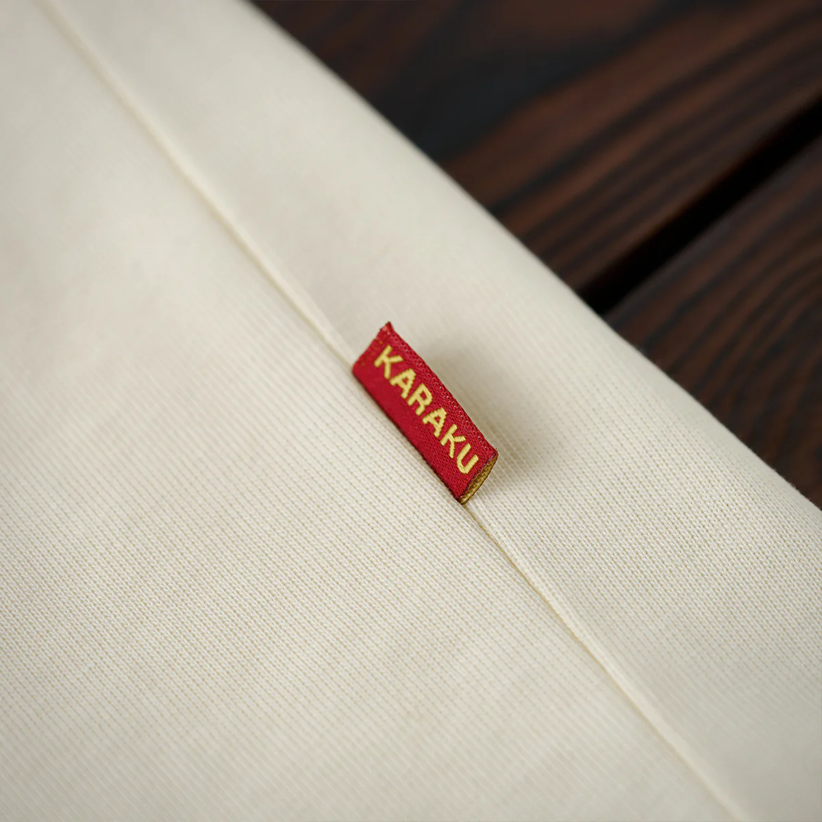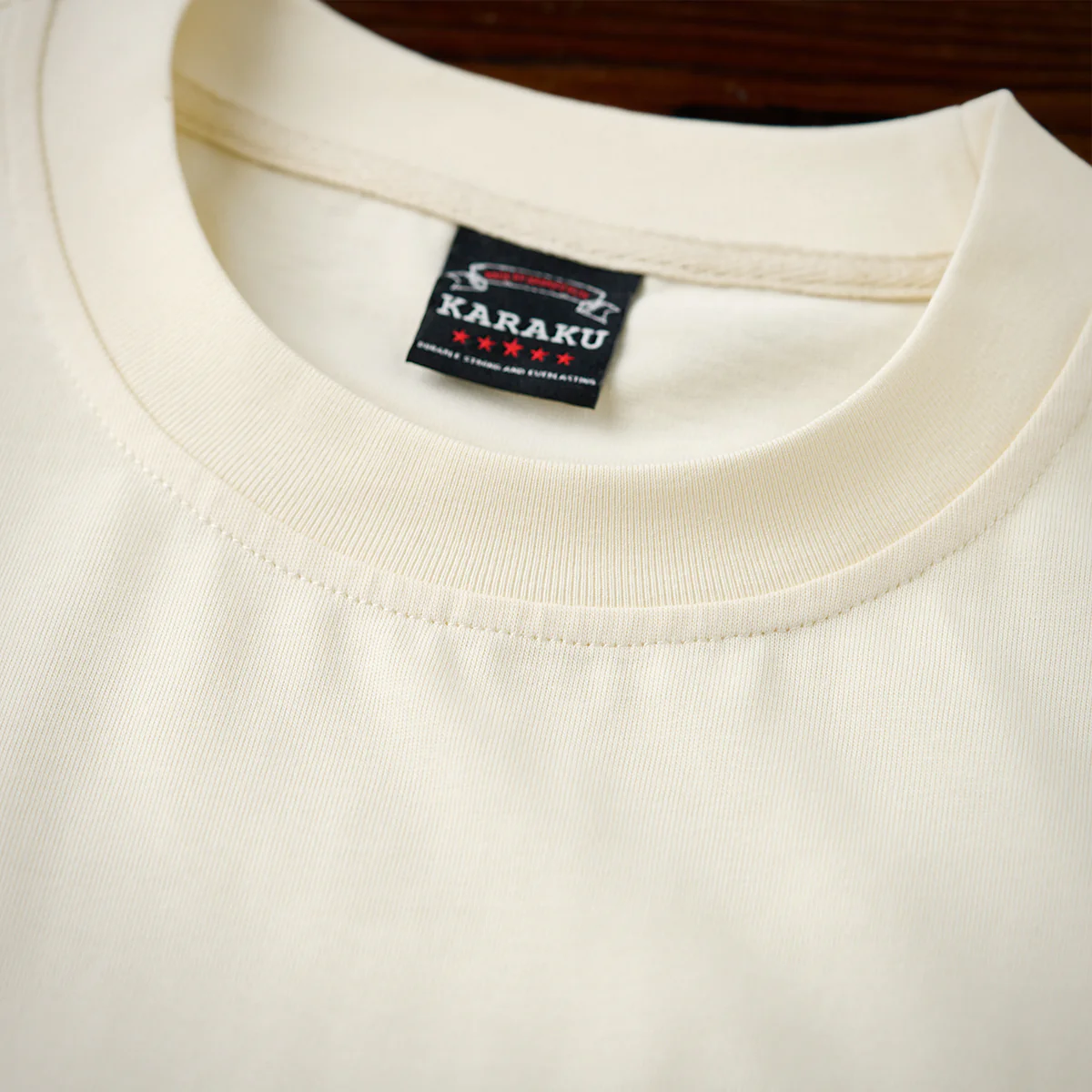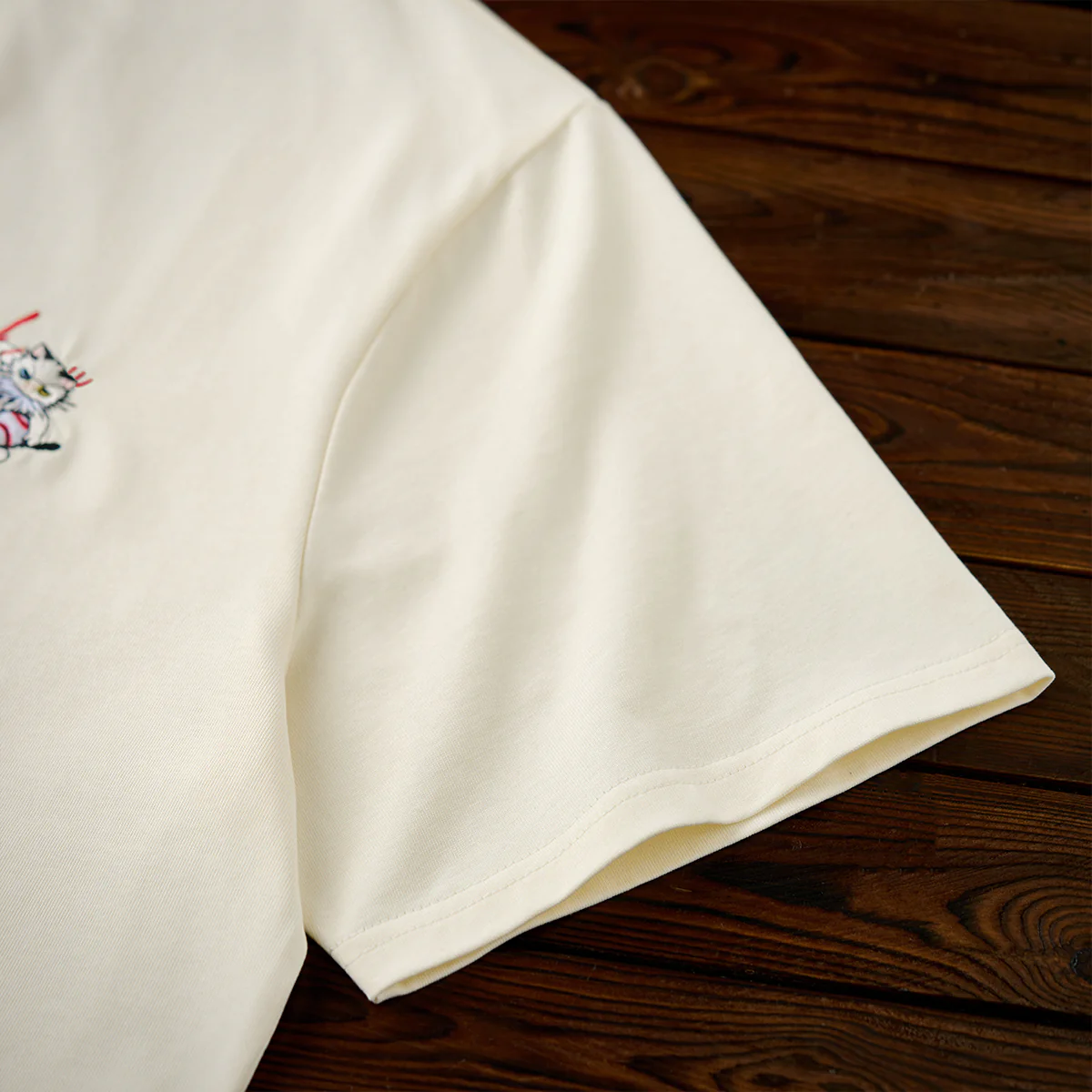 遊び心あふれる猫たちが主役のコットンTシャツが登場!胸元には、ブランド名「Karaku」にぶら下がる2匹の猫を刺繍で表現。黒猫はロープにぶら下がり、白猫は片手でしっかり掴まりながら、もう一方の手でちゃっかり野球ボールを抱える姿が愛らしいワンポイントに。猫たちの仕草の違いが個性を引き立て、見るたびにクスッと笑えるデザインです。裾には赤いタグのディテール付きで、細部にまでこだわった一枚。シンプルながらも個性を演出したい日にぴったりのTシャツです。