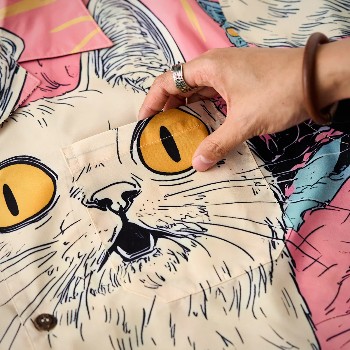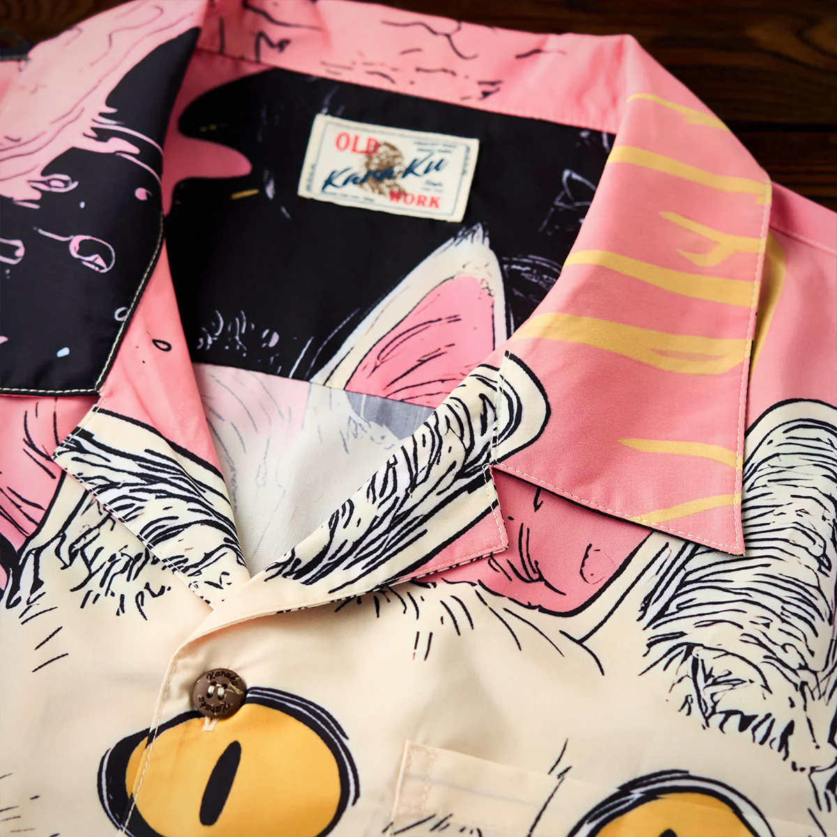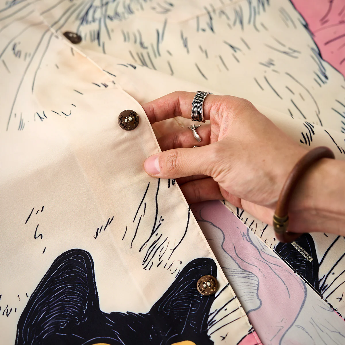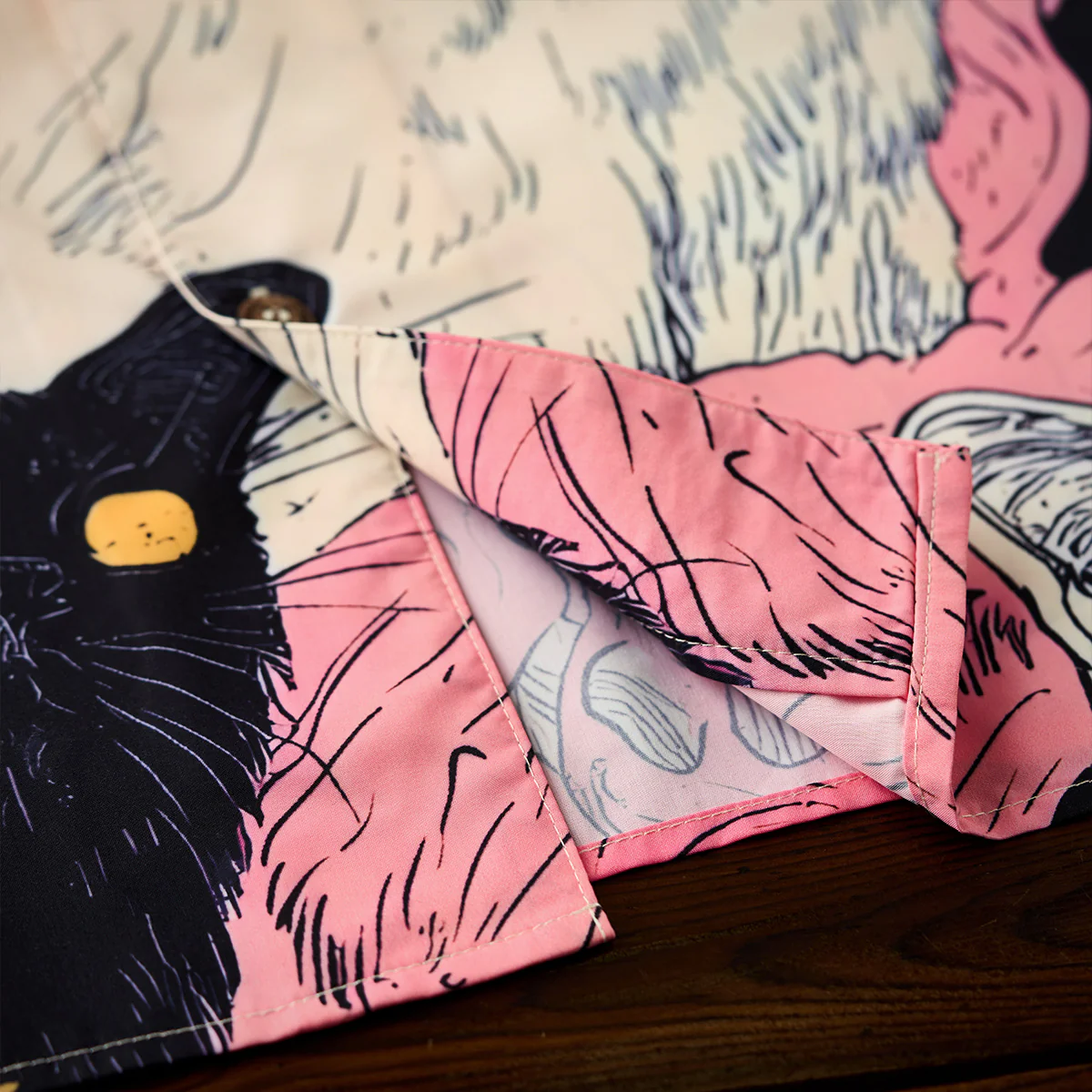 春の軽やかな気分にぴったりな、テンセルライクのアロハシャツ。ひだまりのようなピンクに包まれて、猫は今日も夢を見る。空を見上げて雲に乗る。前と後ろ、それぞれに描かれたストーリーが、ひとつの空想宇宙をつくりあげる。フロントとバックに描かれたグラフィックは、それぞれ異なる物語を紡ぎながらも、全体として調和のとれた仕上がりに。ふんわりとしたピンクを基調にしたカラーリングが、春らしい柔らかな印象を演出します。一枚で主役になる、遊び心と季節感を兼ね備えた一着です。