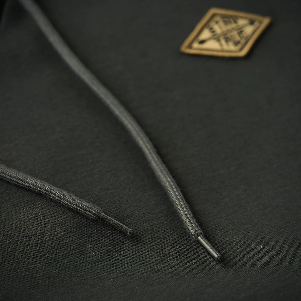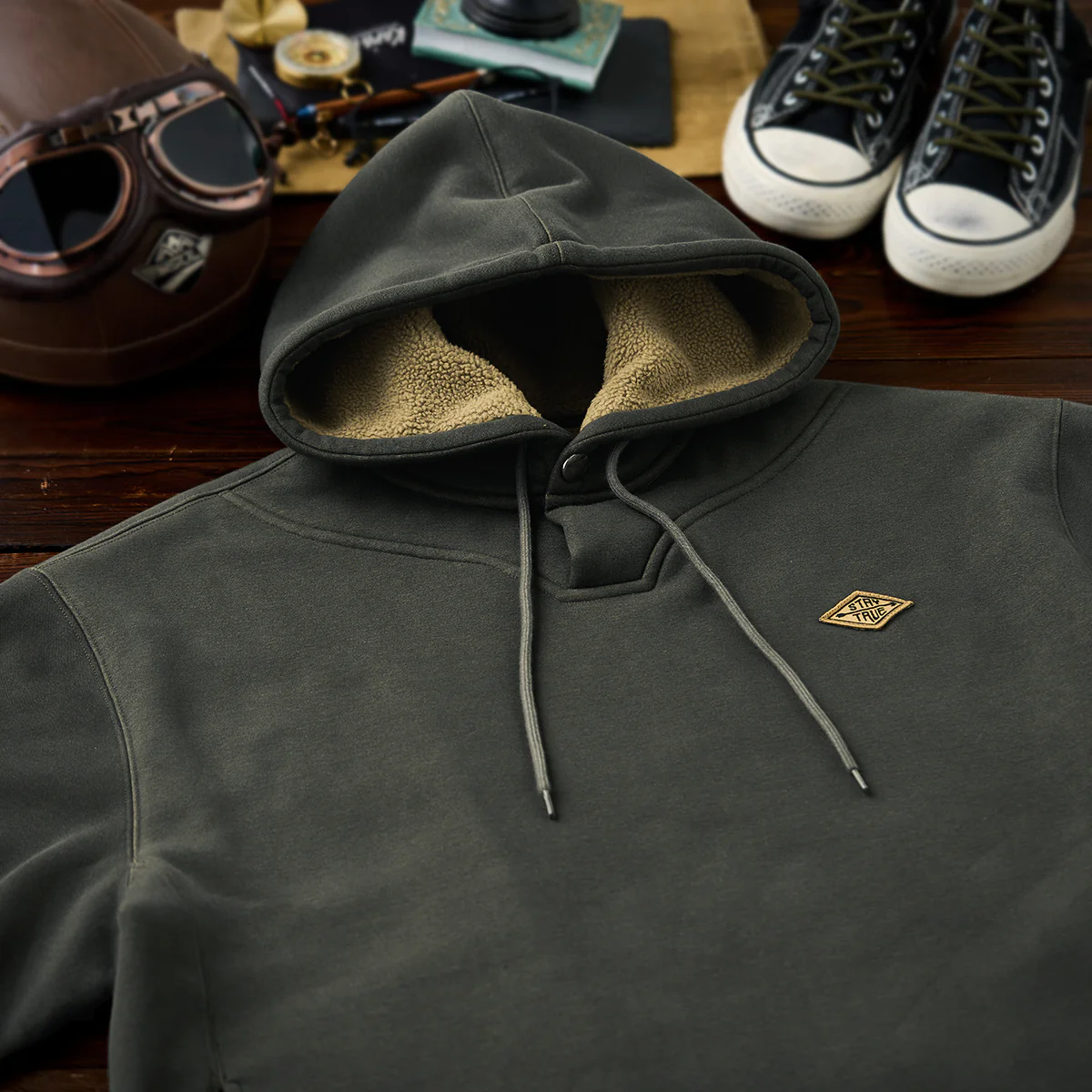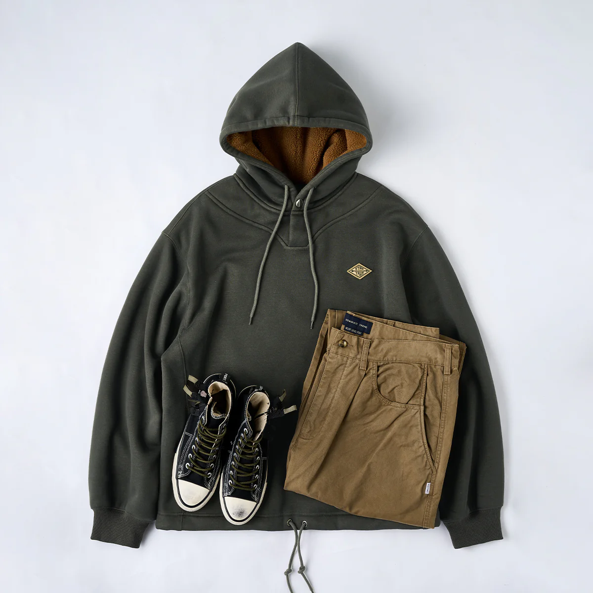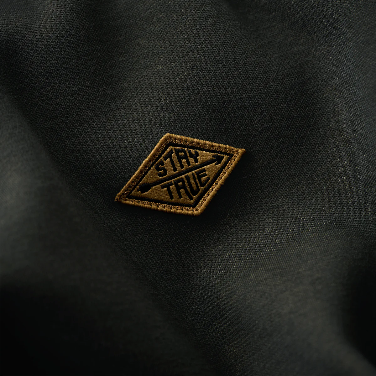 左胸に「STAY TRUE」刺繍ワッペンが付いて、シンプルながらもユニークなポイントになって、ワッペンの黄色が全体のダークなカラーに対してアクセントとなり、目を引く。