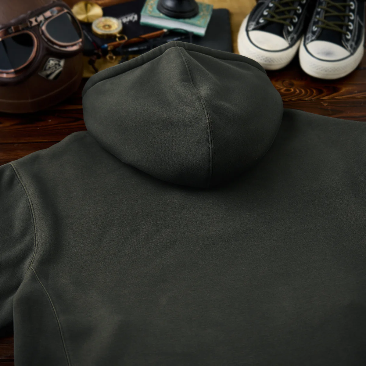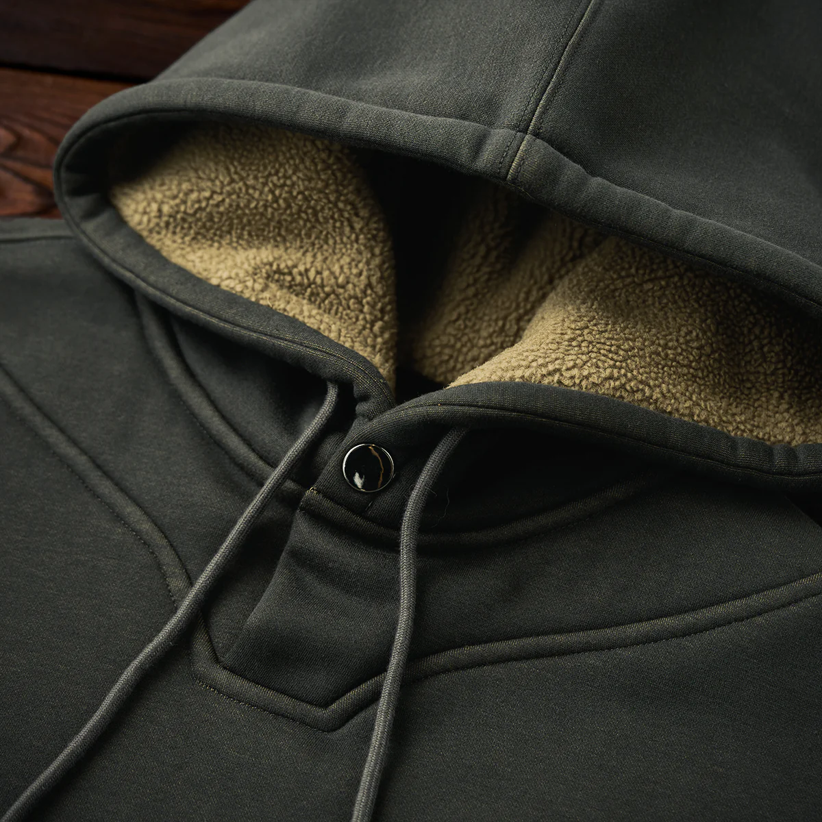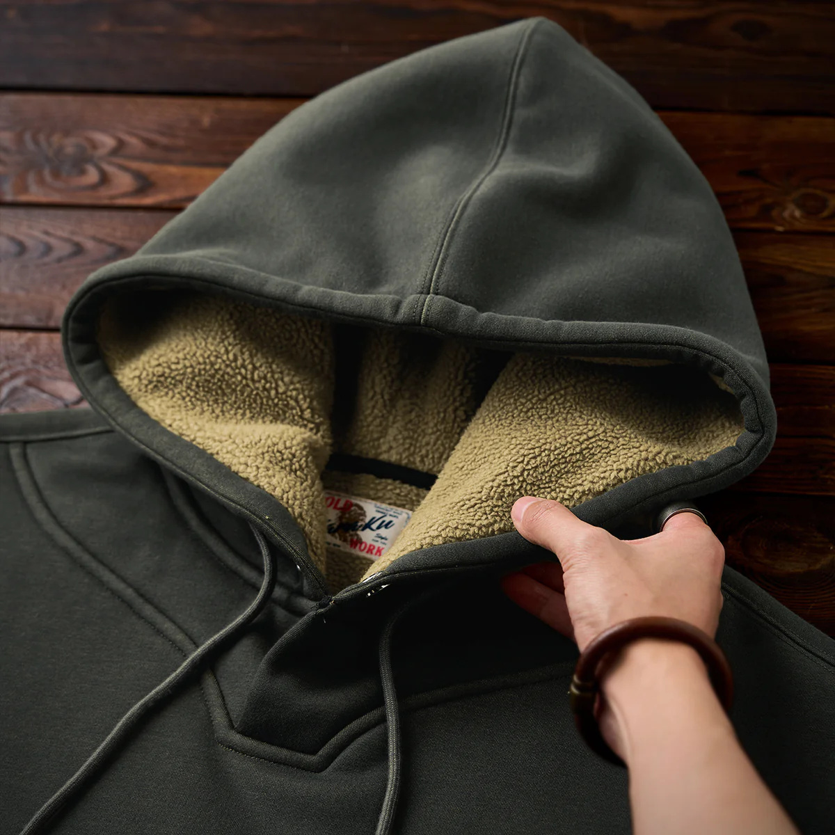 フードがあることで、よりカジュアルな印象を強調し、特にアウトドアやアクティブなシーンでの利用に適す。フード部分にあるドローストリングで、フィット感を調整できるため、風の強い日でも安心。