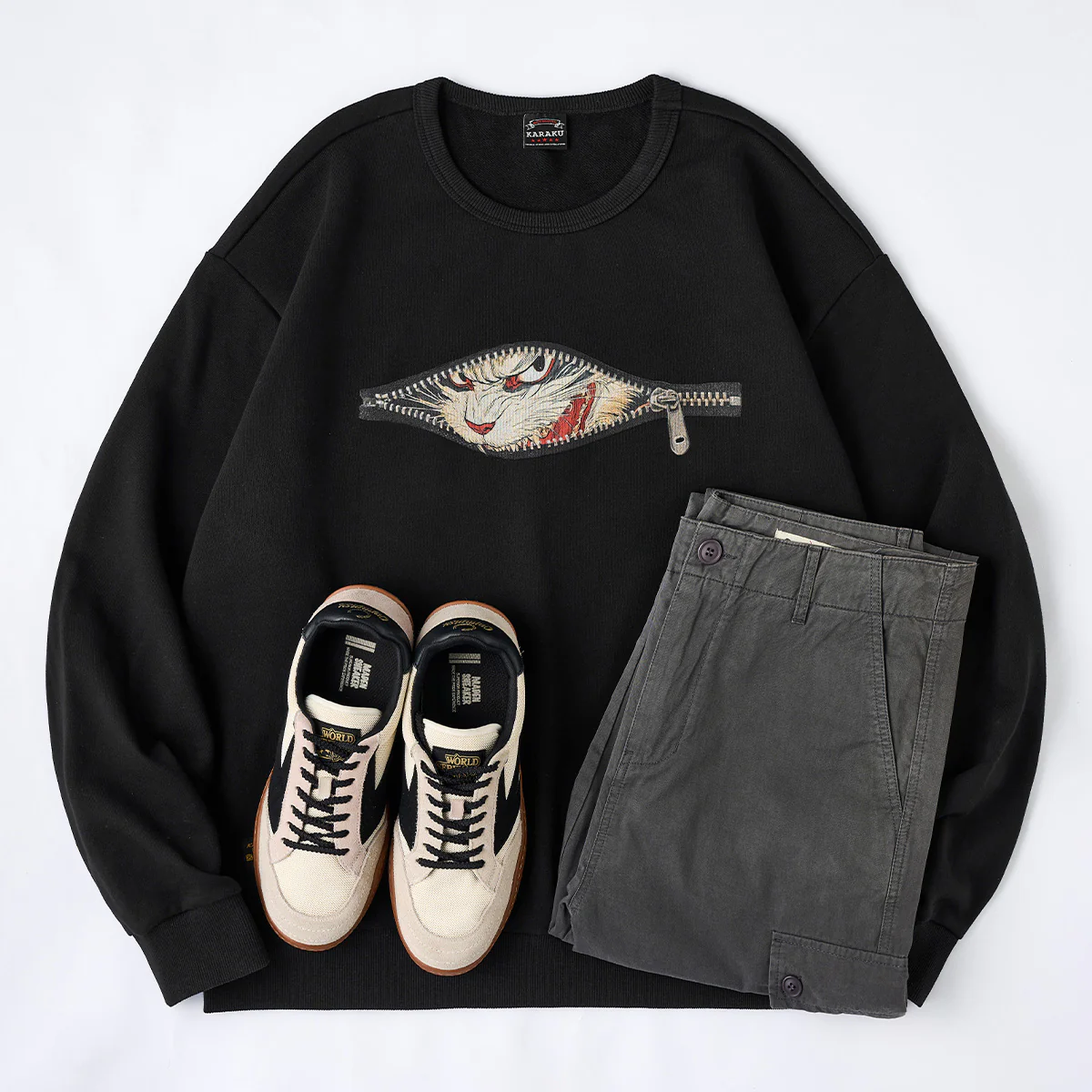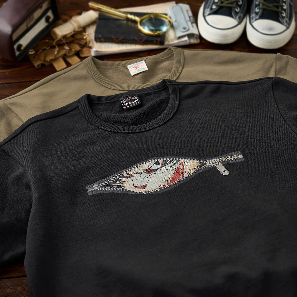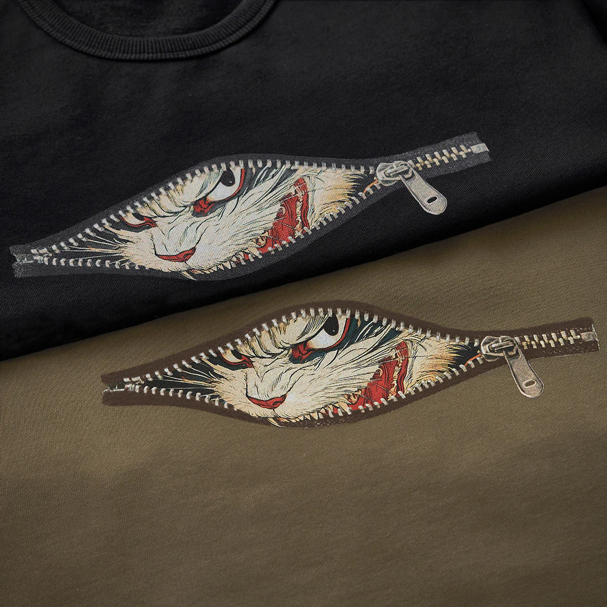 • 「クロスジップの隙間から覗く化け猫」浮世絵風プリント入りスウェット