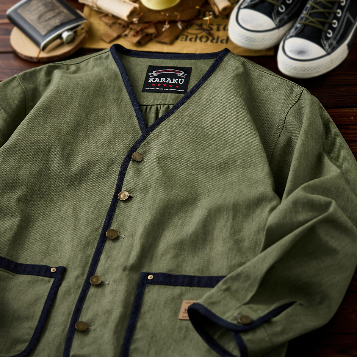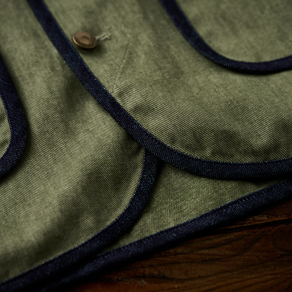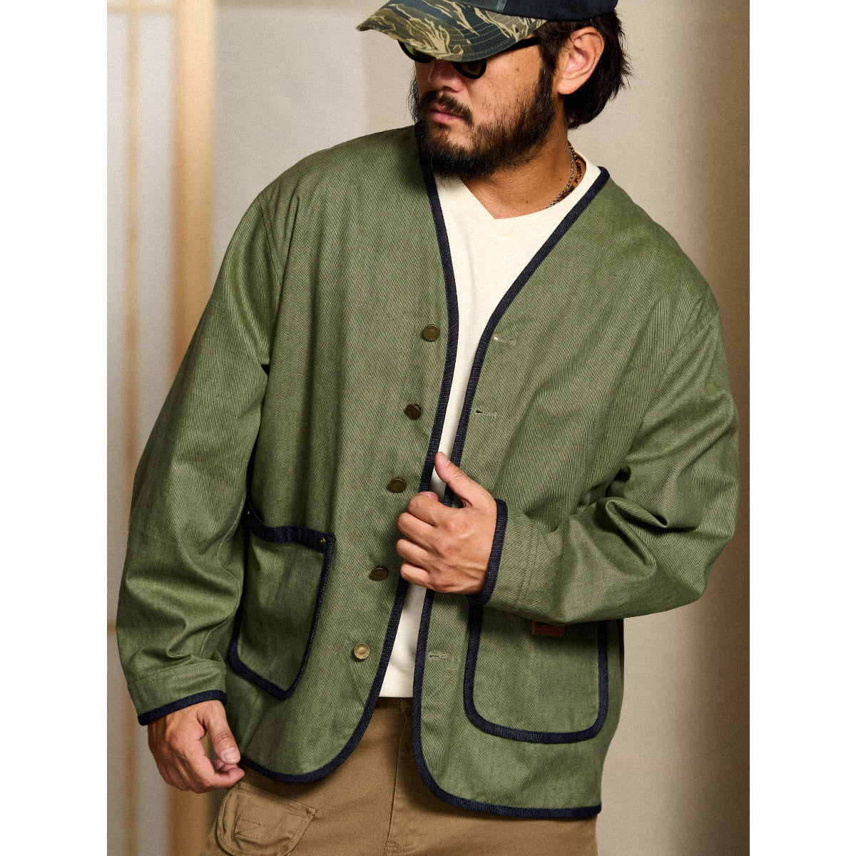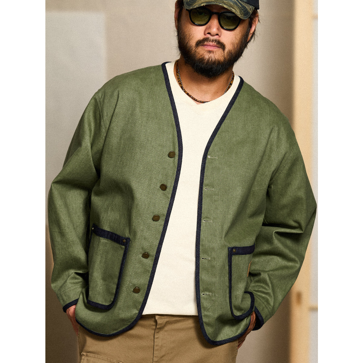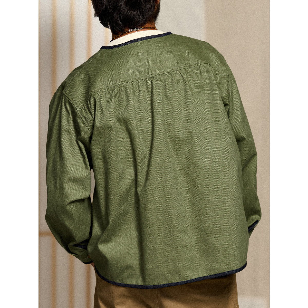 襟がない「ノーカラー」デザインは、シンプルさとモダンな印象を強調。全体の縁に施された濃紺のデニムパイピングが、シルエットを引き締める役割を果たしている。