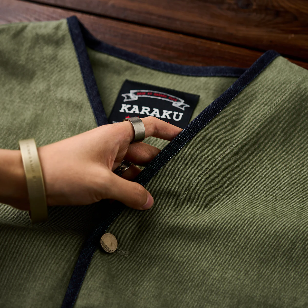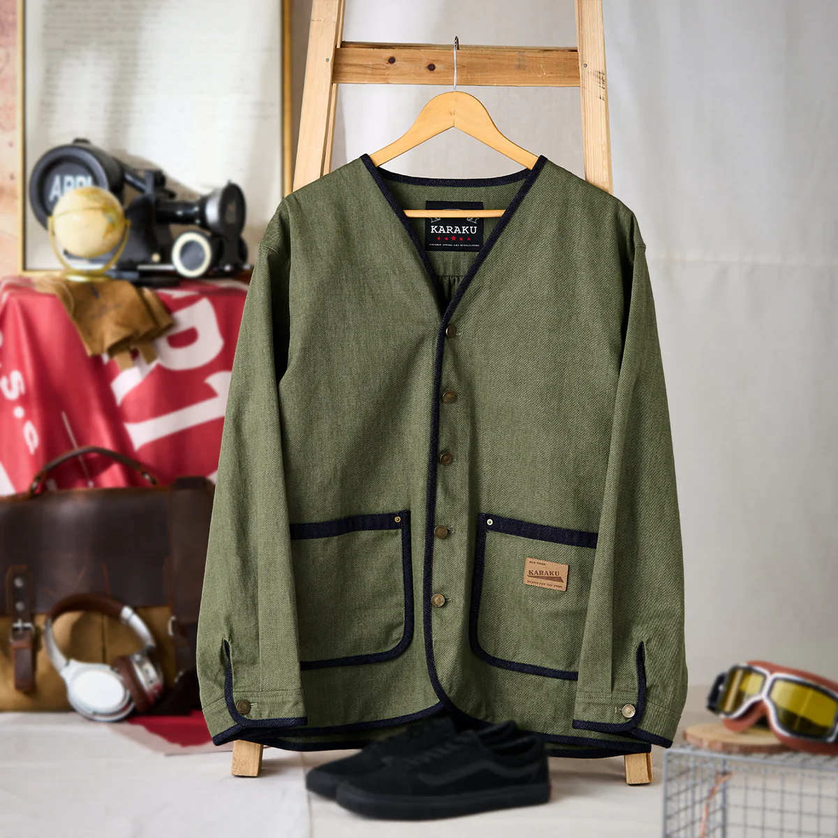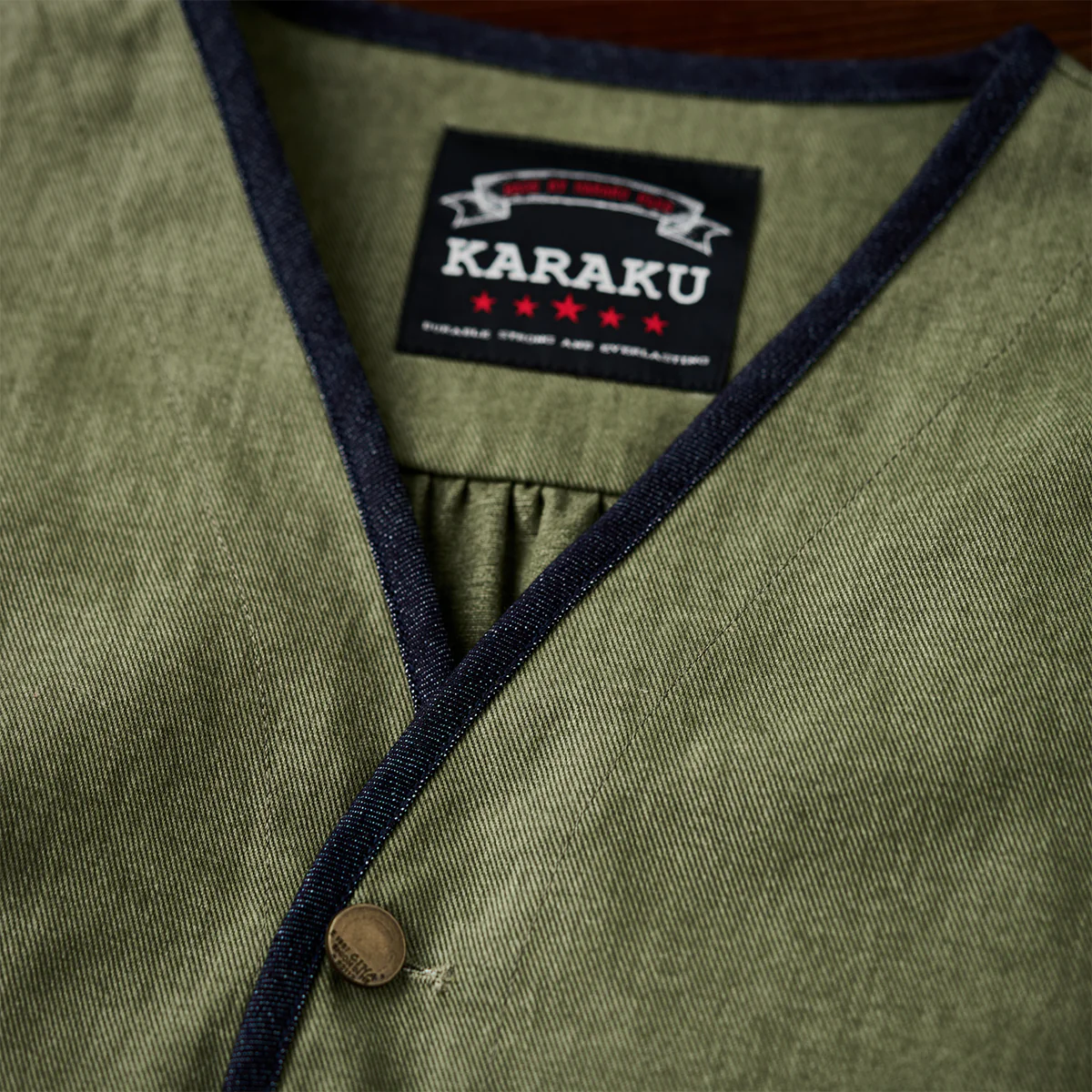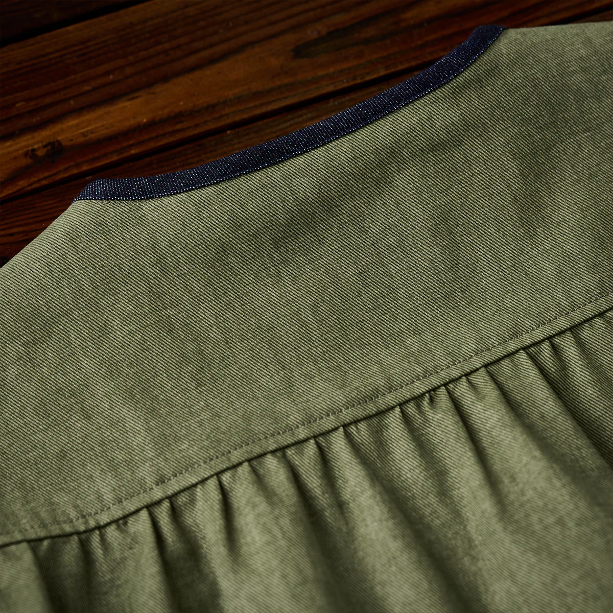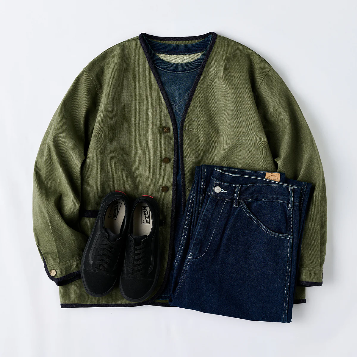 襟がない「ノーカラー」デザインは、シンプルさとモダンな印象を強調。全体の縁に施された濃紺のデニムパイピングが、シルエットを引き締める役割を果たしている。