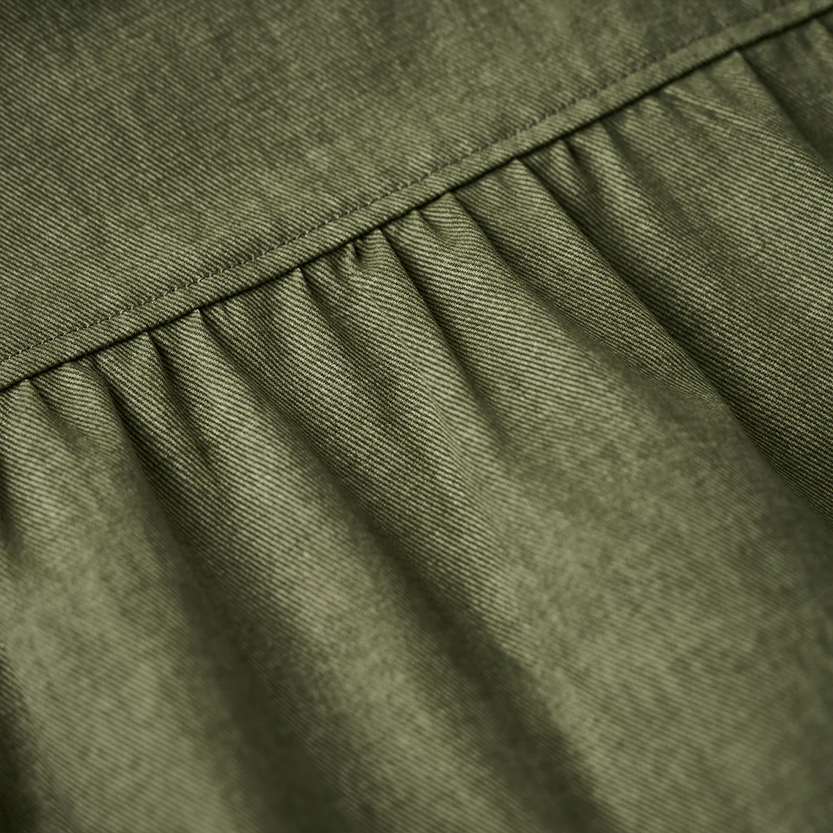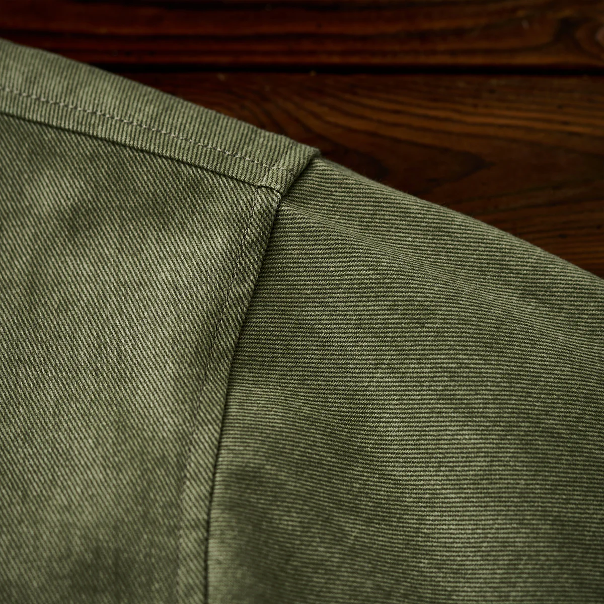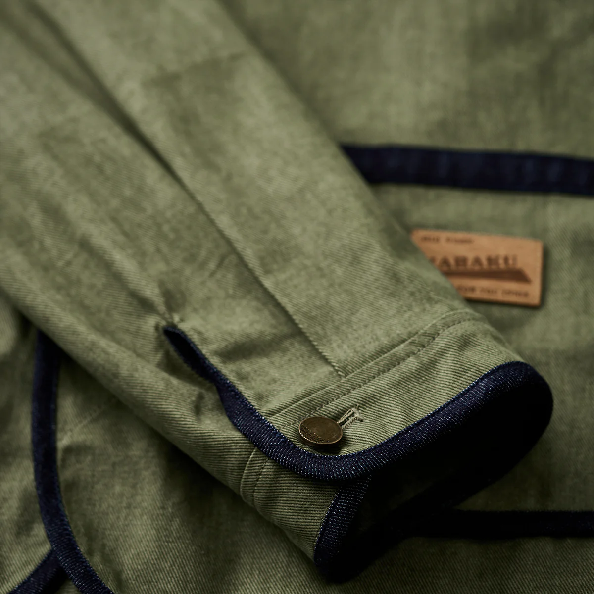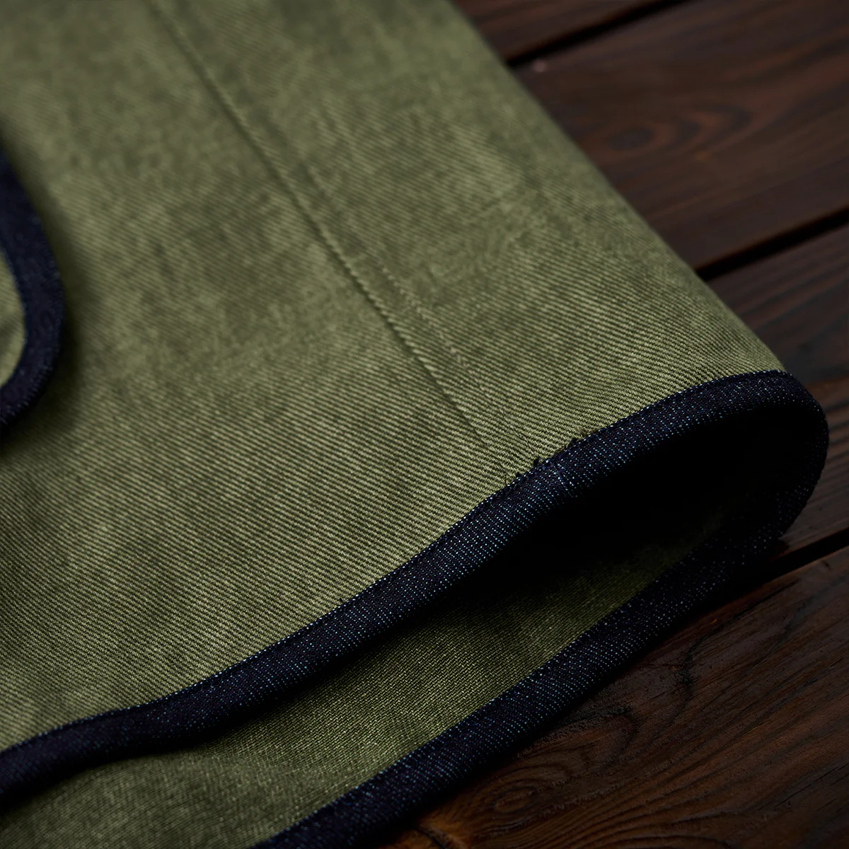 コットン素材は通気性が良く、柔らかい肌触りが特徴。デニムパイピングの硬めの質感が、コットンの柔らかさと対比を生み、全体のデザインを引き締め。