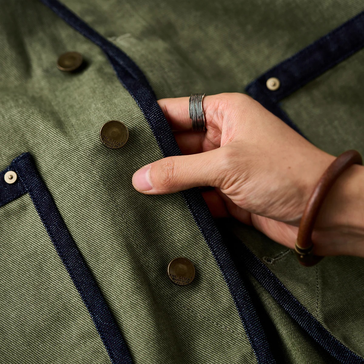 ブラスカラーのメタルボタンが、視覚的なアクセントとして機能。ボタンの配置はフロント中央に一直線に並び、シンメトリーなデザインを強調。