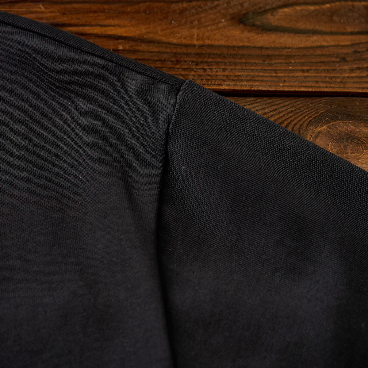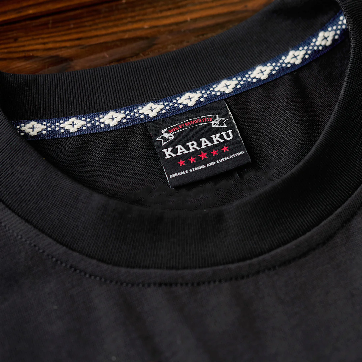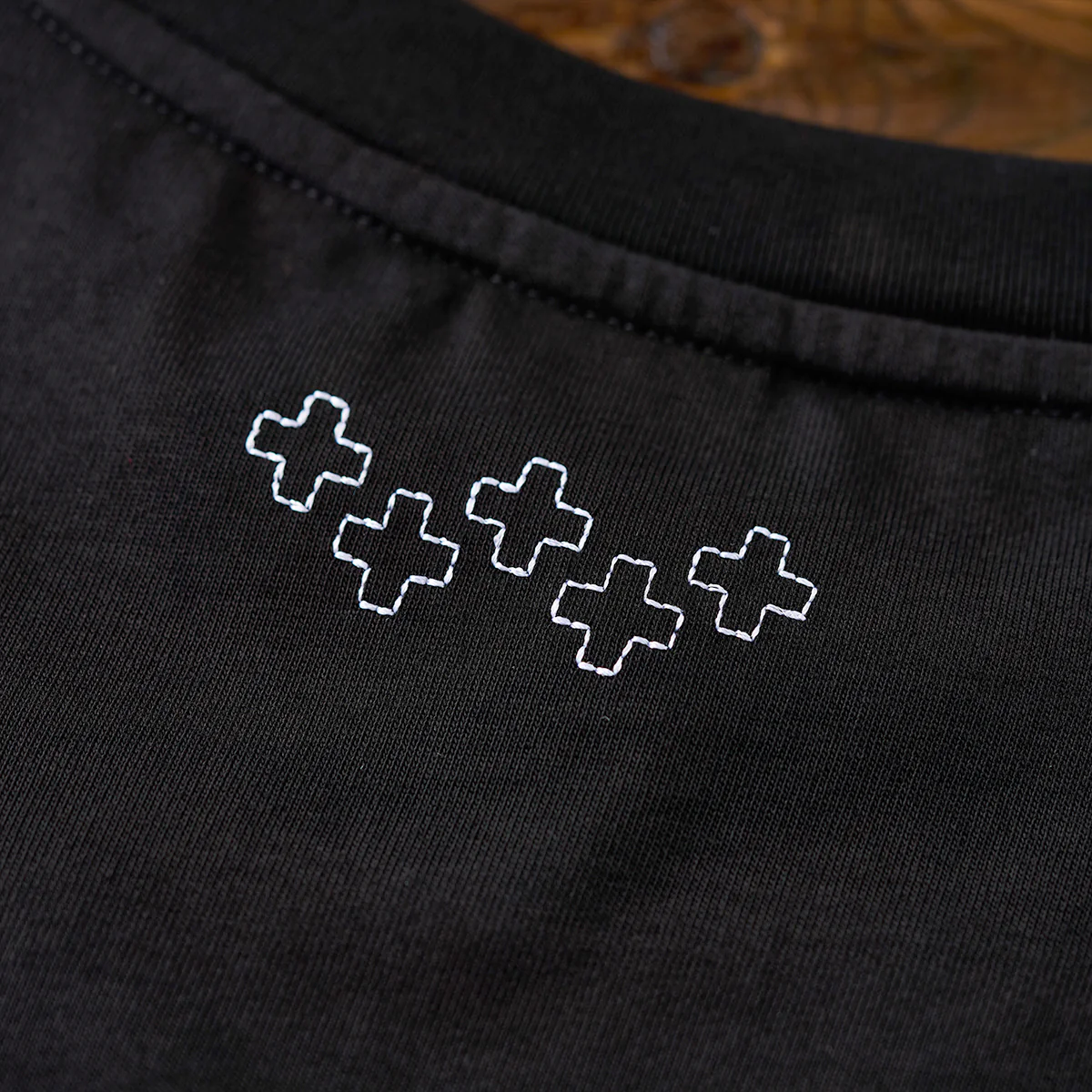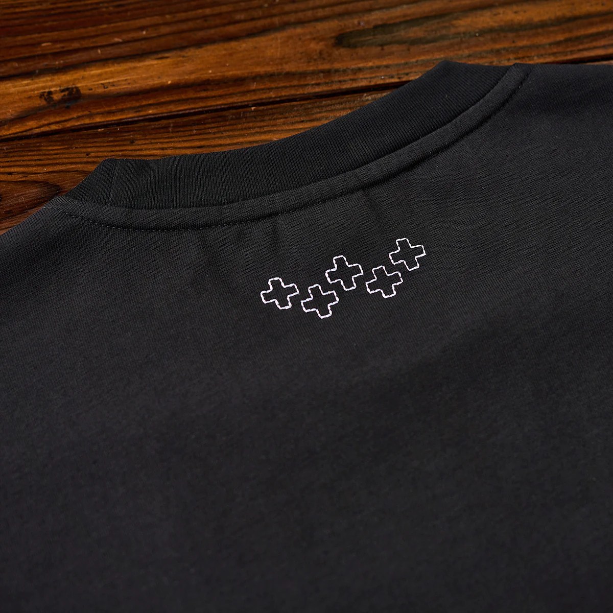 首の後ろに小さな十字形刺繍が配置されて、ミニマルで控えめながらも細部にこだわったデザインになっている。