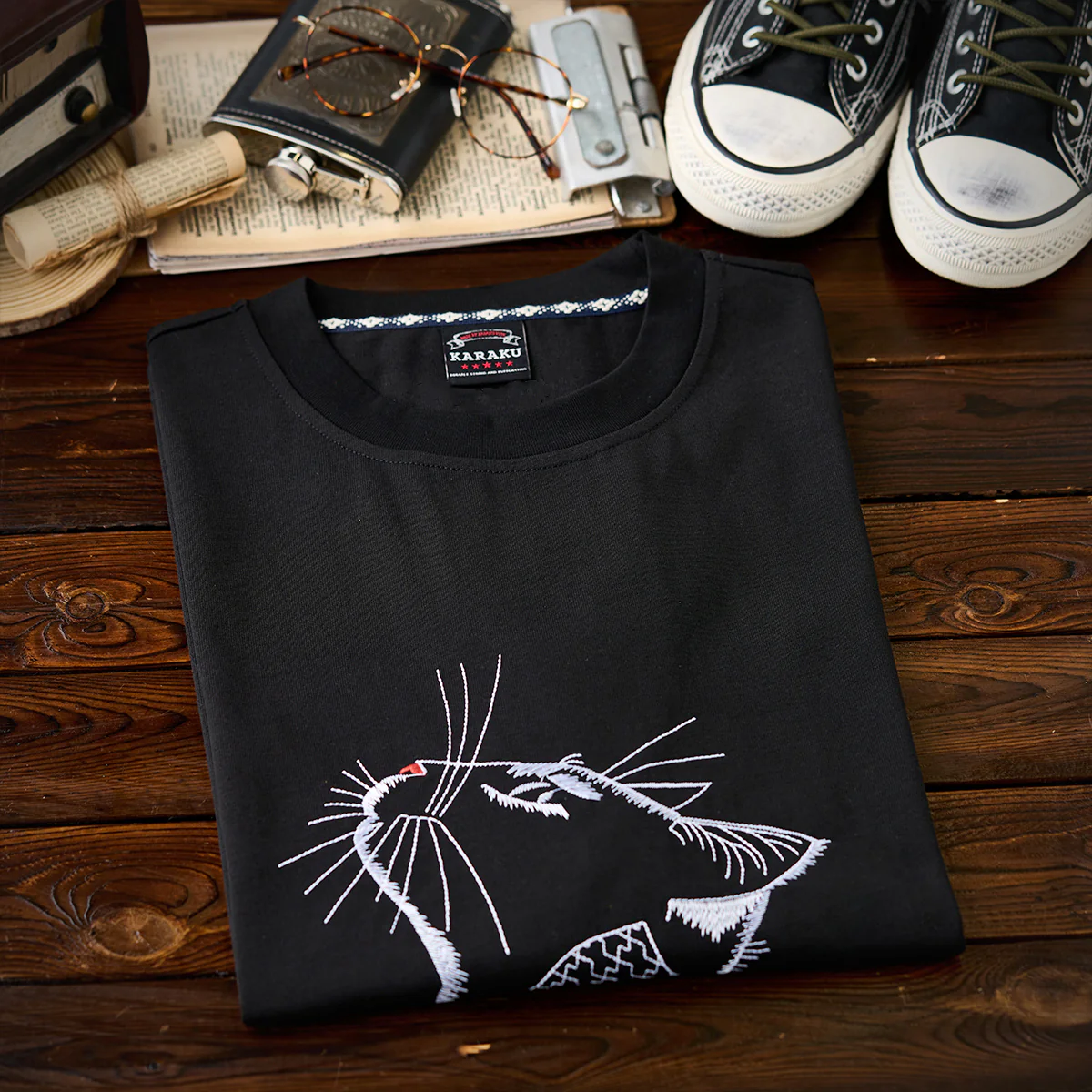フロントには猫が上を向いている姿が描かれている。猫の輪郭は刺し子風のラインで描かれ、非常に繊細でアーティスティックです。直線的な縫い目によって猫の輪郭やひげ、耳などのディテールが強調されている。