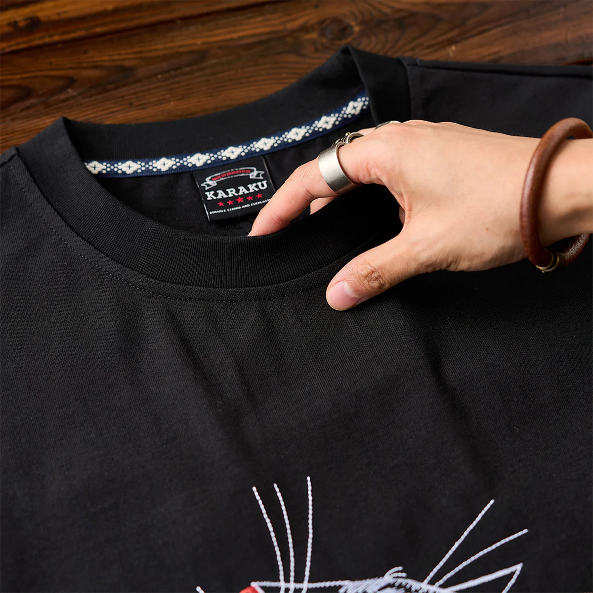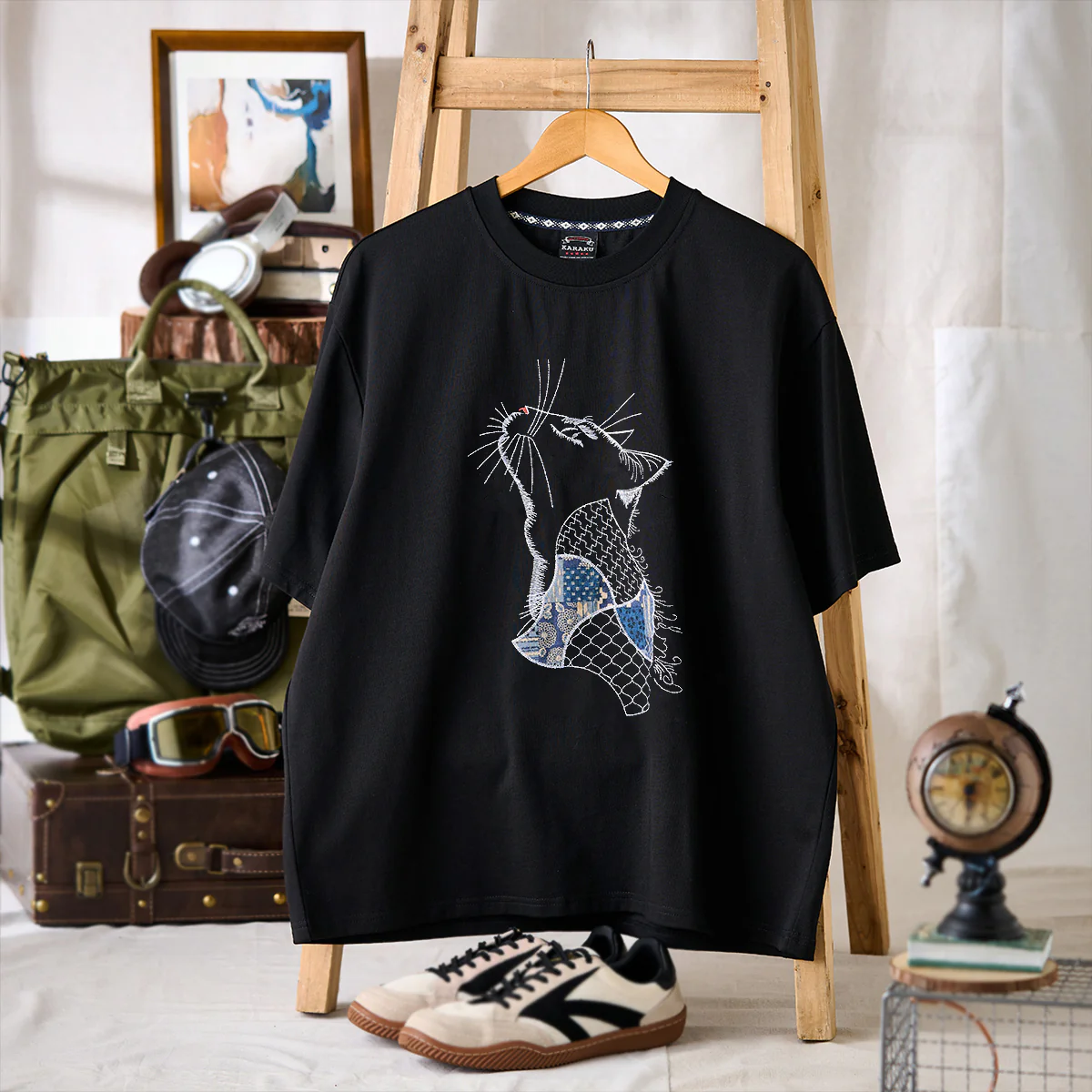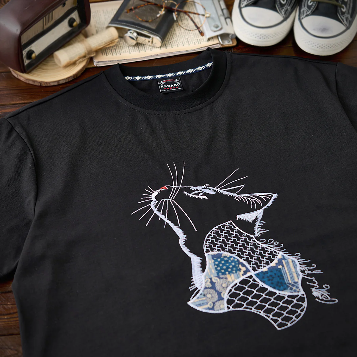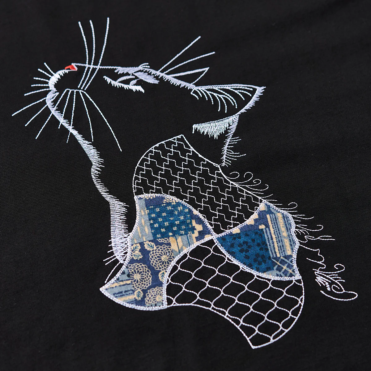 猫の胴体部分に見られる青系の古布パッチワークは、視覚的にもテクスチャーの変化を与え、Tシャツ全体に「動き」や「奥行き」を生み出す。