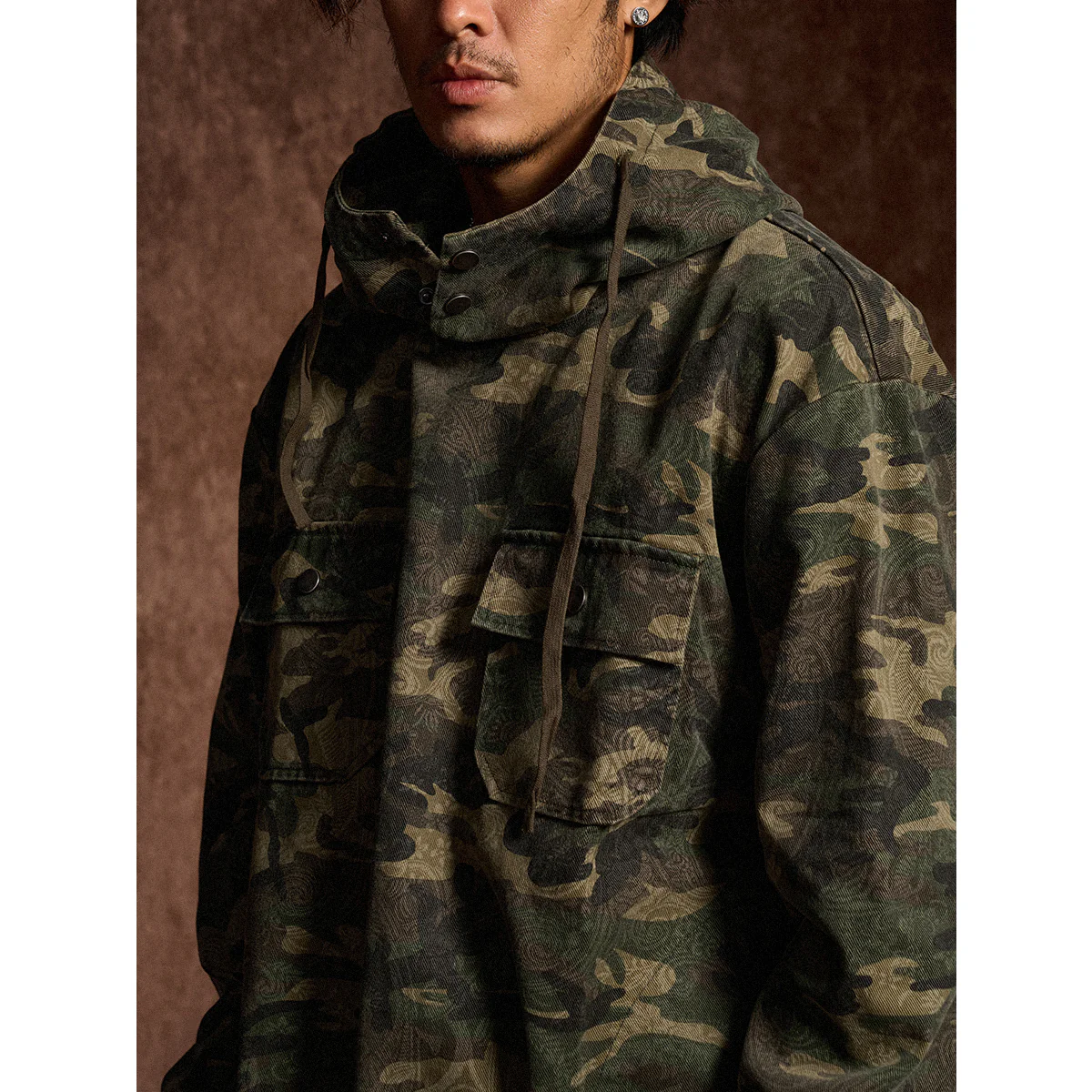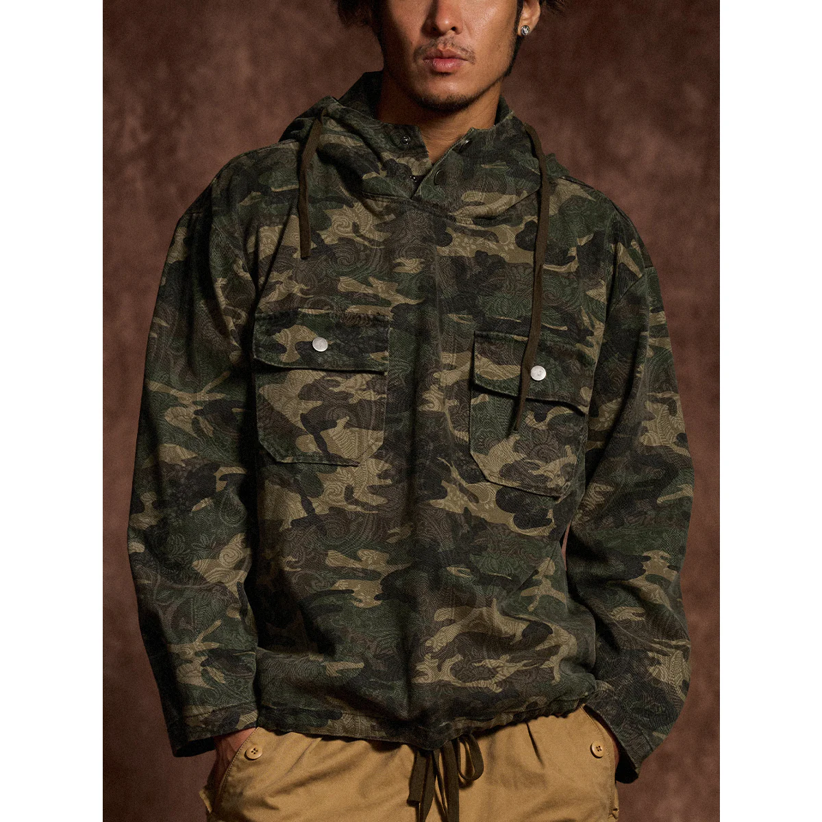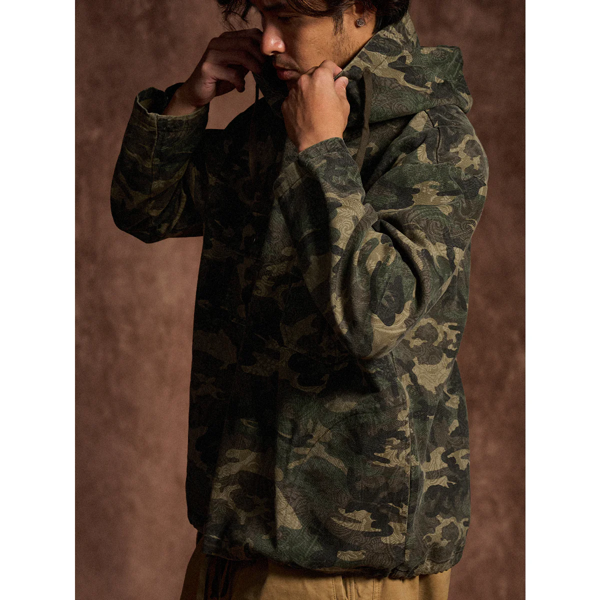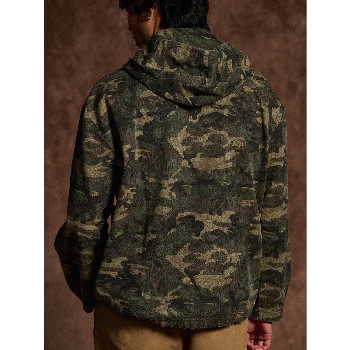 迷彩柄を再解釈し、クラシックなワークウェアスタイルに落とし込んだフード付きプルオーバー。胸元にはフラップ付きポケットを2つ配置し、ワーク感を強調したデザインが特徴です。迷彩柄にはペイズリー柄を重ね合わせた独特のテクスチャが施され、細部まで洗練されたデザインに仕上げています。製品染めと酵素洗い加工により、ヴィンテージライクな風合いが加わり、一点物のような味わい深さが魅力です。アウトドアからストリートまで、幅広いスタイルにフィットする、機能性とファッション性を兼ね備えた一着です。