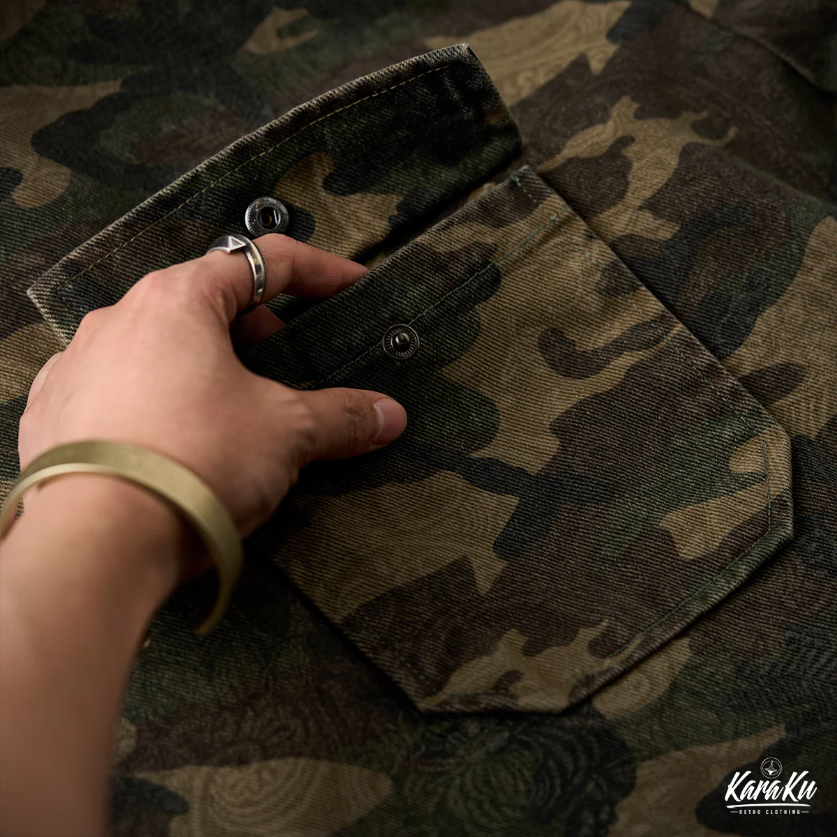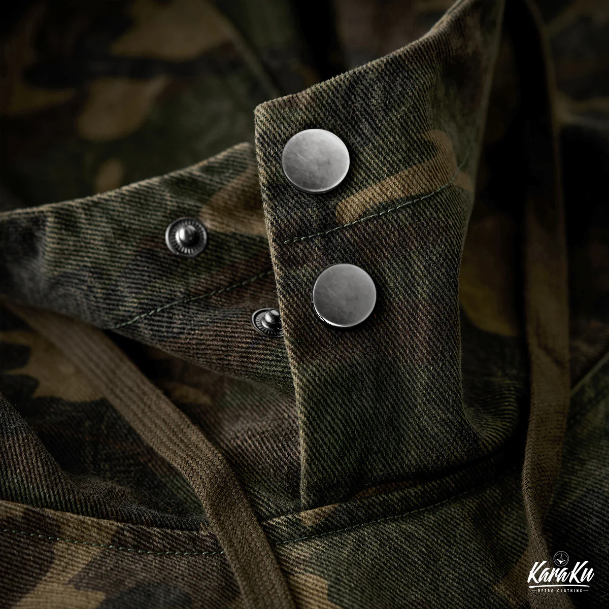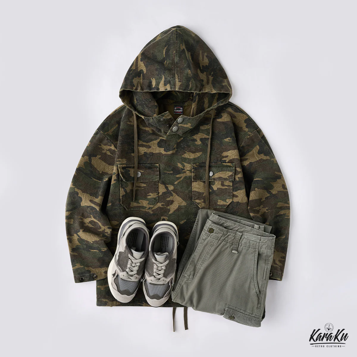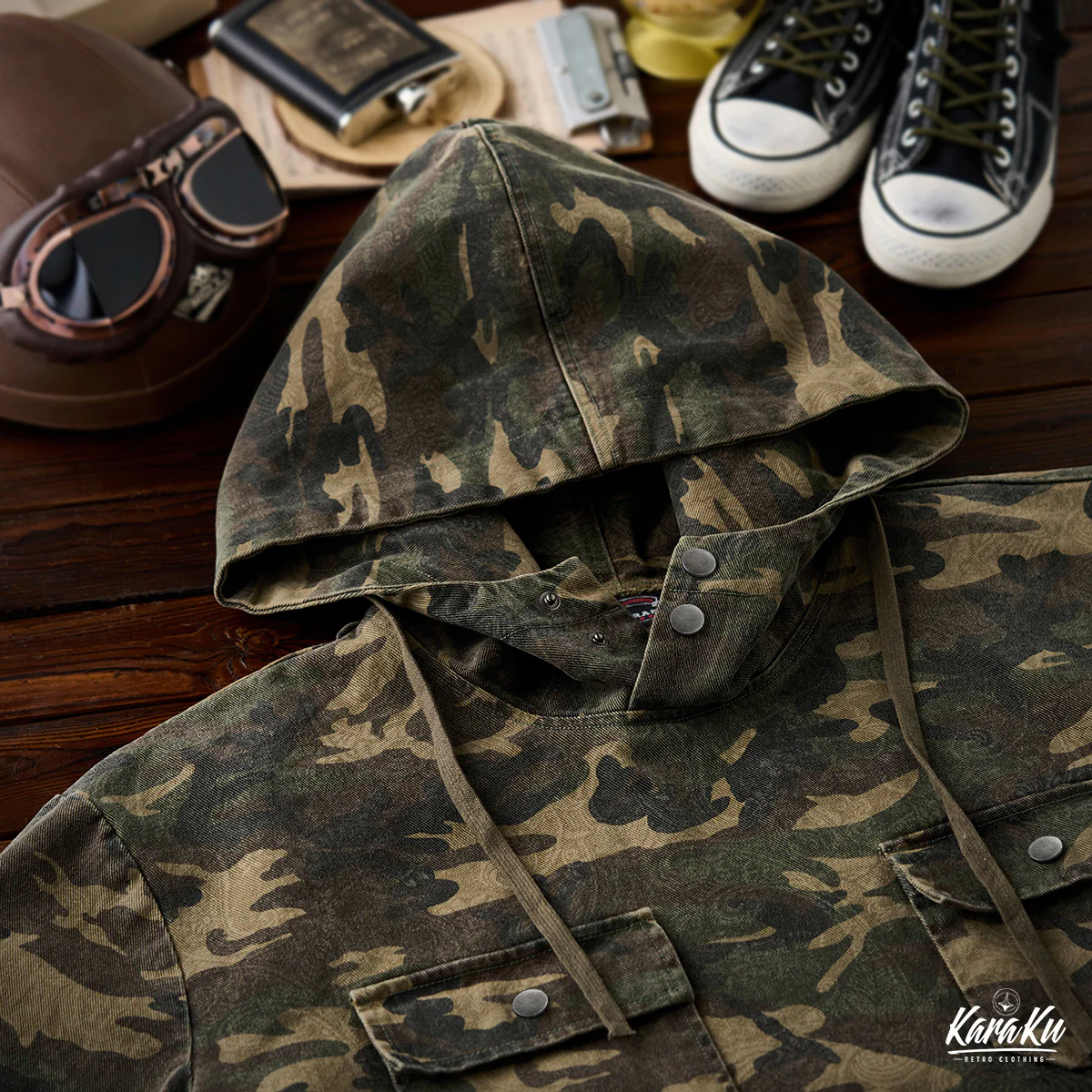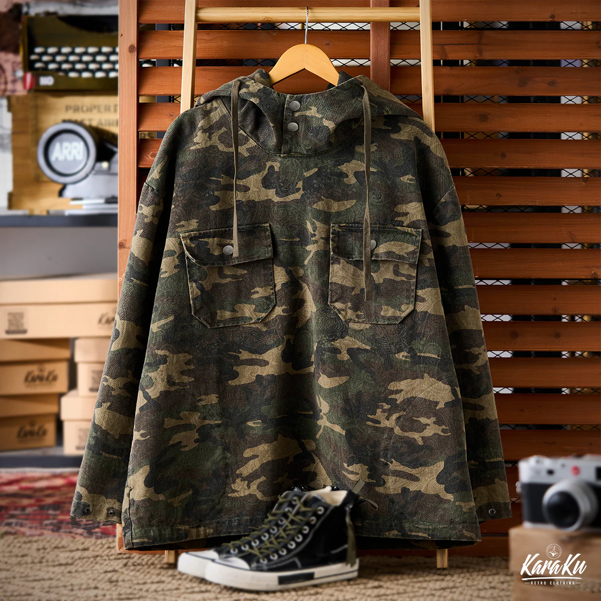 迷彩柄を再解釈し、クラシックなワークウェアスタイルに落とし込んだフード付きプルオーバー。胸元にはフラップ付きポケットを2つ配置し、ワーク感を強調したデザインが特徴です。迷彩柄にはペイズリー柄を重ね合わせた独特のテクスチャが施され、細部まで洗練されたデザインに仕上げています。製品染めと酵素洗い加工により、ヴィンテージライクな風合いが加わり、一点物のような味わい深さが魅力です。アウトドアからストリートまで、幅広いスタイルにフィットする、機能性とファッション性を兼ね備えた一着です。
