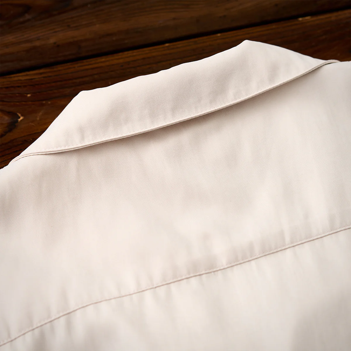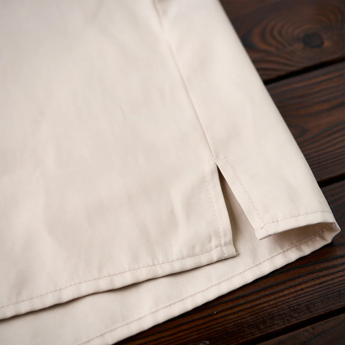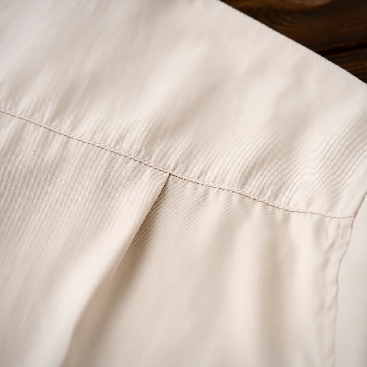 ピーチスキンは、繊細な起毛加工により、滑らかでしっとりとした手触りを実現。 生地の表面が微細な毛羽立ちを持つため、光の加減でマットな質感を演出。 肌触りが柔らかく、通気性が確保されている。