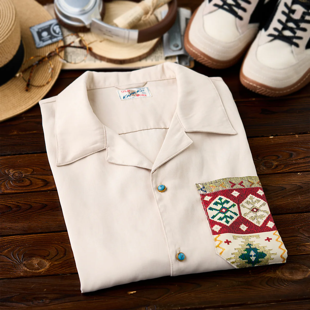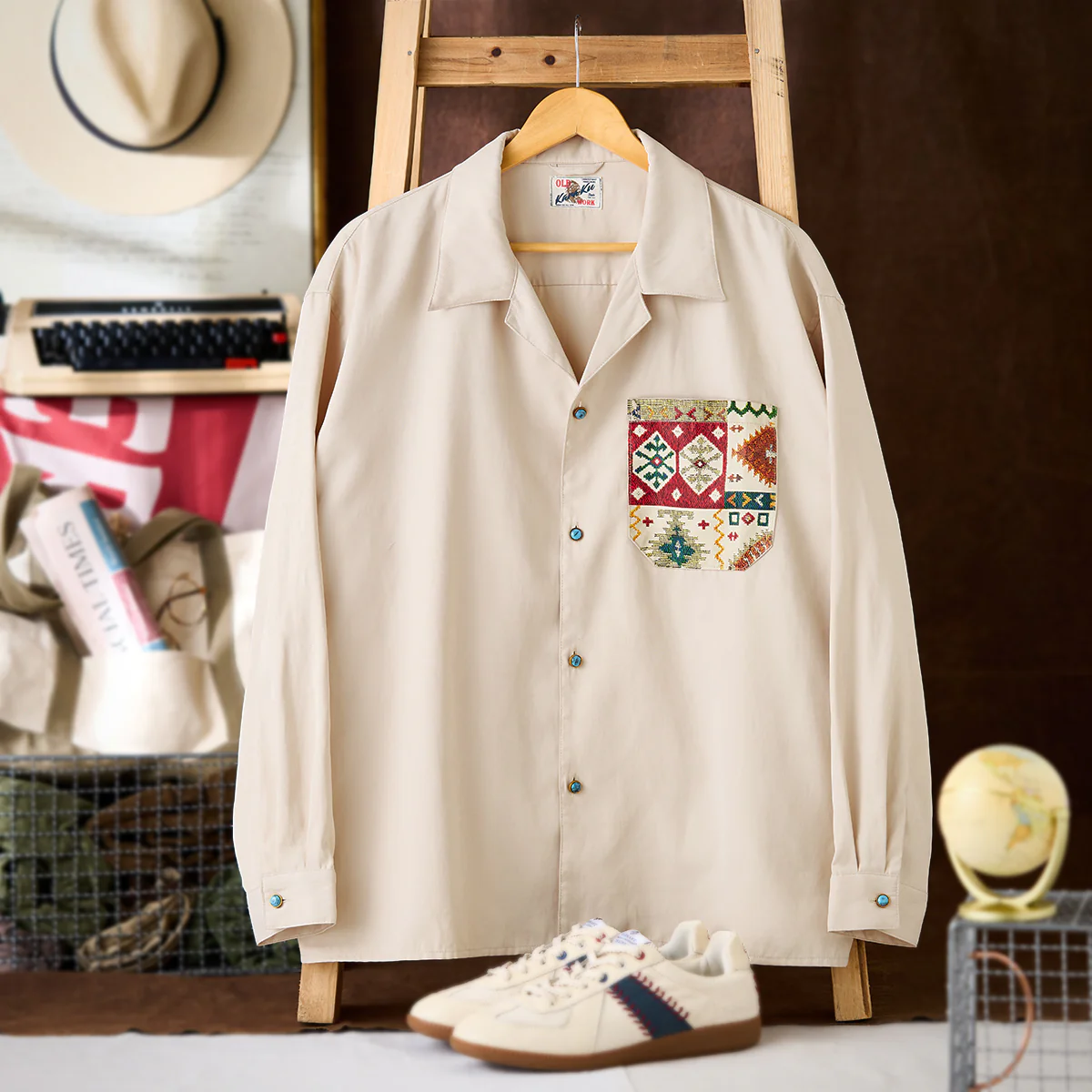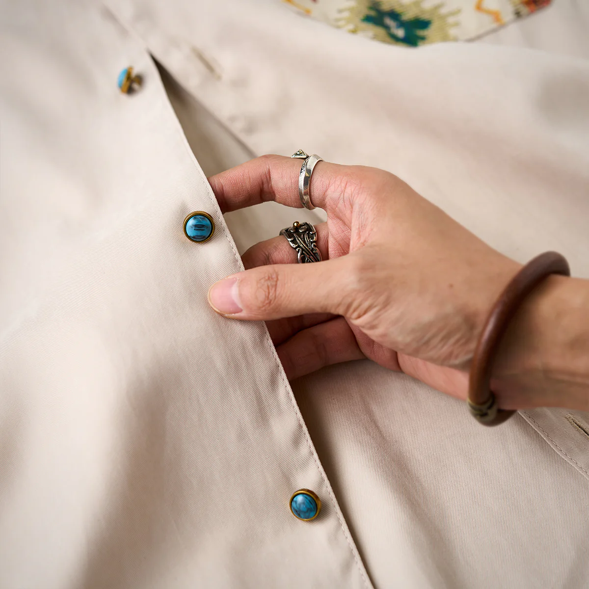 民族調ジャガードポケット ターコイズ風ボタンピーチスキンシャツ