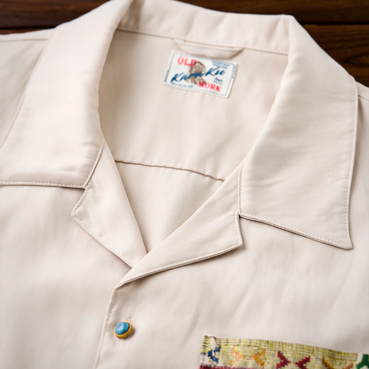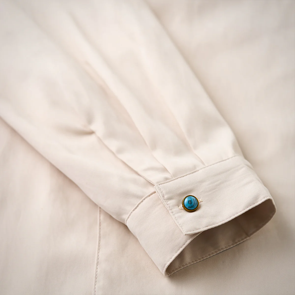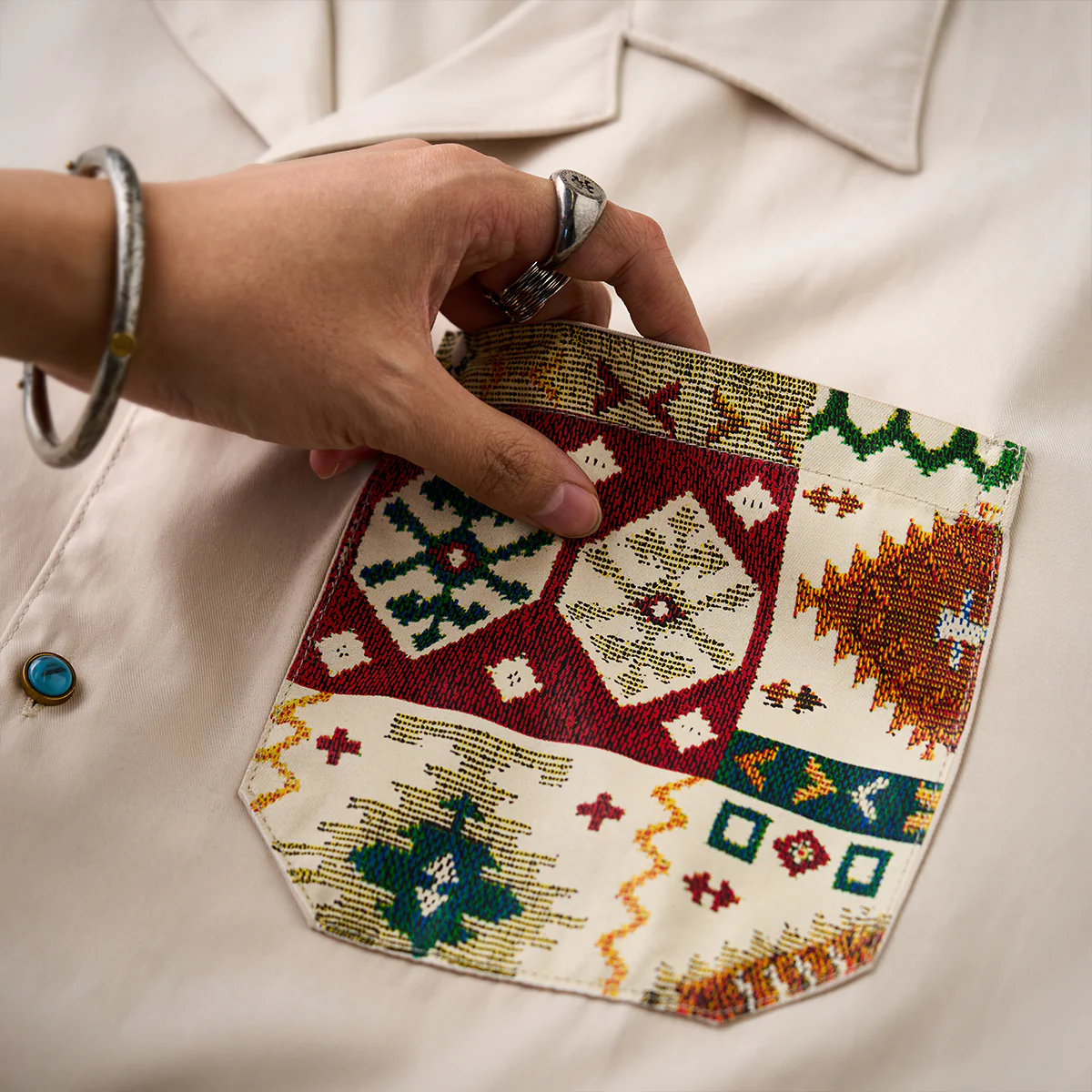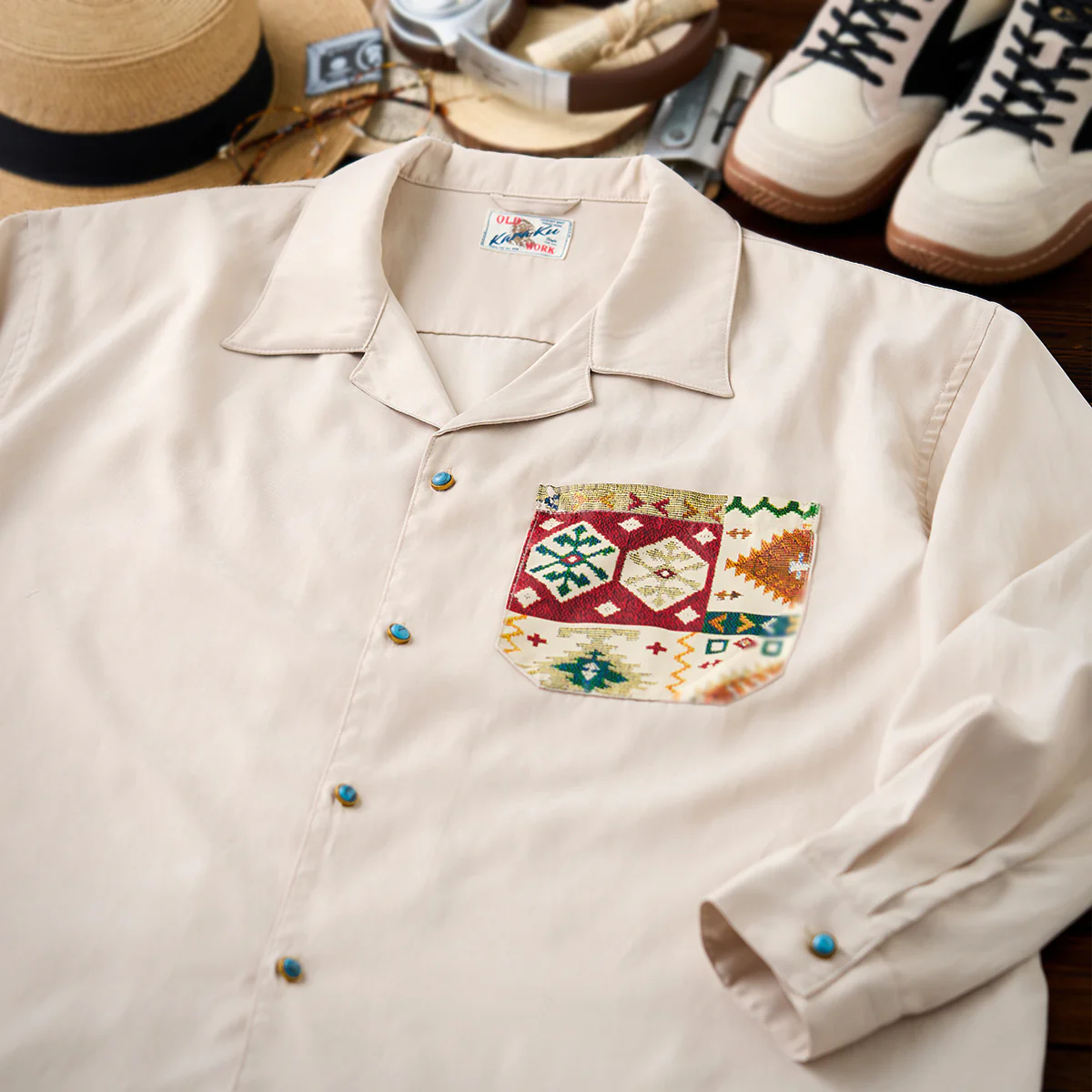民族調ジャガードポケット ターコイズ風ボタンピーチスキンシャツ