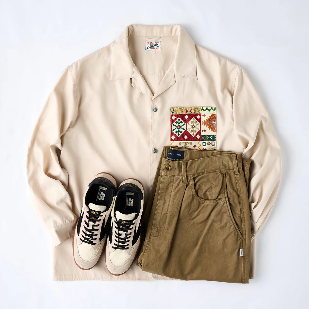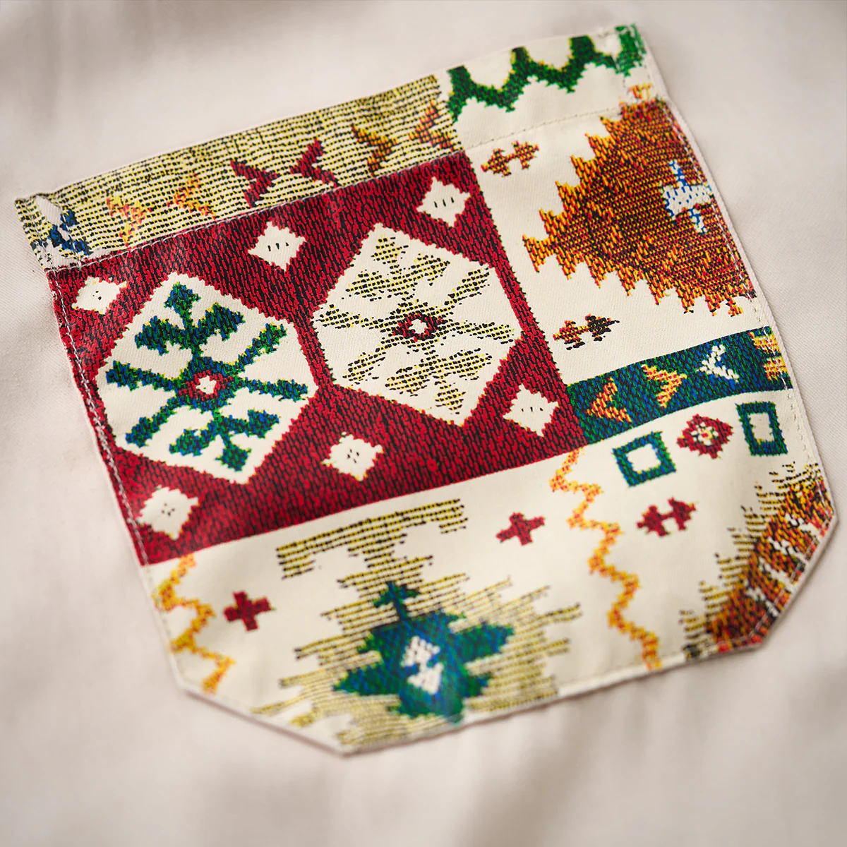 民族調ジャガード柄ポケットは左胸に設置されて、視覚的にすぐ目につくポイント。幾何学的な模様が特徴的で、菱形や波模様などのパターンが組み込まれています。これらは、伝統的な民族調のデザインを現代的にアレンジしたものです。