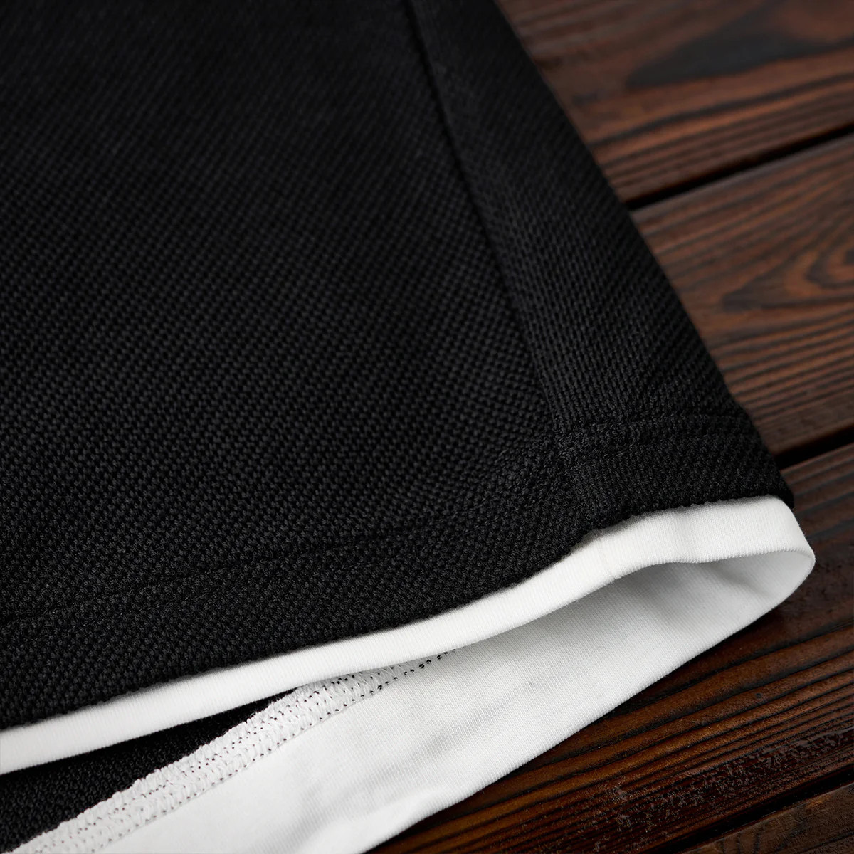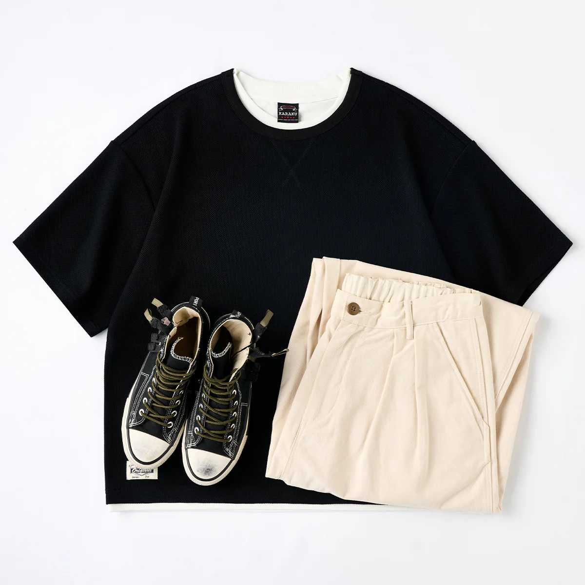 白いレイヤーが首元や裾に見えるデザインで、重ね着しているような印象を与え。見た目に奥行きが生まれ、シンプルながらもおしゃれな印象を持たせています。