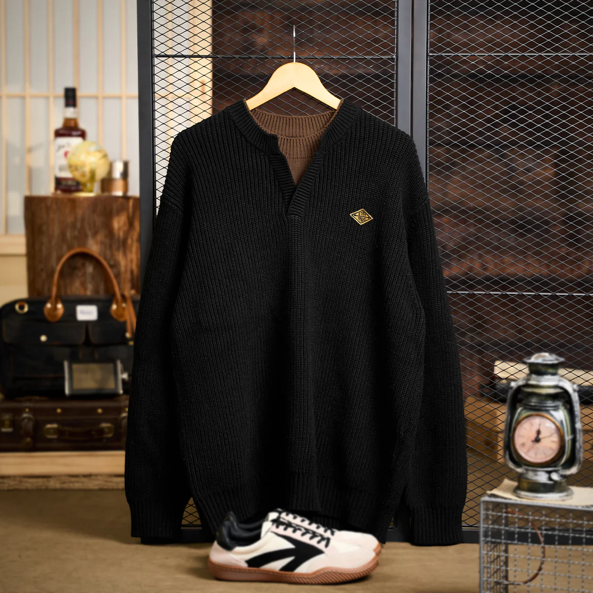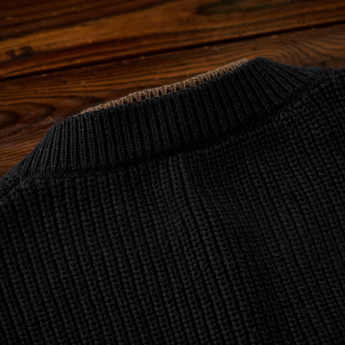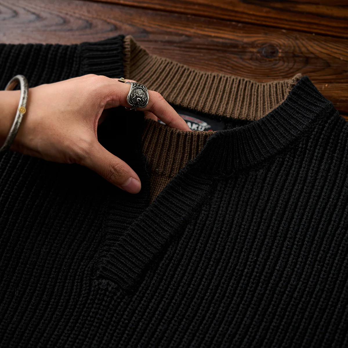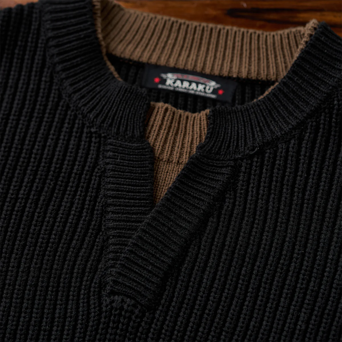 襟元のフロント部分に小さなスリットがあり、首元にさりげない抜け感を演出しています。メインカラーはブラックで、襟元や内側部分にブラウンを使用しています。シンプルで落ち着いた印象を与えつつ、視覚的な変化を生み出しています。袖や胴回りがややゆったりしているため、リラックス感がありつつもトレンド感のあるシルエットです。