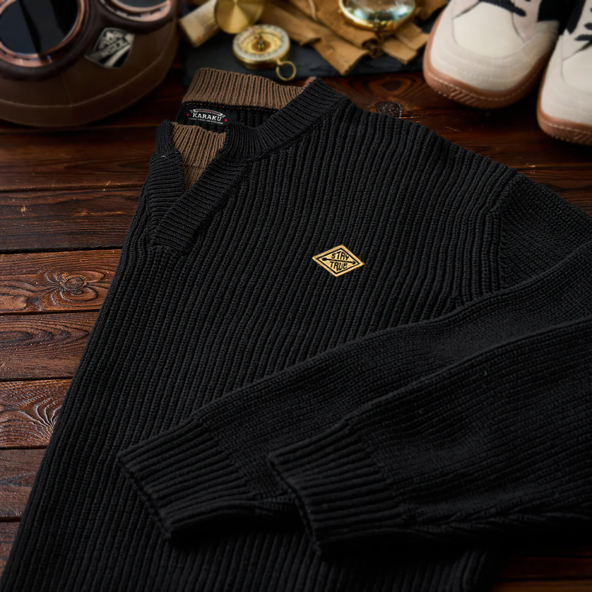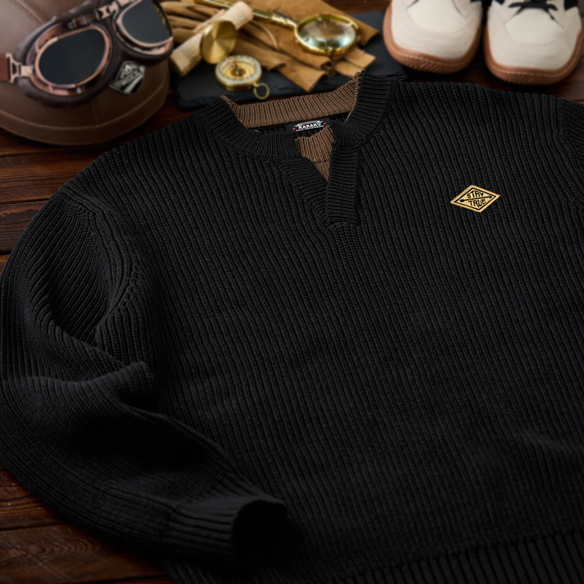 左胸に「STAY TRUE」刺繍ワッペンが付いて、シンプルながらもユニークなポイントになっており、ワッペンの黄色が全体のダークなカラーに対してアクセントとなり、目を引きます。