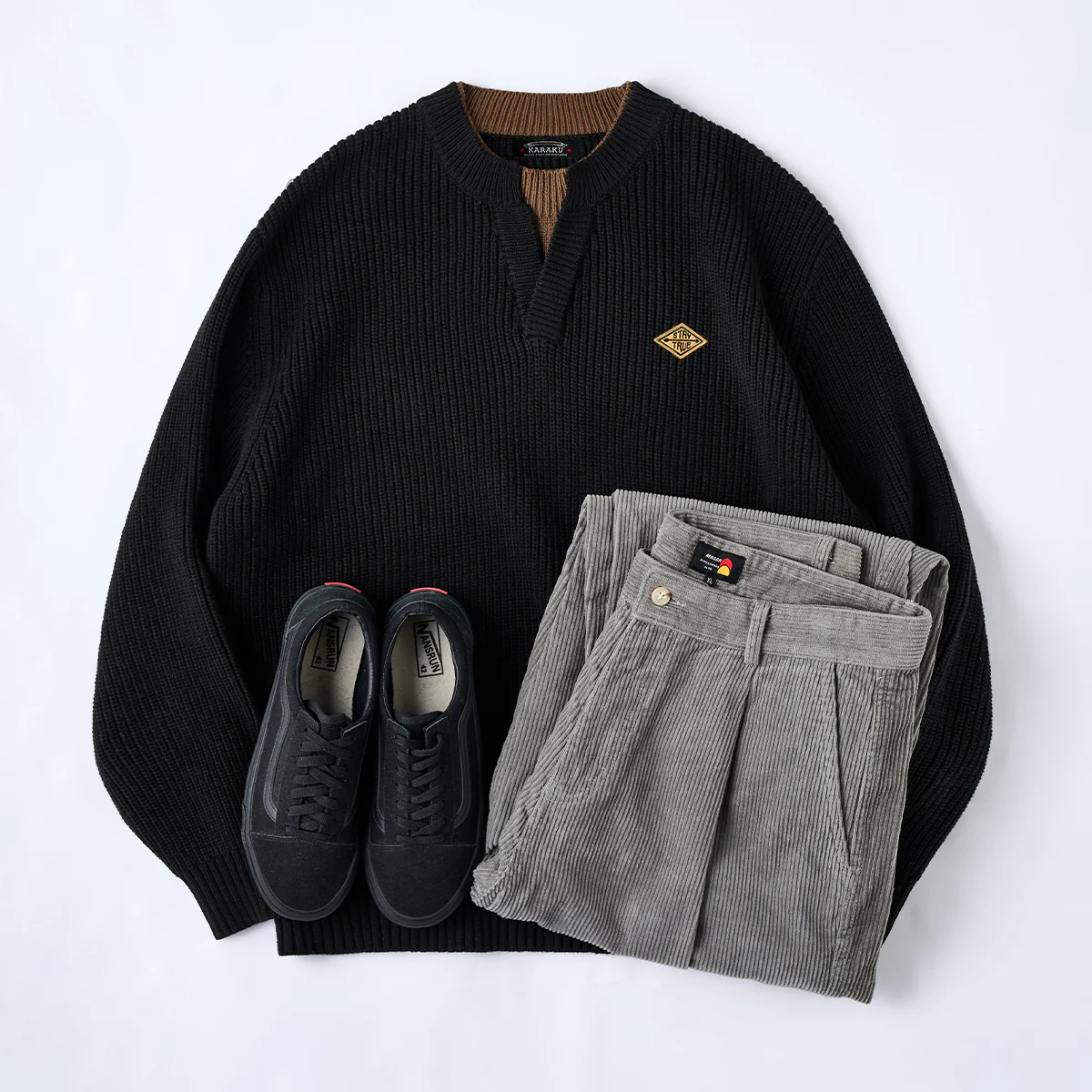 デニムやチノパンと合わせてカジュアルな場面で活用可能です。ブラックのスラックスと合わせることで、シンプルで上品なコーディネートも作れます。