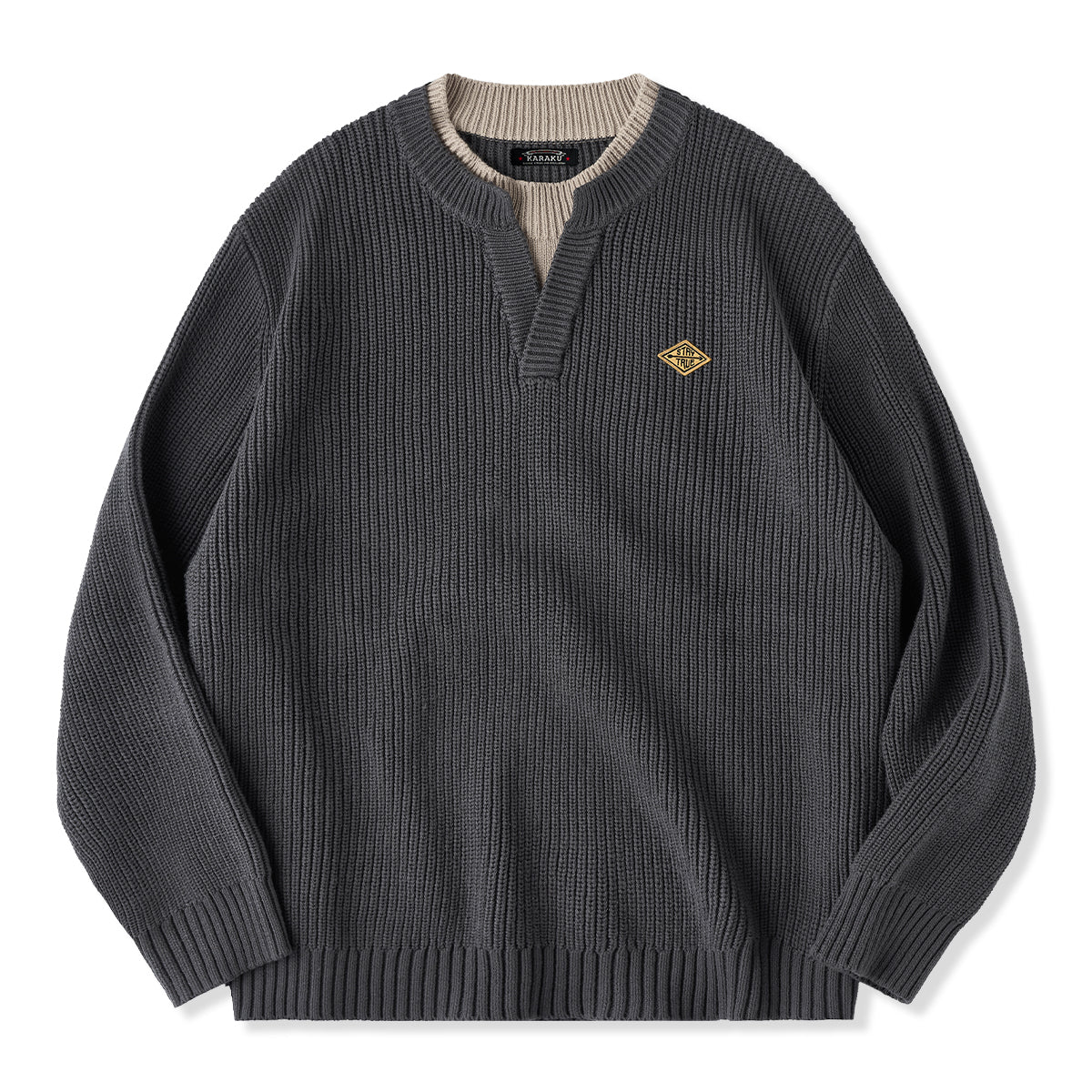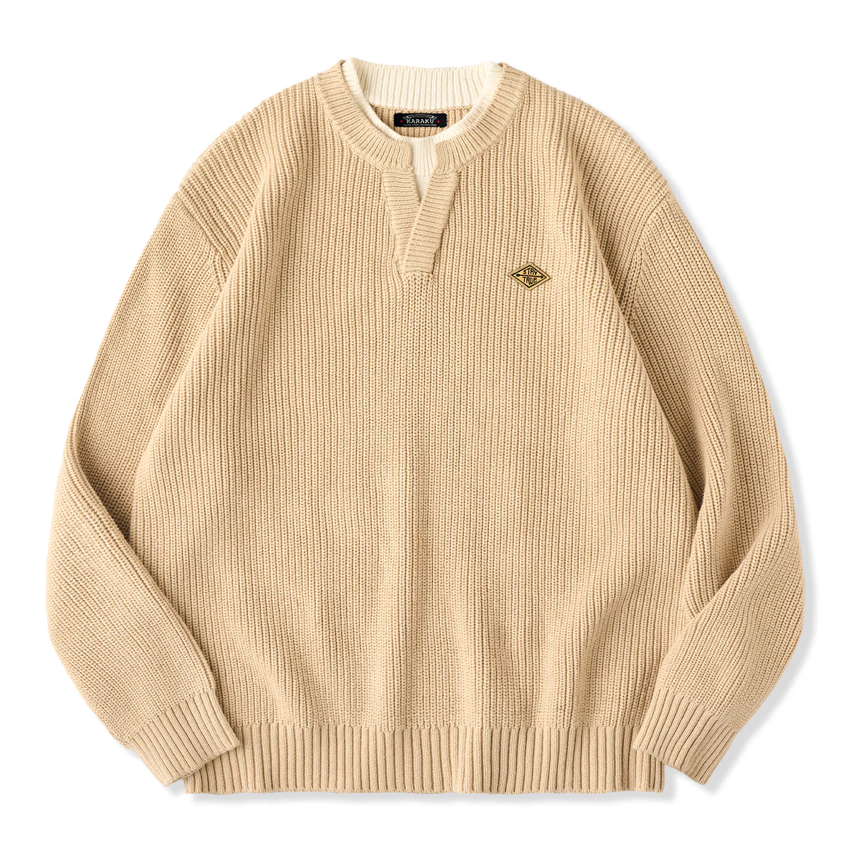 【新色追加】「STAY TRUE」刺繍ワッペン 配色切替フェイクレイヤードニットセーター