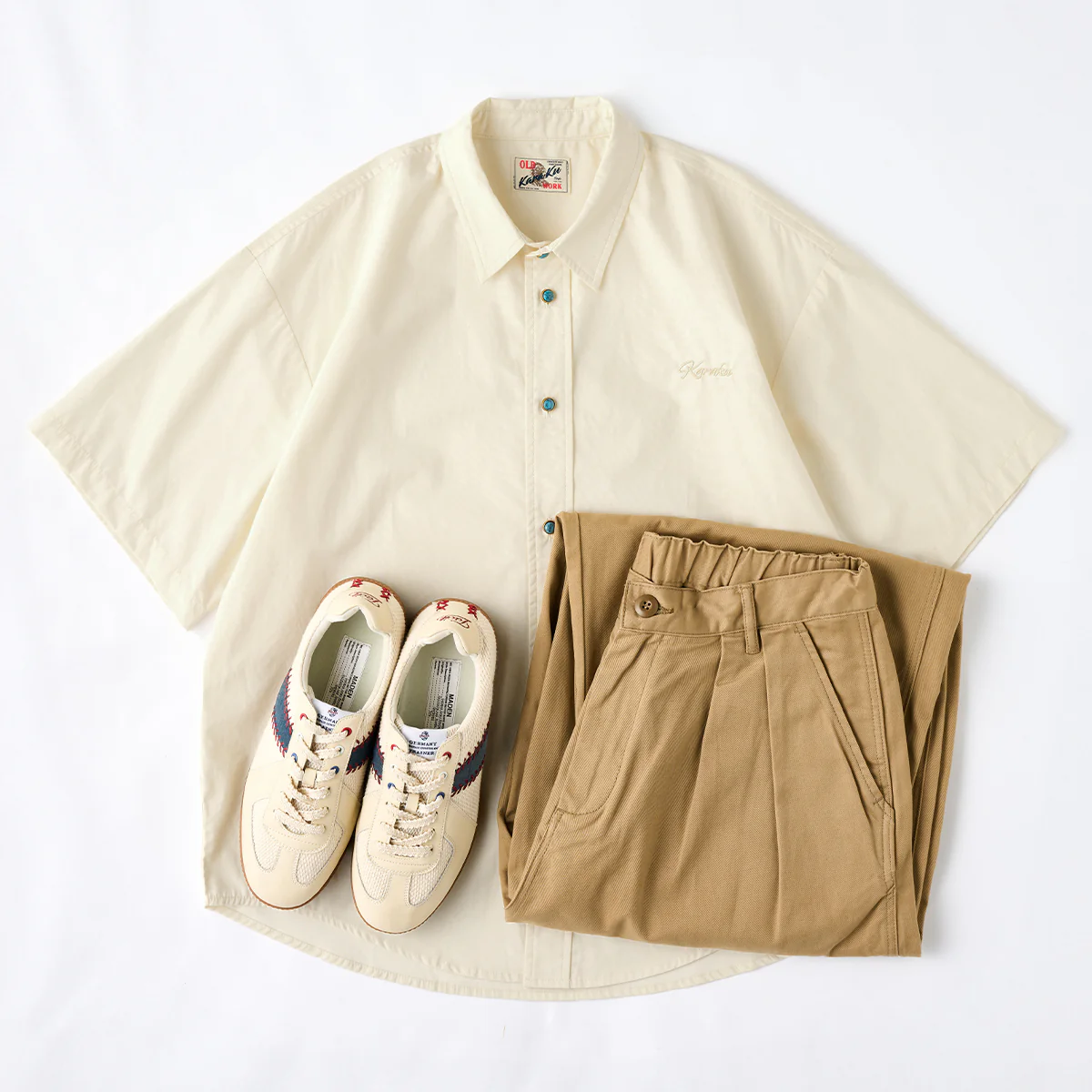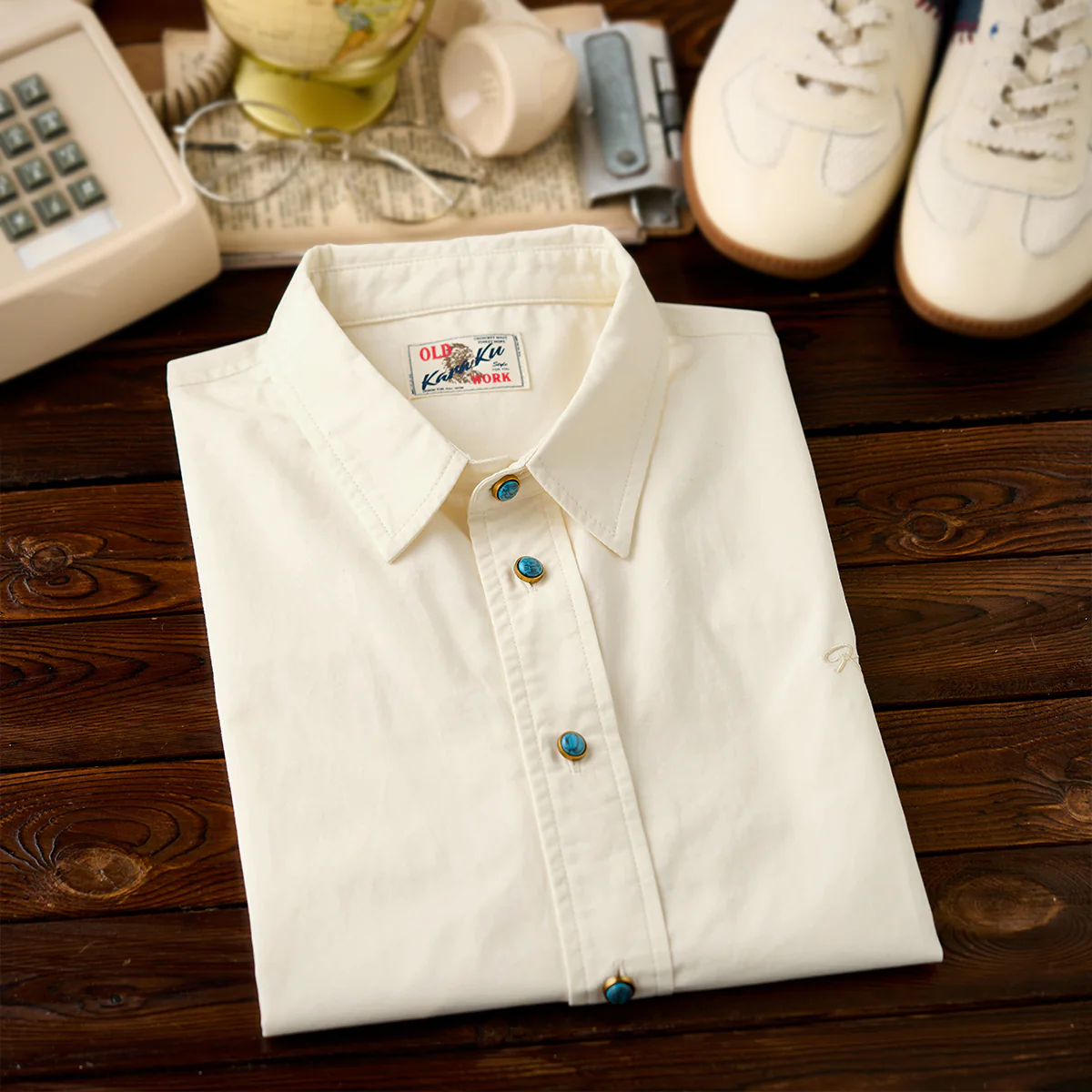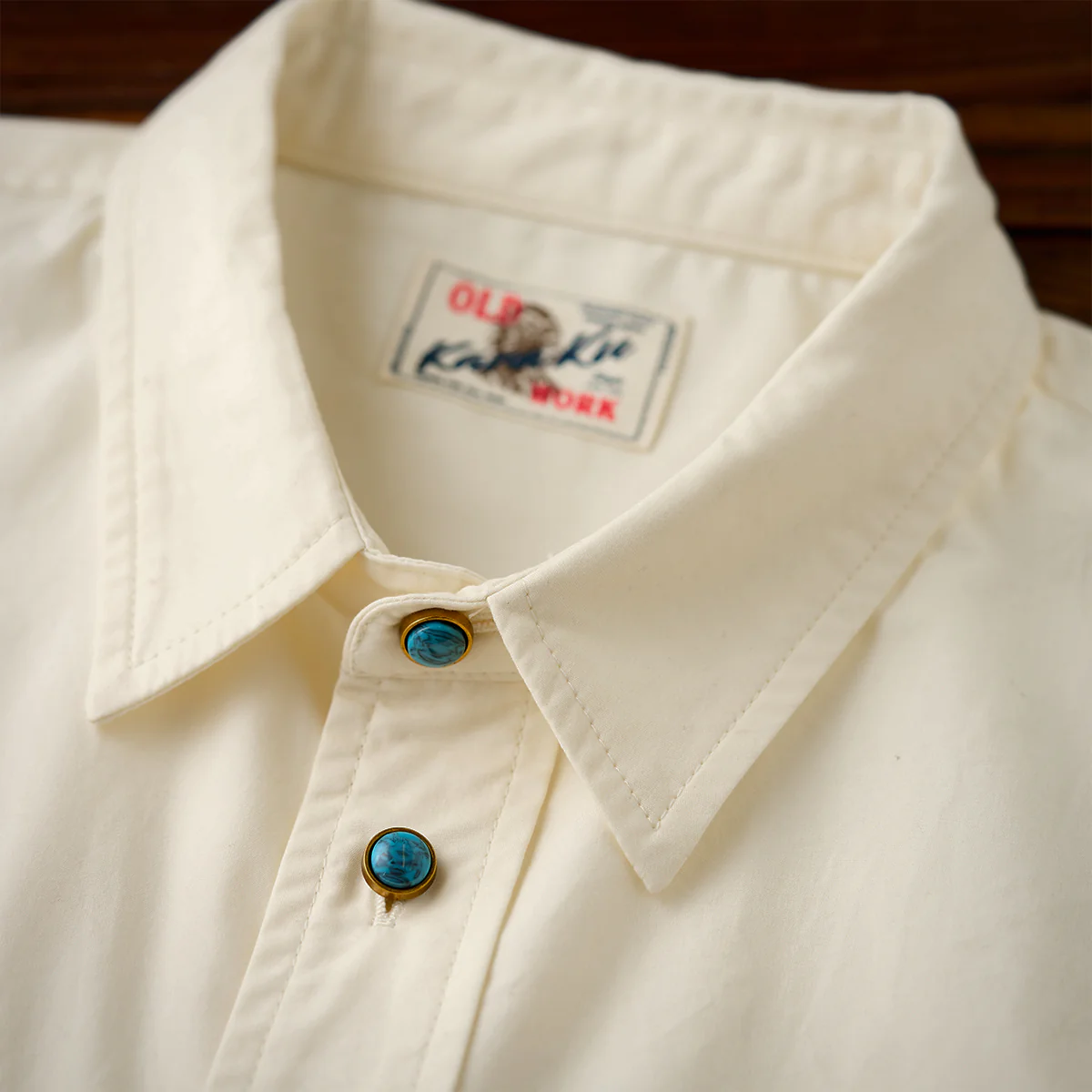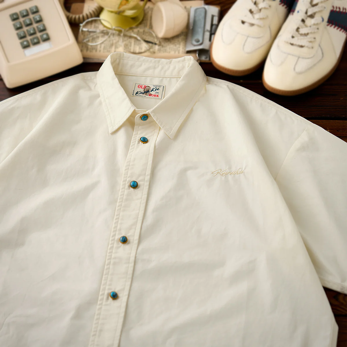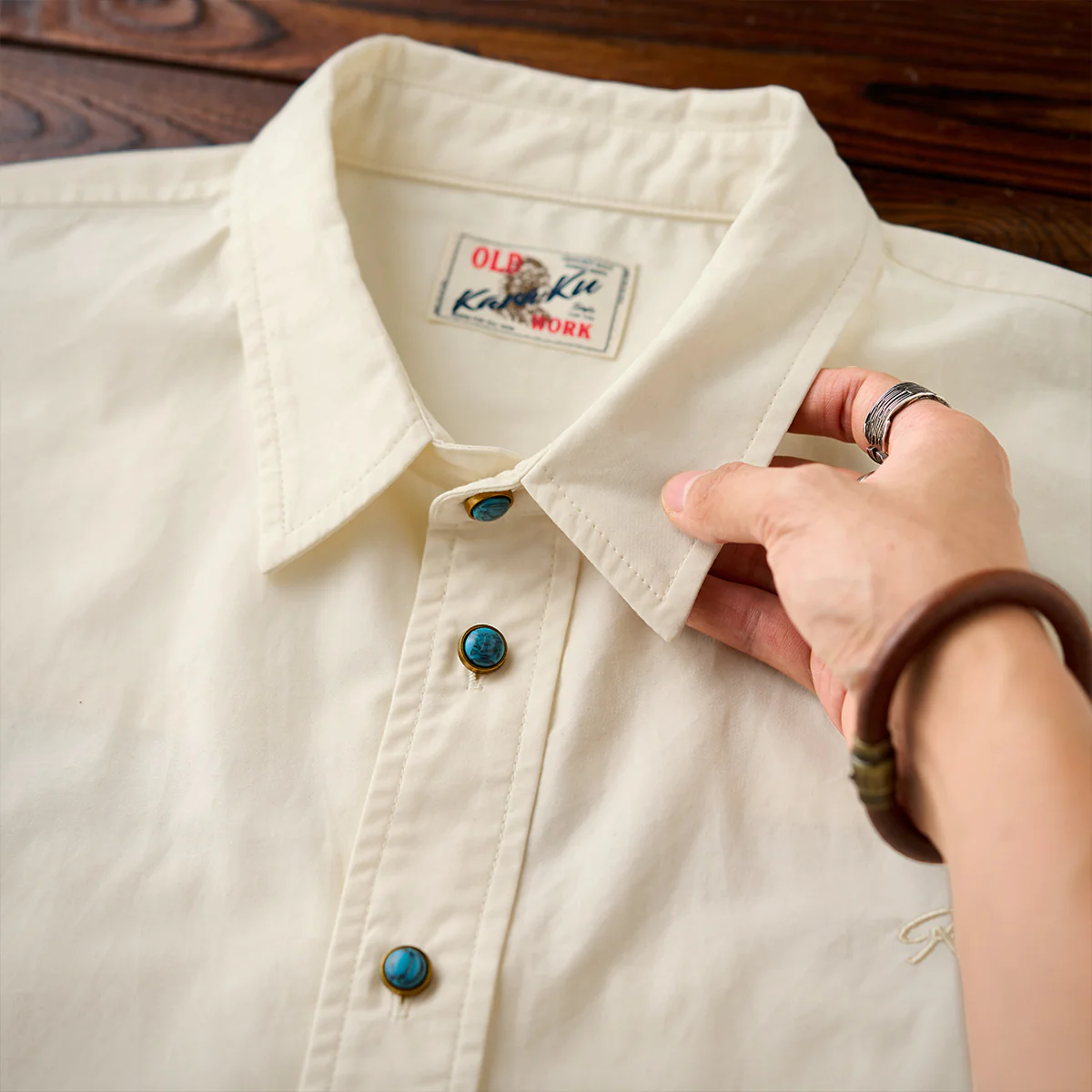 • 「KaraKu」ロゴ刺繍 ターコイズ風ボタン付き半袖シャツ