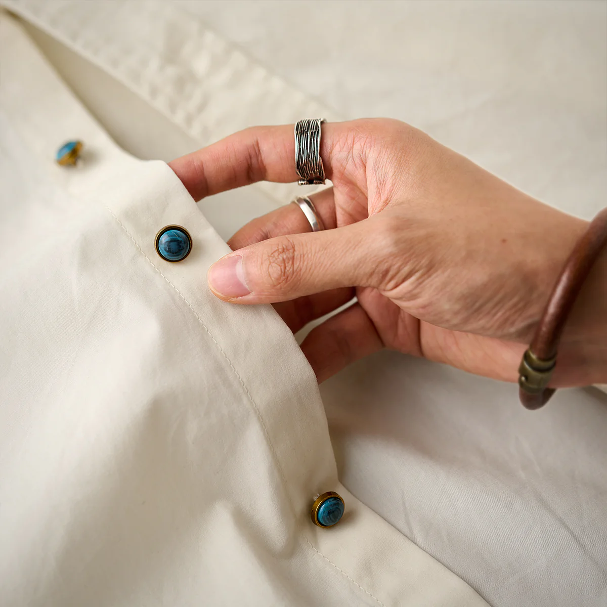ボタンにターコイズ風の鮮やかな青緑色が採用されて、全体の落ち着いた色味に対してアクセントとなって、シンプルなデザインに遊び心を加えています。