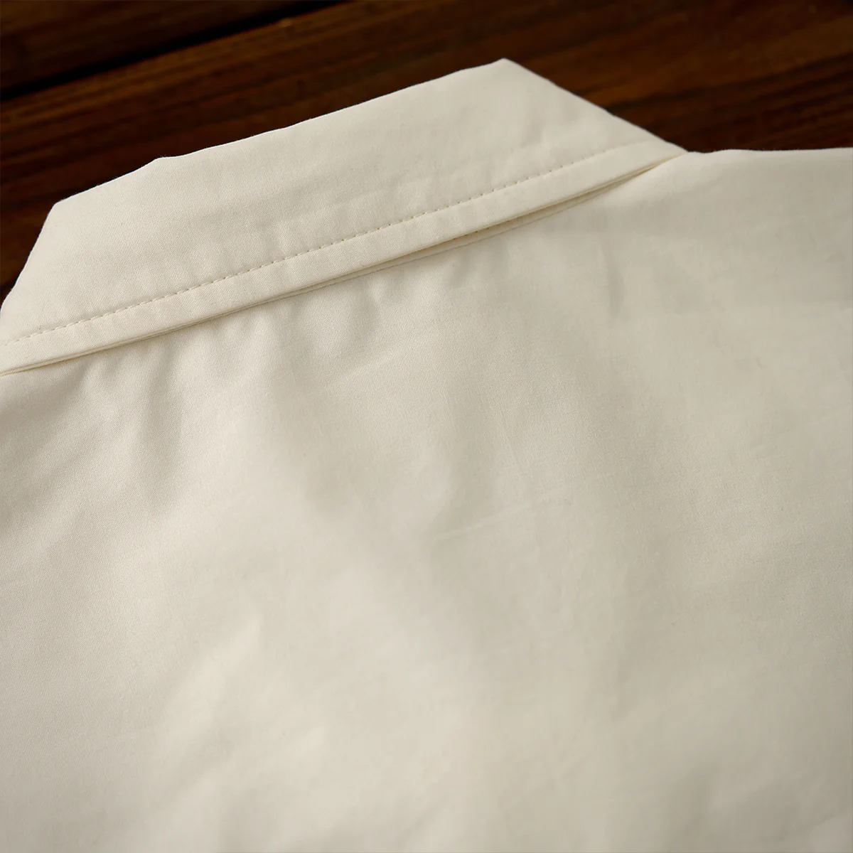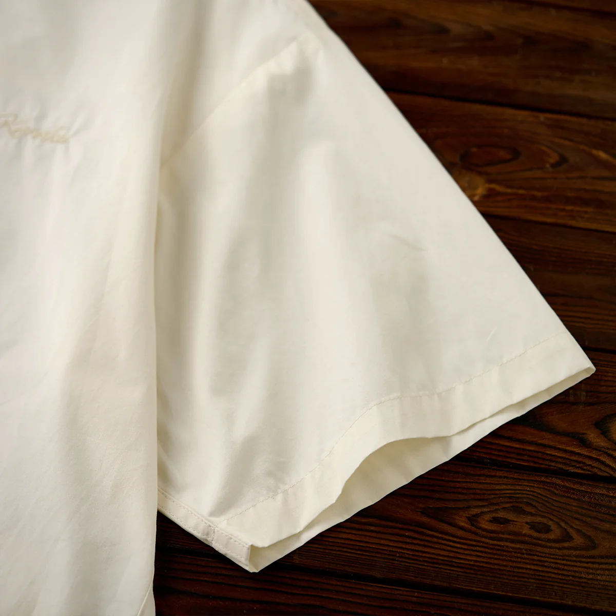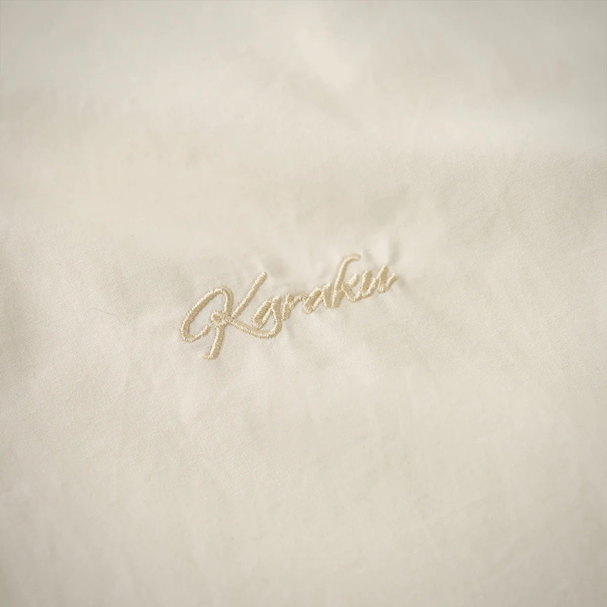 左胸部分に控えめな刺繍で「Karaku」のロゴが配置されて、シンプルながらも上品な雰囲気を醸し出して、ミニマルデザインとして全体の調和を損なわないポイントになっています。