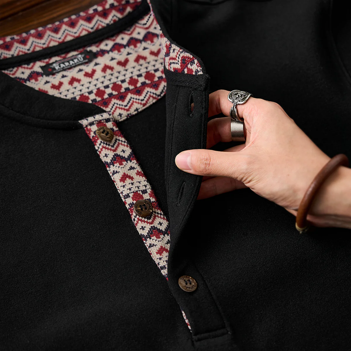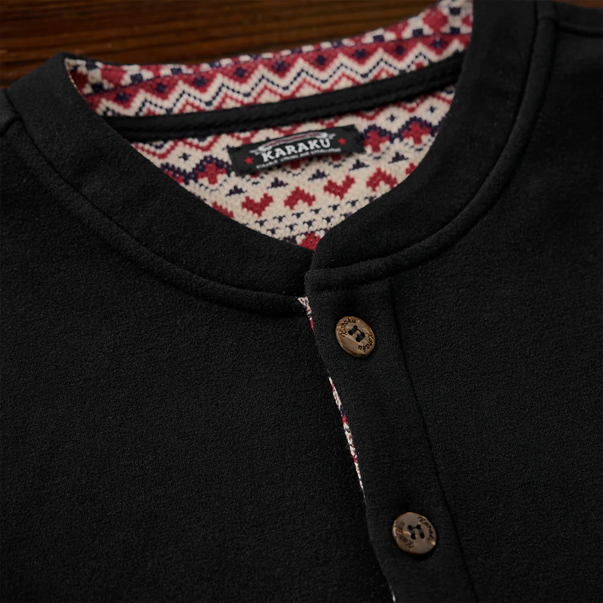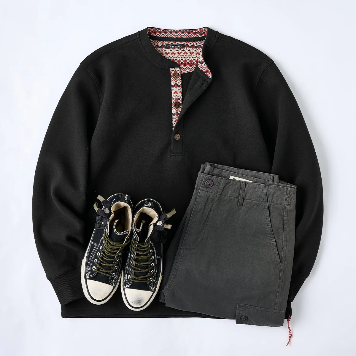 • 赤ヒモ付き エスニックジャカード織り切替ヘンリーネックロングT