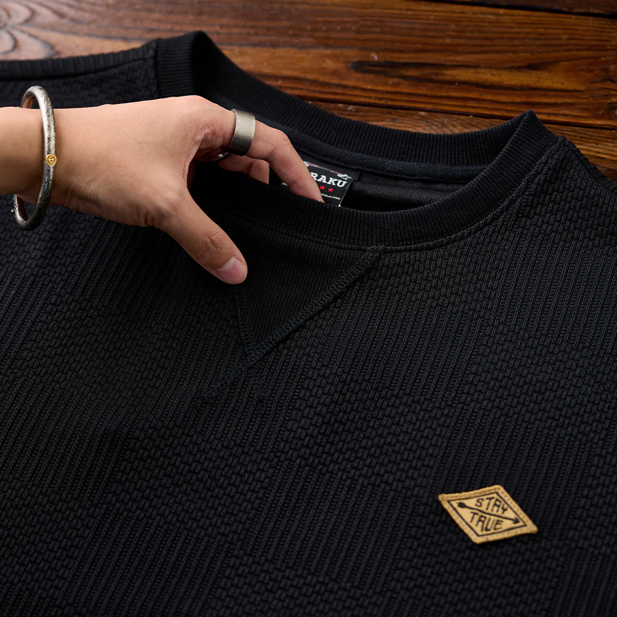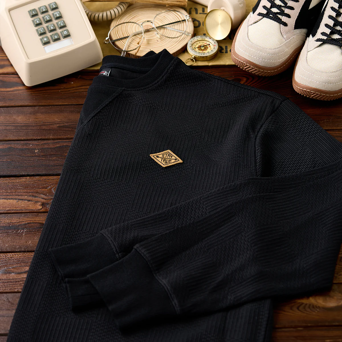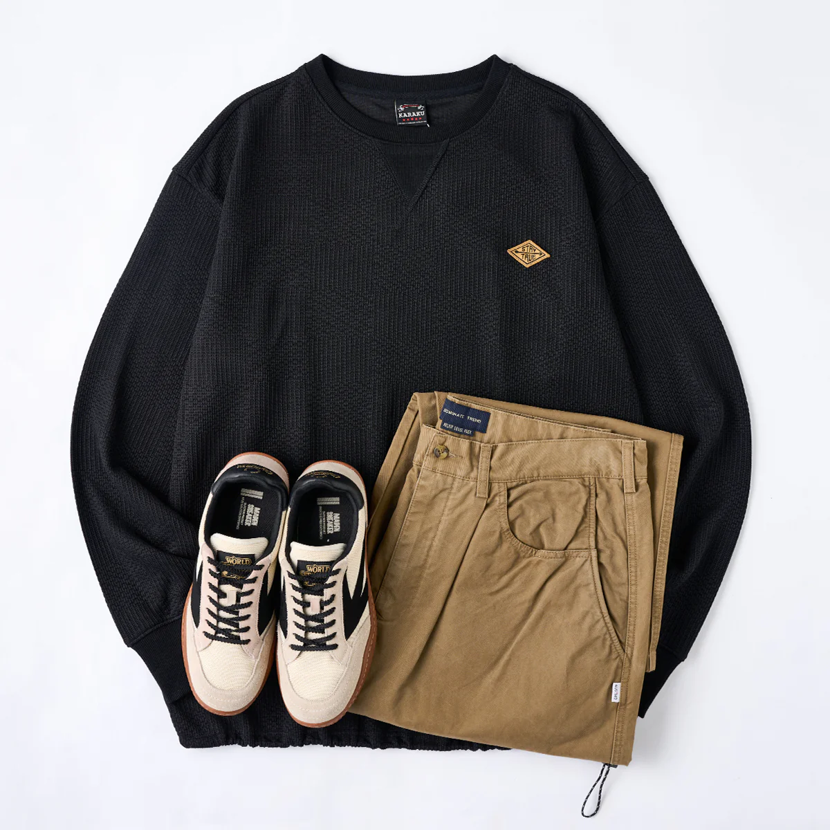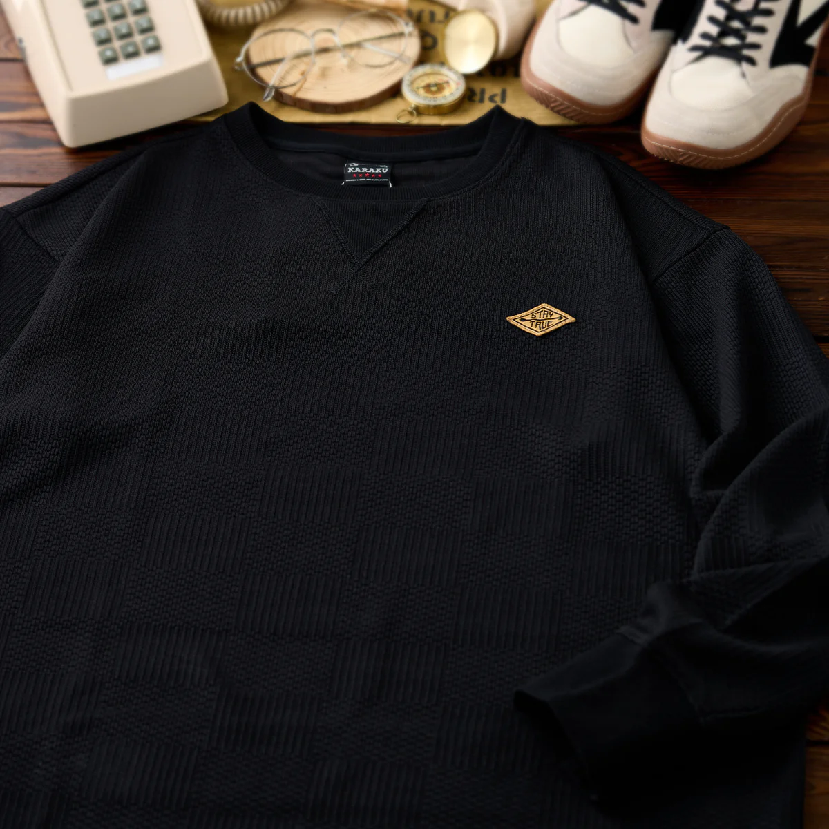 チェック柄を織りで表現したニット素材を使用したロングスリーブTシャツ。柔らかな風合いと適度な厚みがあり、1枚でもレイヤードでも活躍する万能アイテムです。胸元には「STAY TRUE」と刺繍されたワッペンをあしらい、シンプルなデザインにアクセントを添えています。裾にはシルエットを調整できるドローコードを配し、スポーティかつモダンな印象に。カジュアルスタイルはもちろん、ストリートやアウトドアテイストのコーディネートにもマッチする一着です。