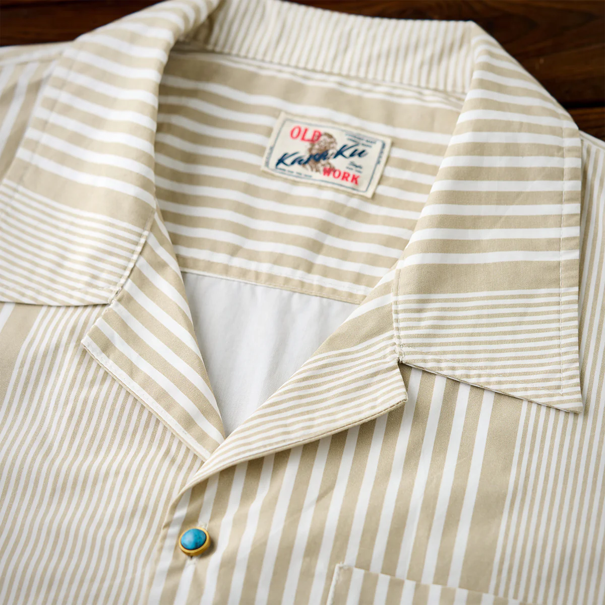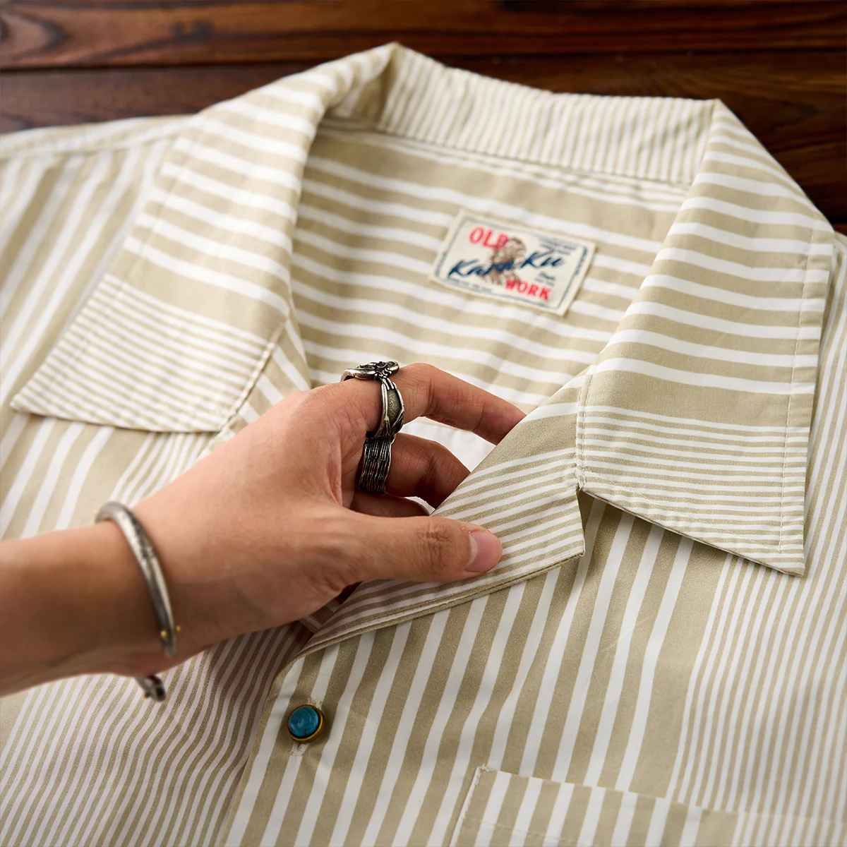 ターコイズ風ボタン付き ストライプ柄コットン開襟シャツ