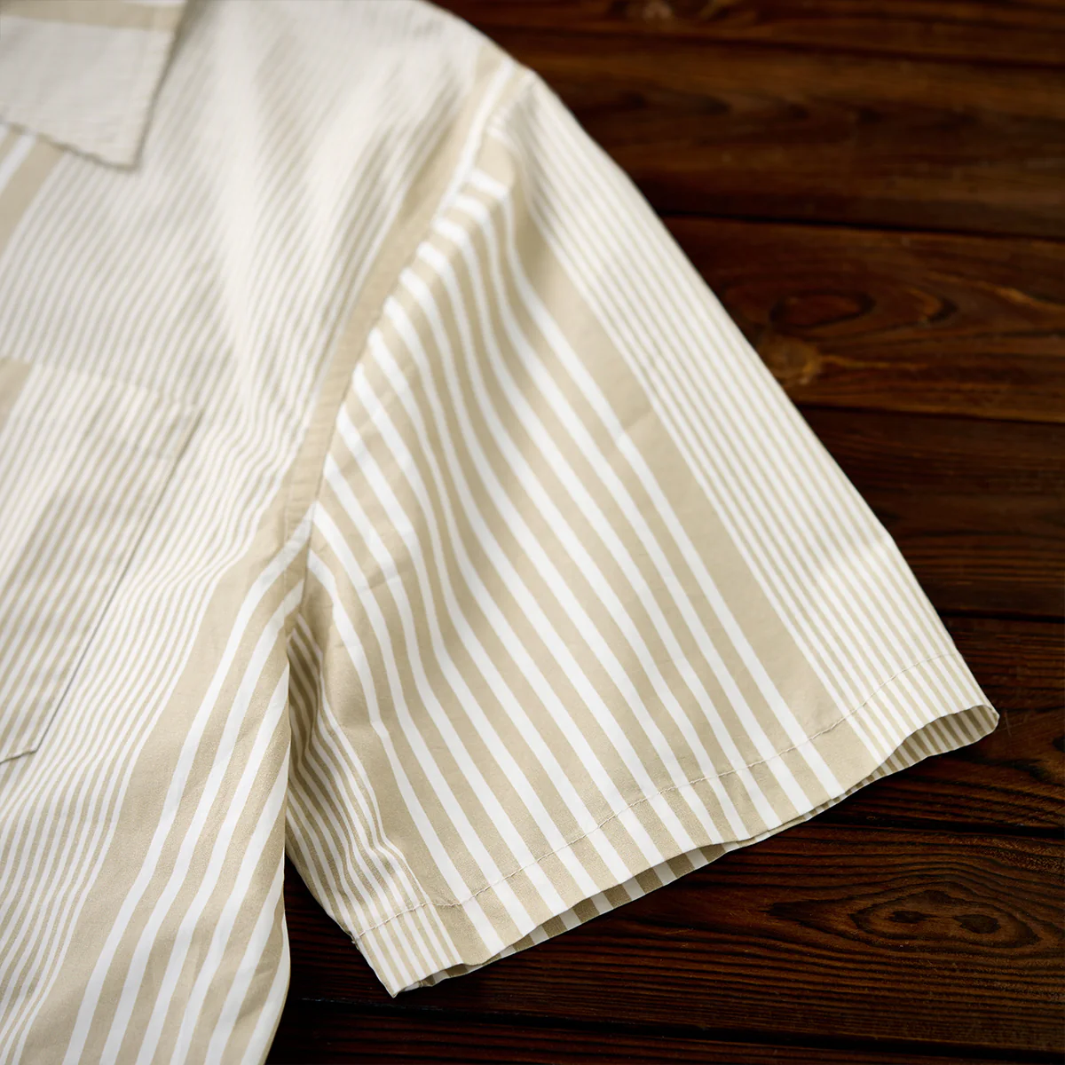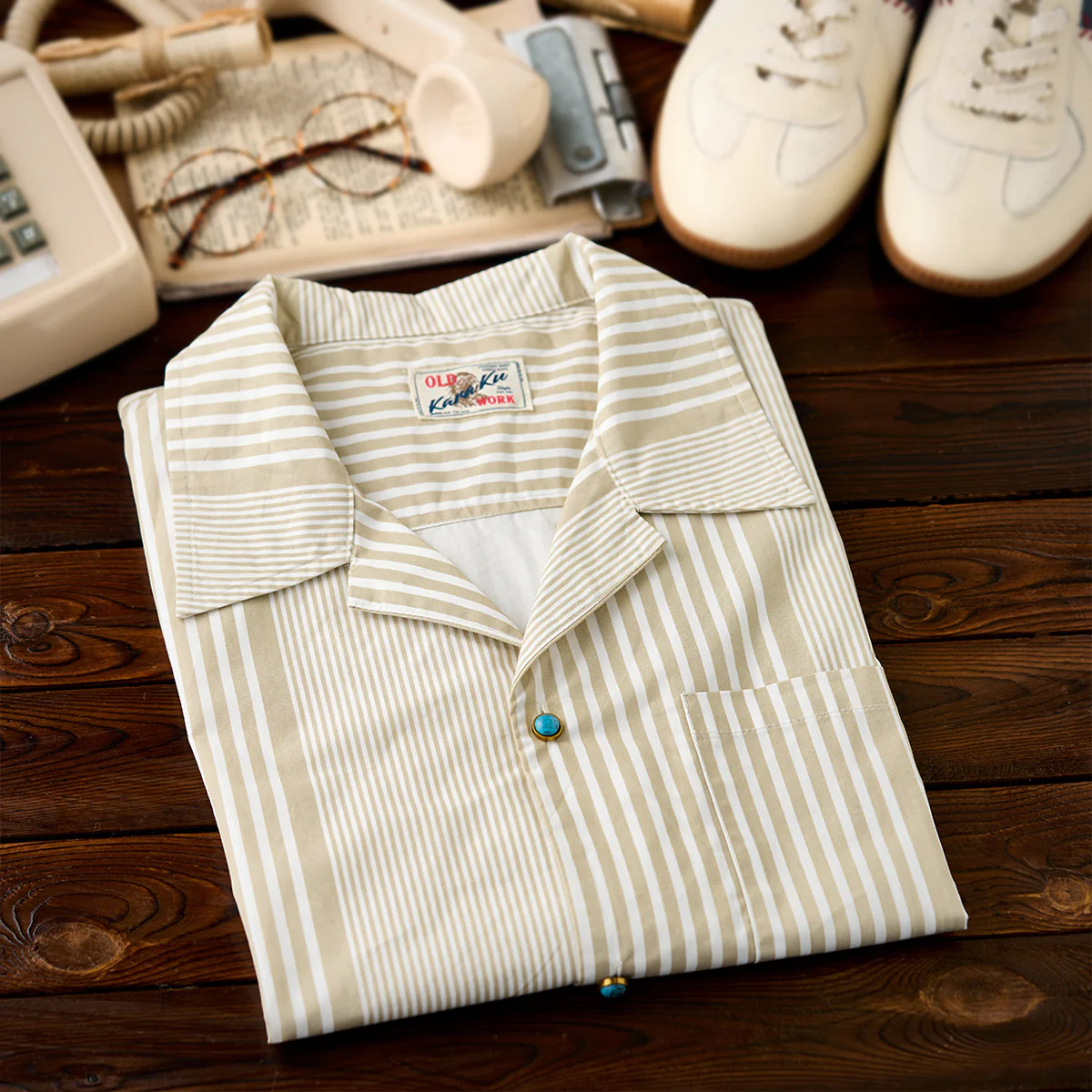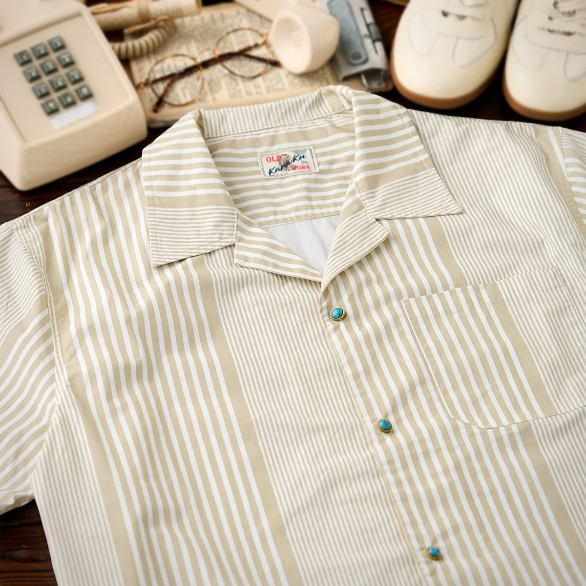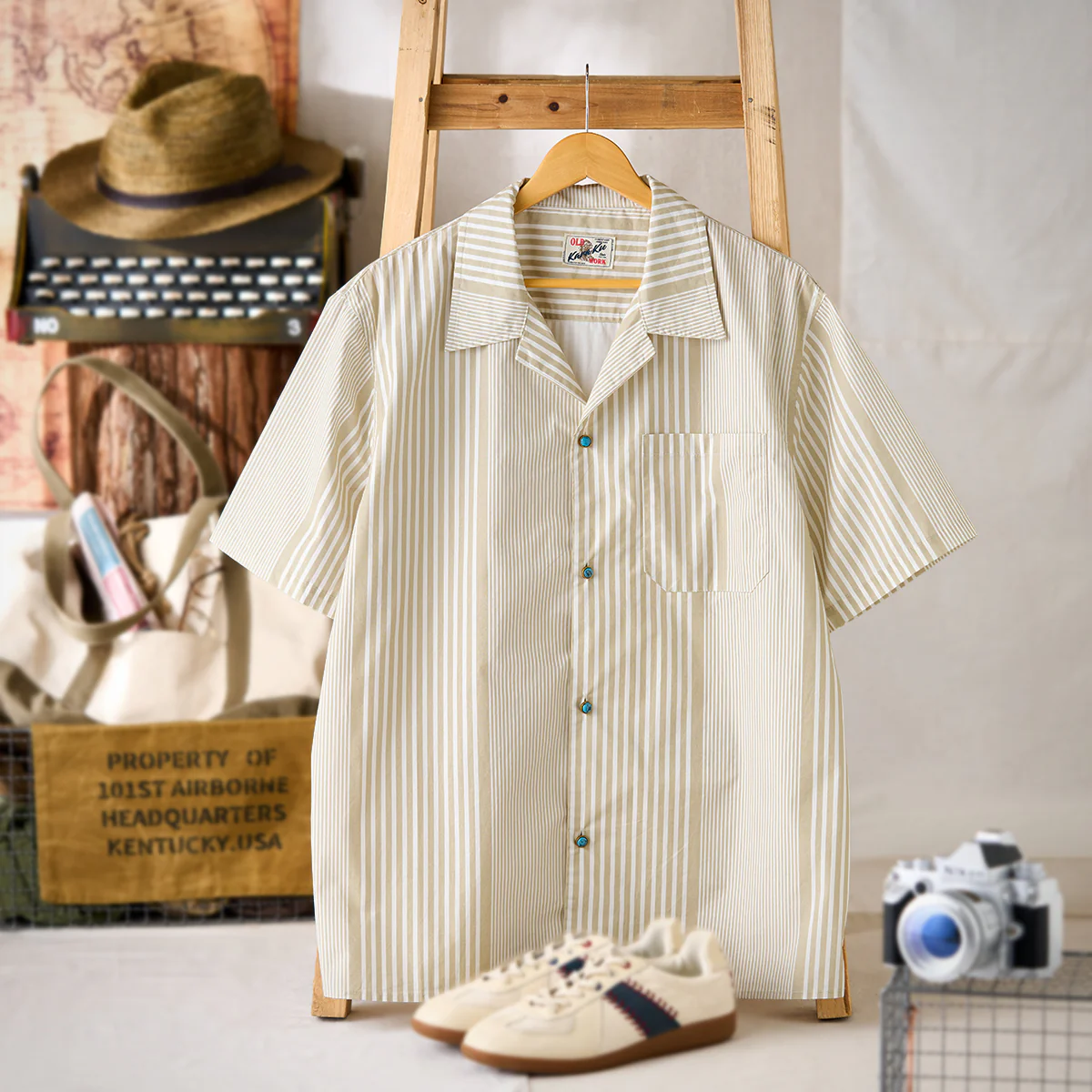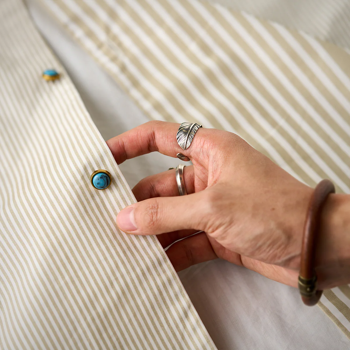 • ターコイズ風ボタン付き ストライプ柄コットン開襟シャツ