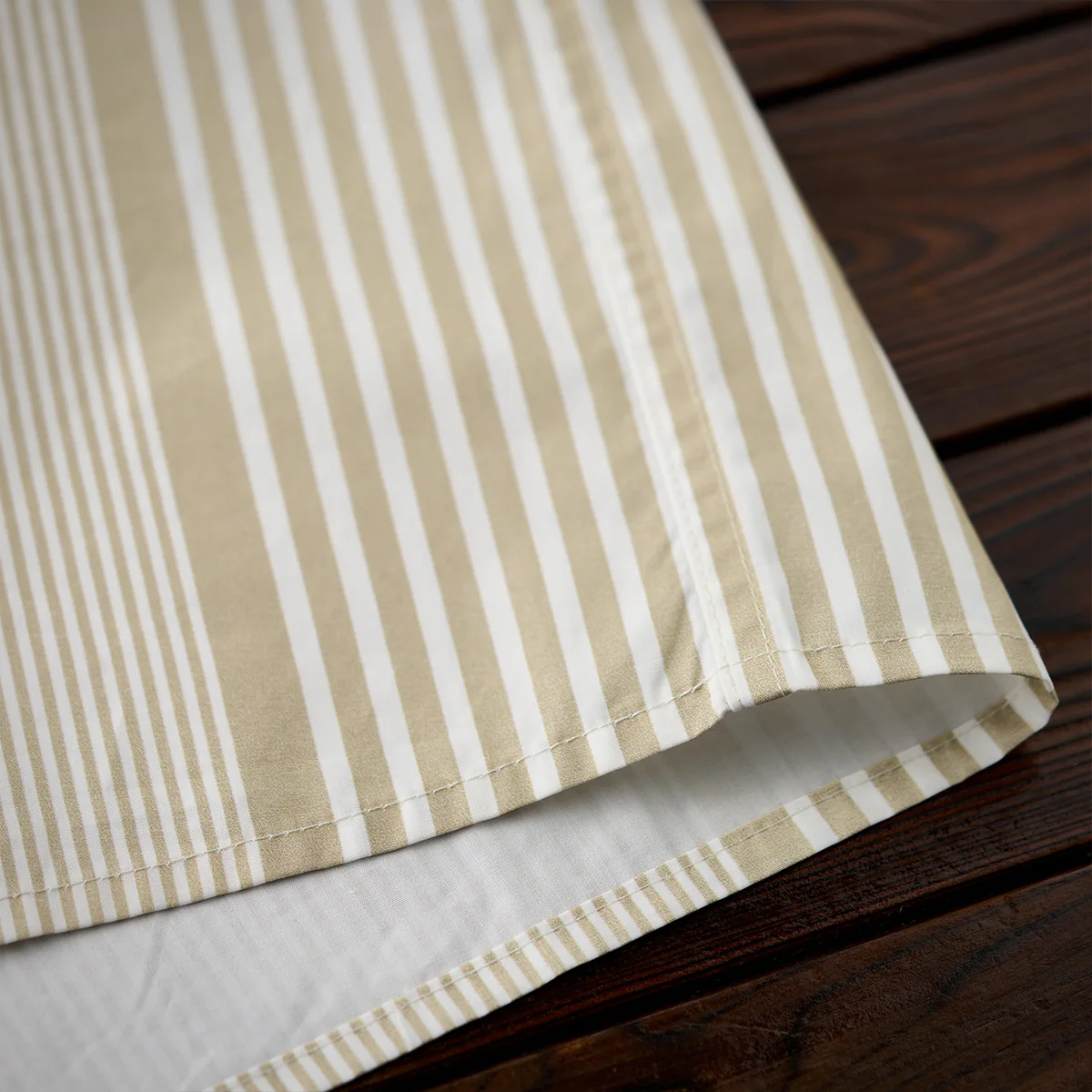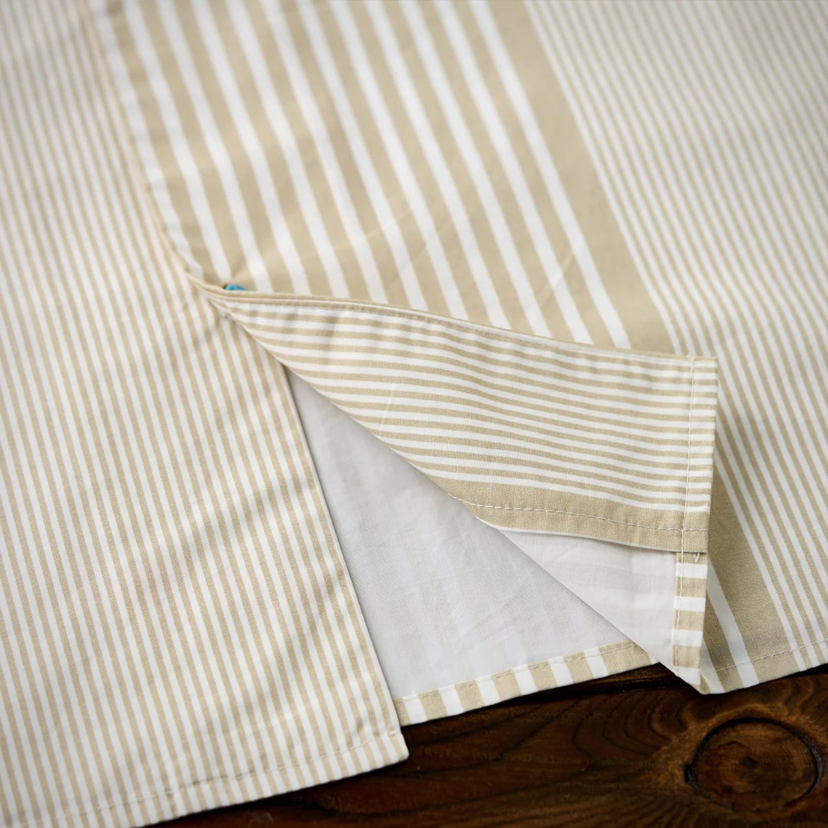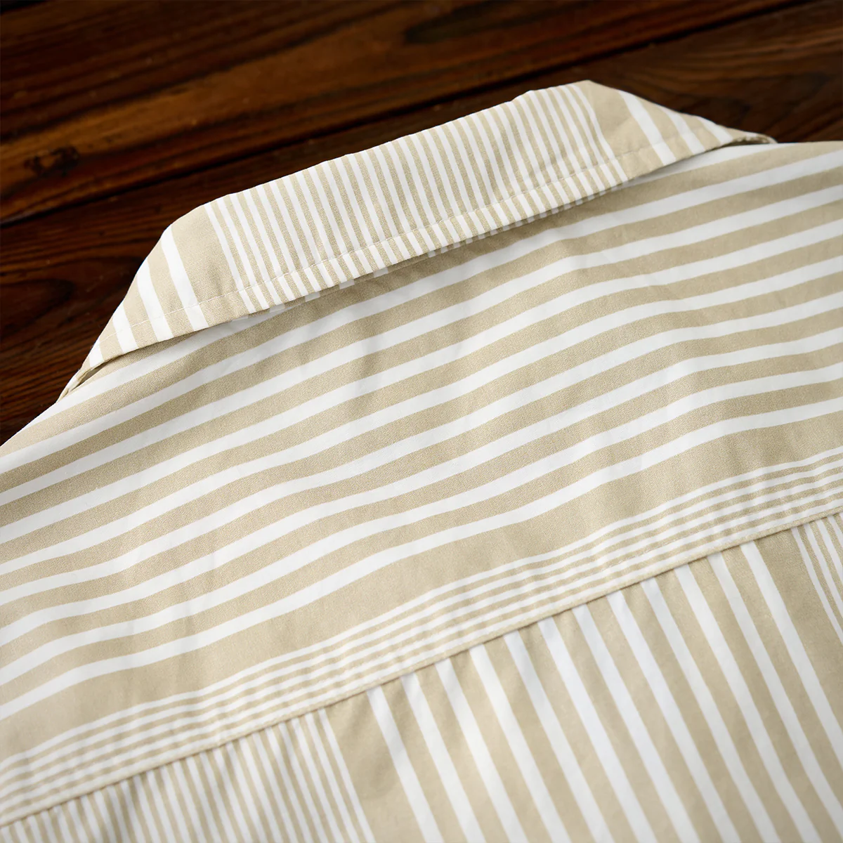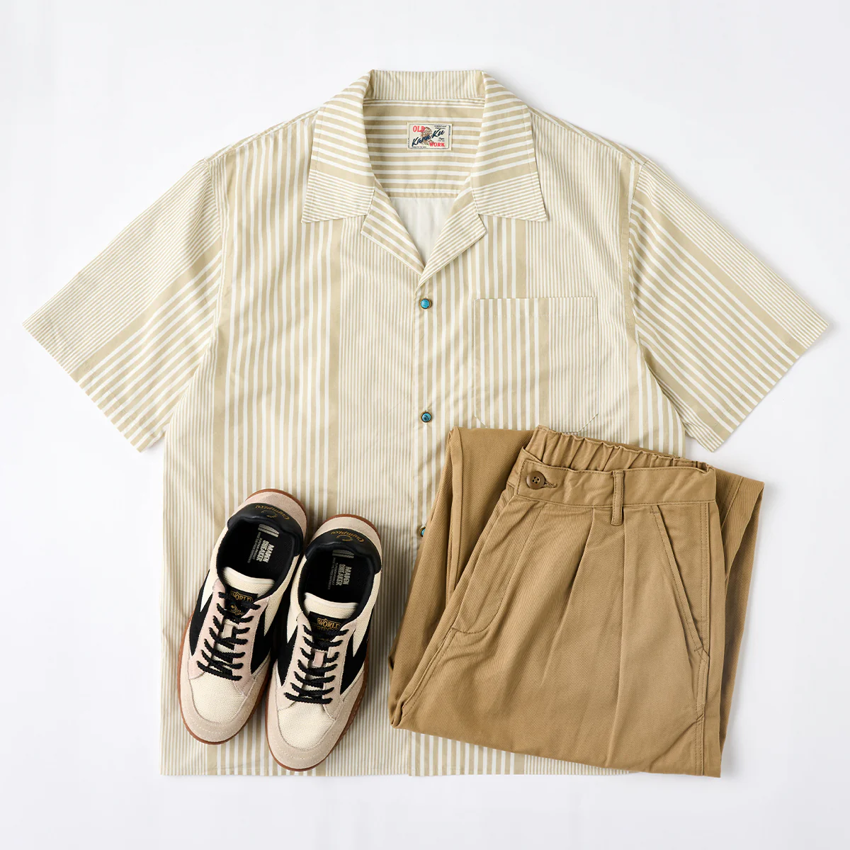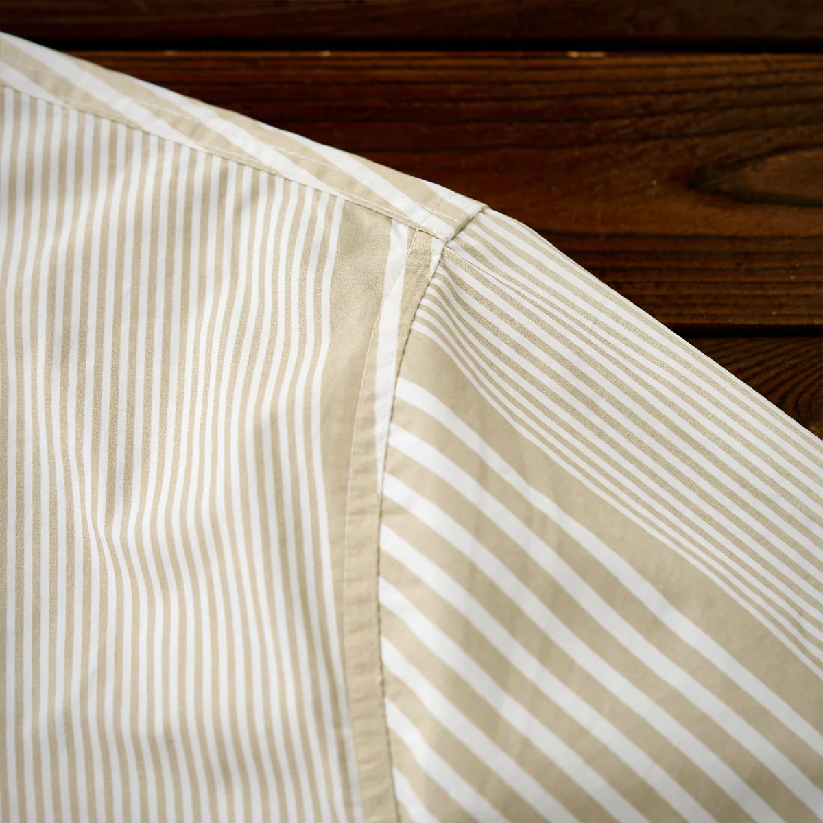 • ターコイズ風ボタン付き ストライプ柄コットン開襟シャツ