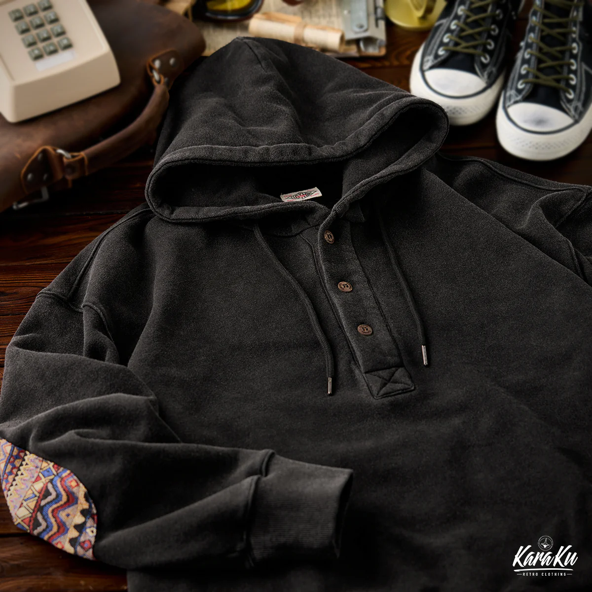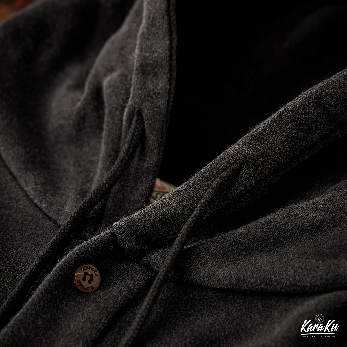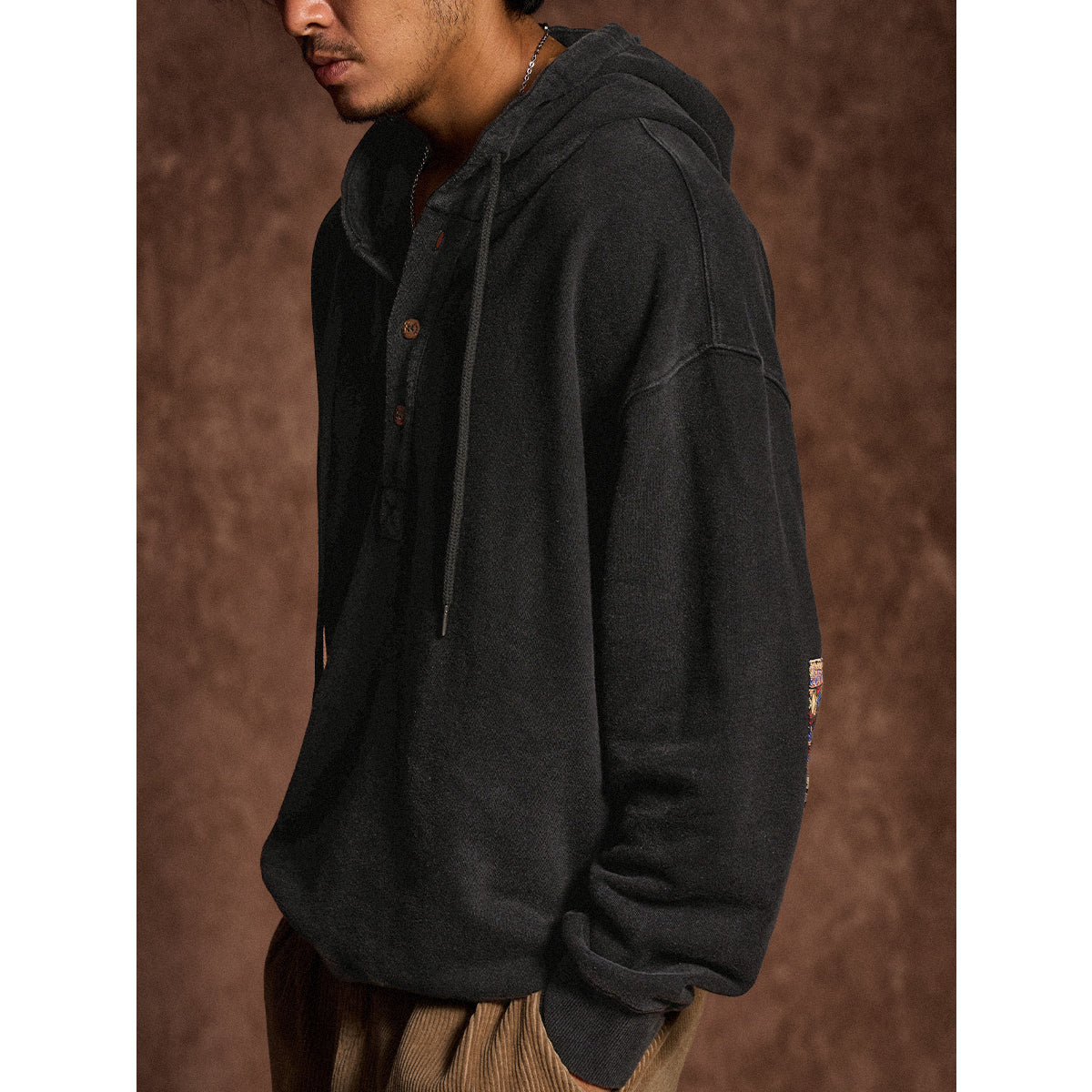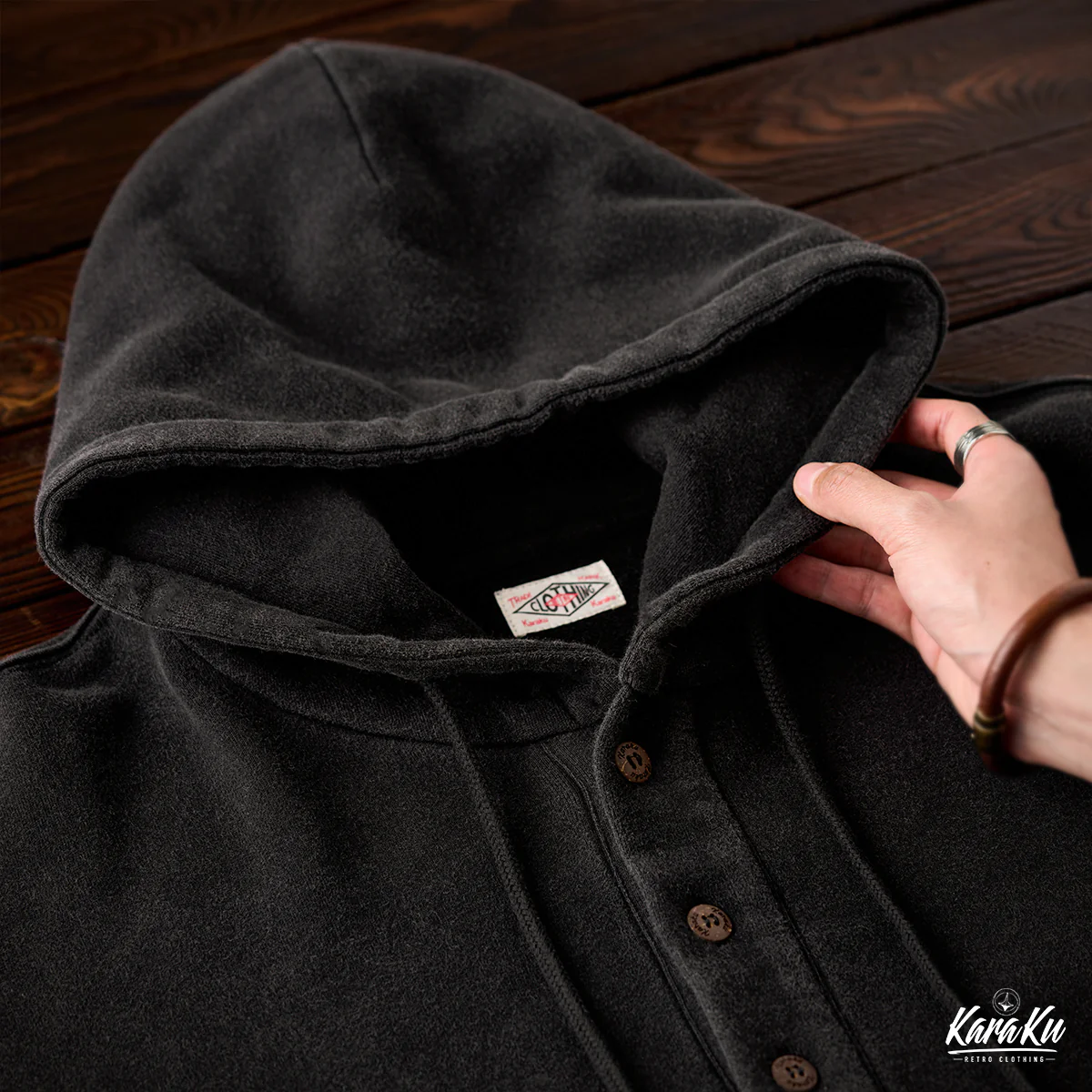 通常のフーディーとは異なり、前開き部分に3つのボタンが付いて、シャツ風のディテールを取り入れている。ボタンは木製で彫刻が施されて、ナチュラルで温かみのあるアクセントになっている。