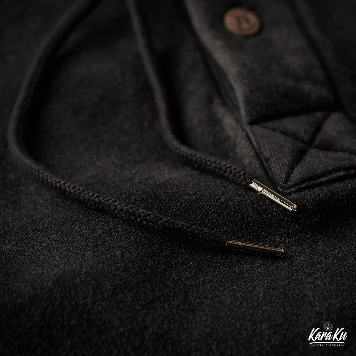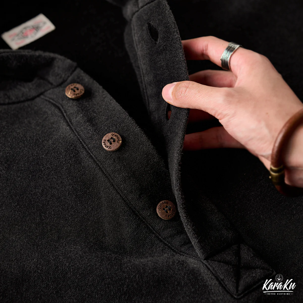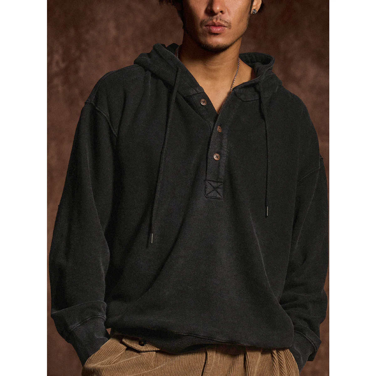 通常のフーディーとは異なり、前開き部分に3つのボタンが付いて、シャツ風のディテールを取り入れている。ボタンは木製で彫刻が施されて、ナチュラルで温かみのあるアクセントになっている。