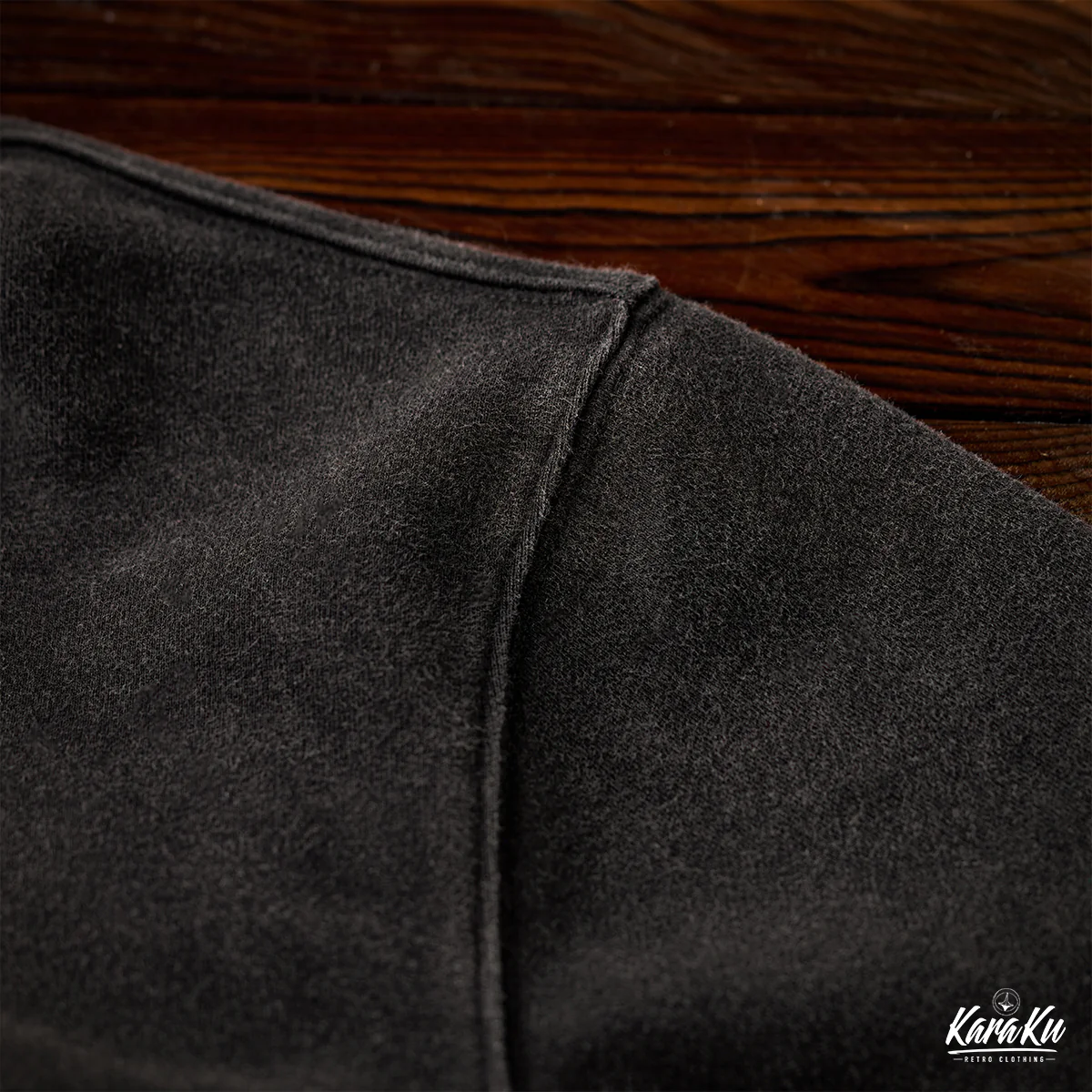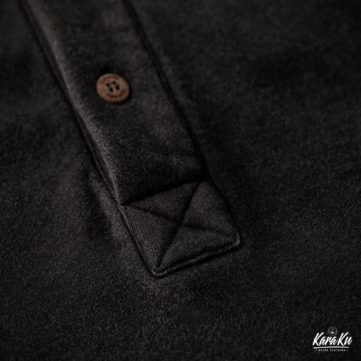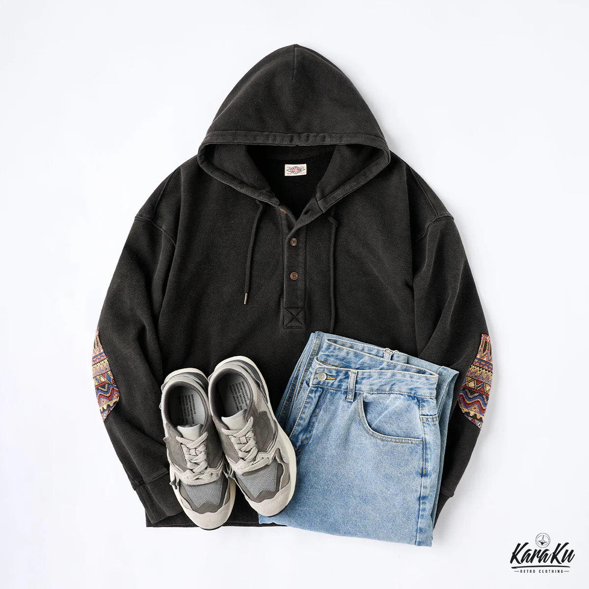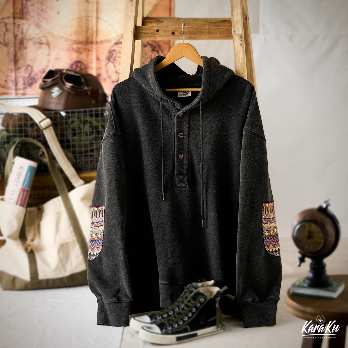 通常のフーディーとは異なり、前開き部分に3つのボタンが付いて、シャツ風のディテールを取り入れている。ボタンは木製で彫刻が施されて、ナチュラルで温かみのあるアクセントになっている。