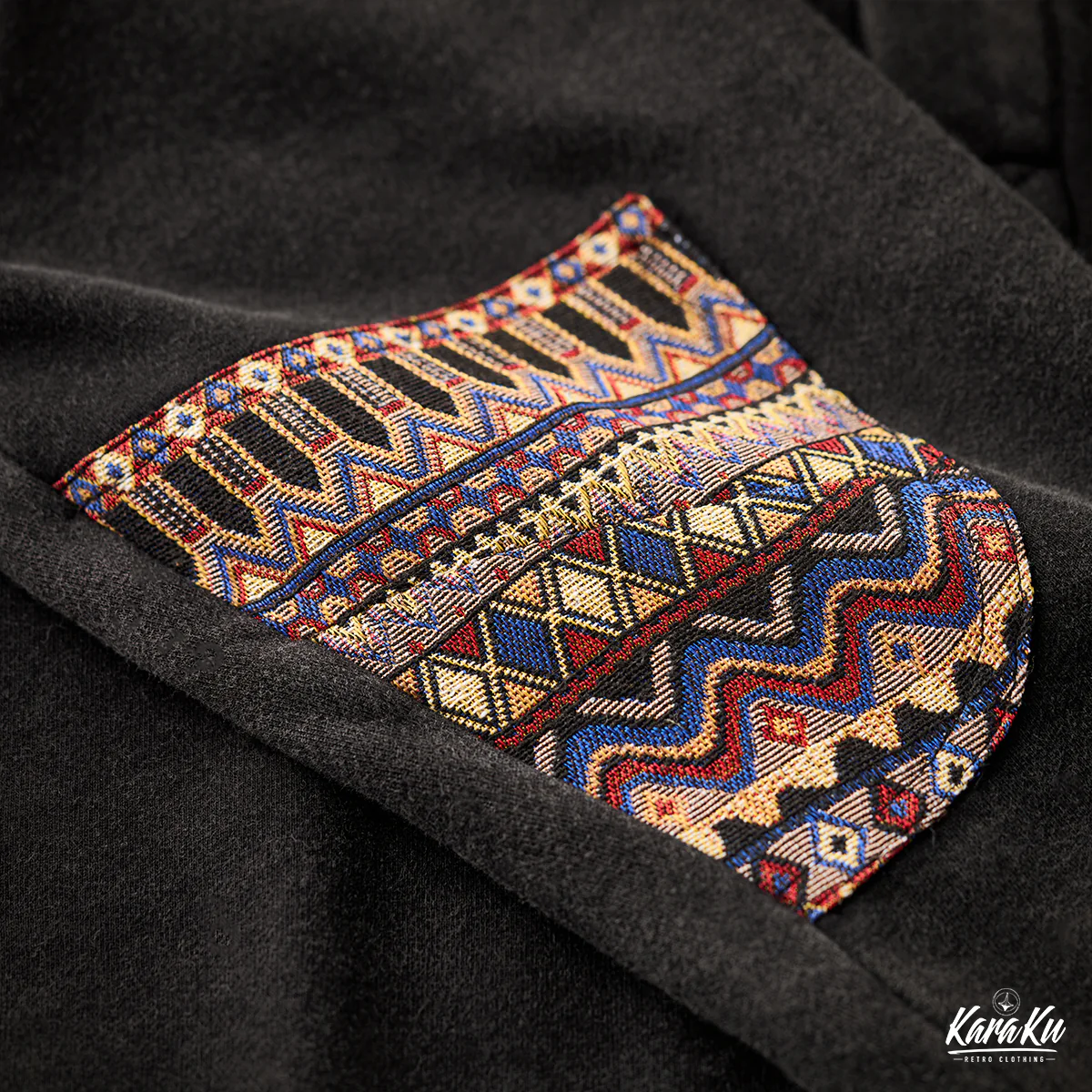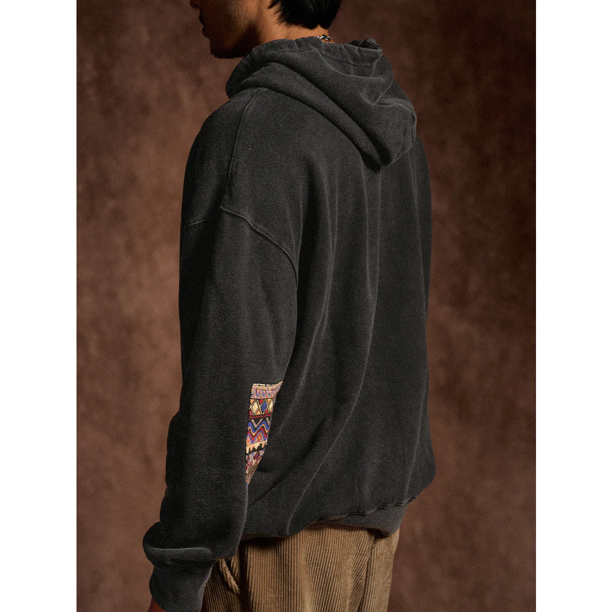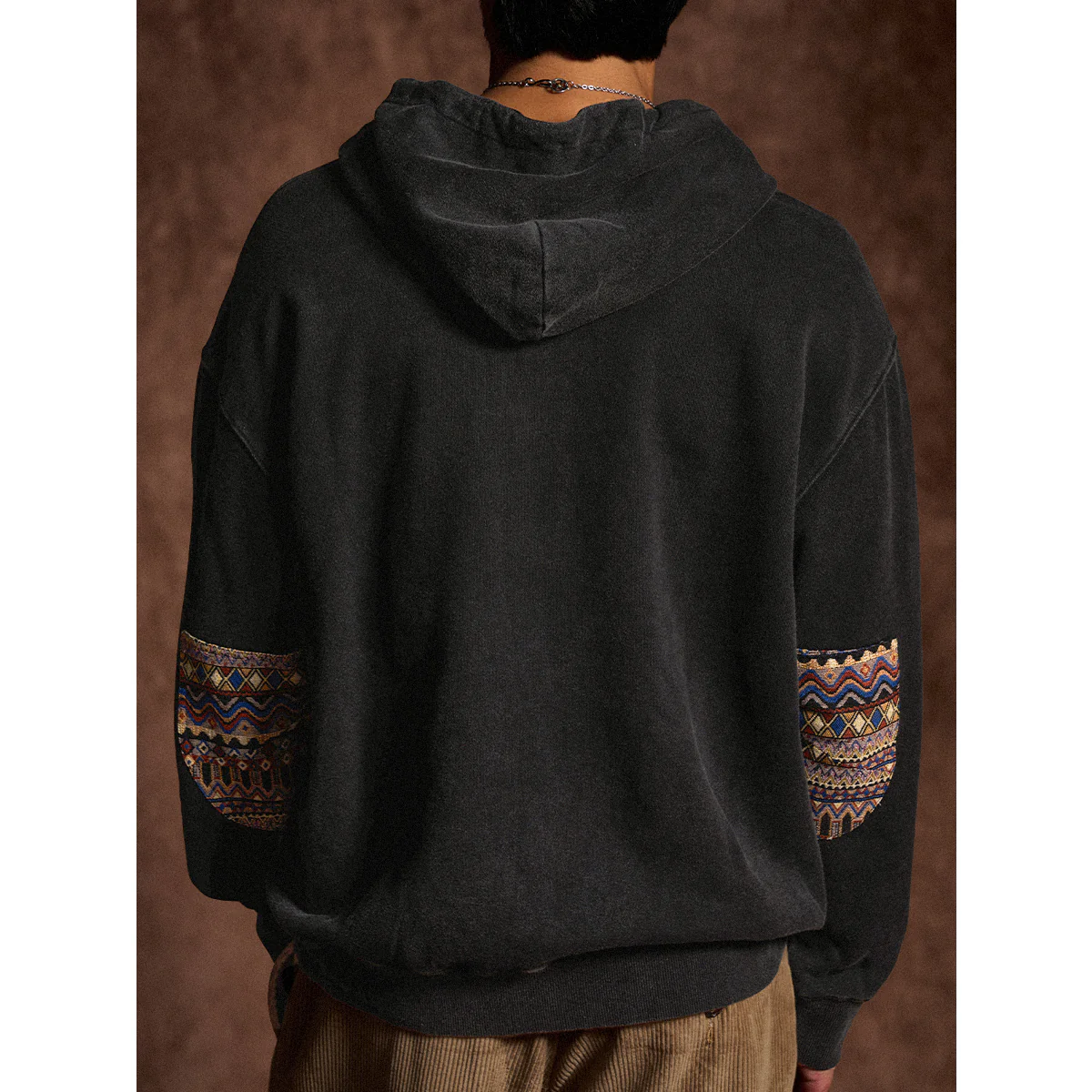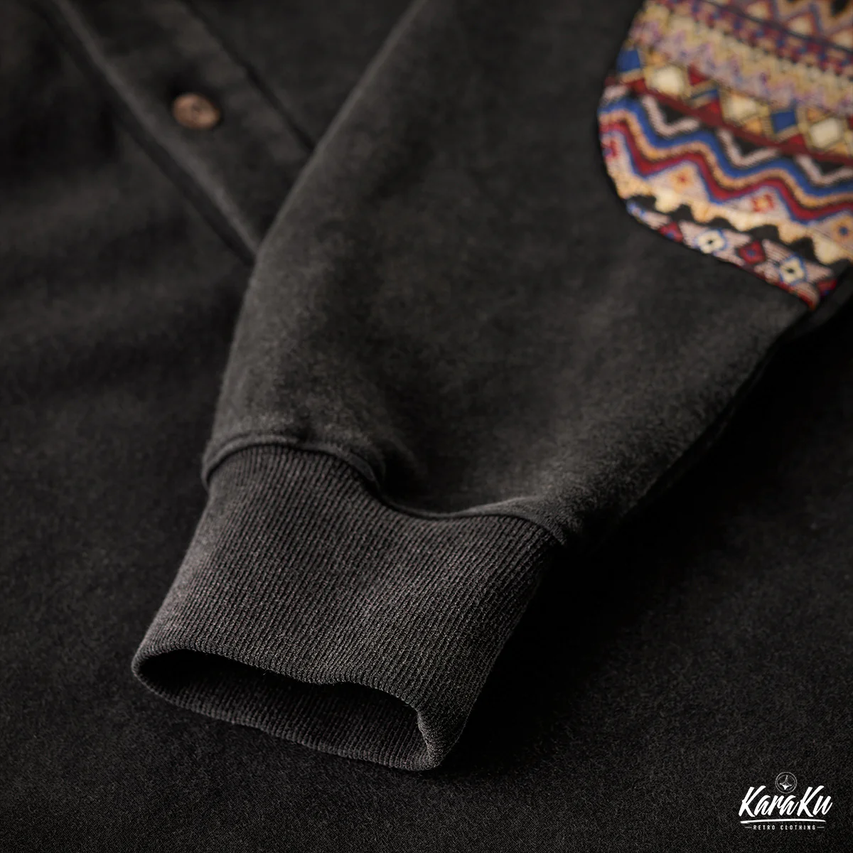 袖の肘部分に施されたインディアン風のジャガード織りのパッチが特徴的。織り柄が立体的で、ヴィンテージ感やハンドクラフトの雰囲気を演出。