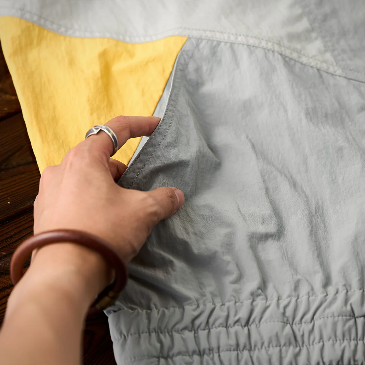 ナイロンやナイロンとコットンを混紡した素材を使用。しわになりにくく、お手入れも楽。また撥水性を備えているため、ちょっとした雨や風にも対応でき、アクティブなシーンに最適です。