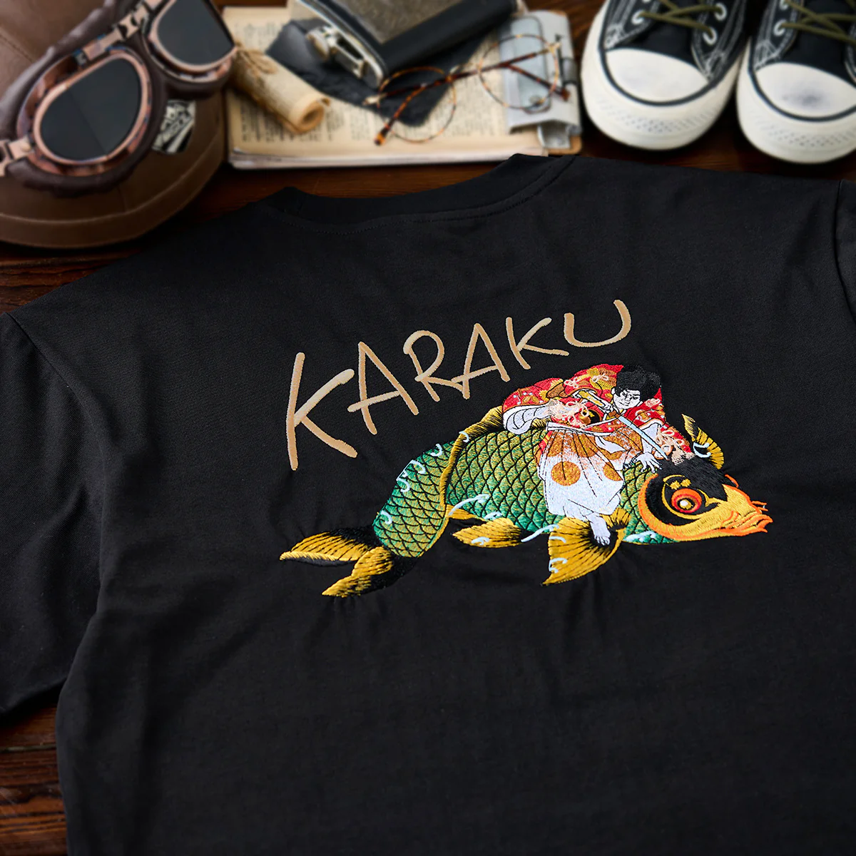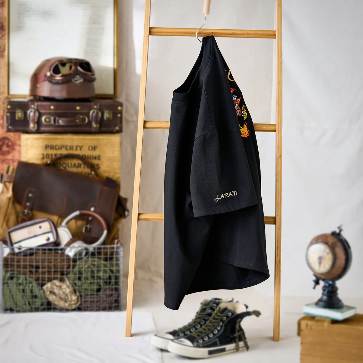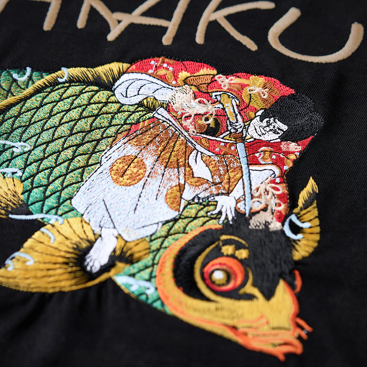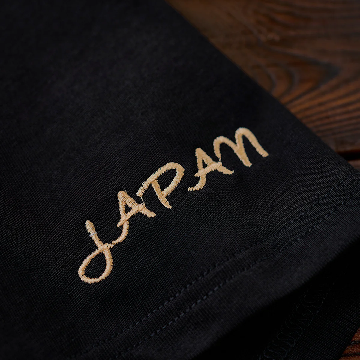 江戸時代の浮世絵師・魚屋北渓(Totoya Hokkei)による鯉の図をモチーフに、背面に豪華な刺繍で表現した一枚。水面を力強く泳ぐ鯉の姿を、浮世絵の繊細な筆致を活かしながら立体感のある刺繍で再現しています。アートとしての存在感を背中にまとい、見る者を惹きつける仕上がりに。左袖には「JAPAN」の文字を刺繍であしらい、さりげなく和のスピリットを主張。ボディは上質なコットン、ブラックカラーが刺繍の美しさを引き立てます。伝統と現代が響き合う、粋なTシャツです。