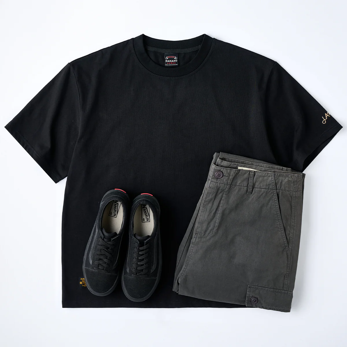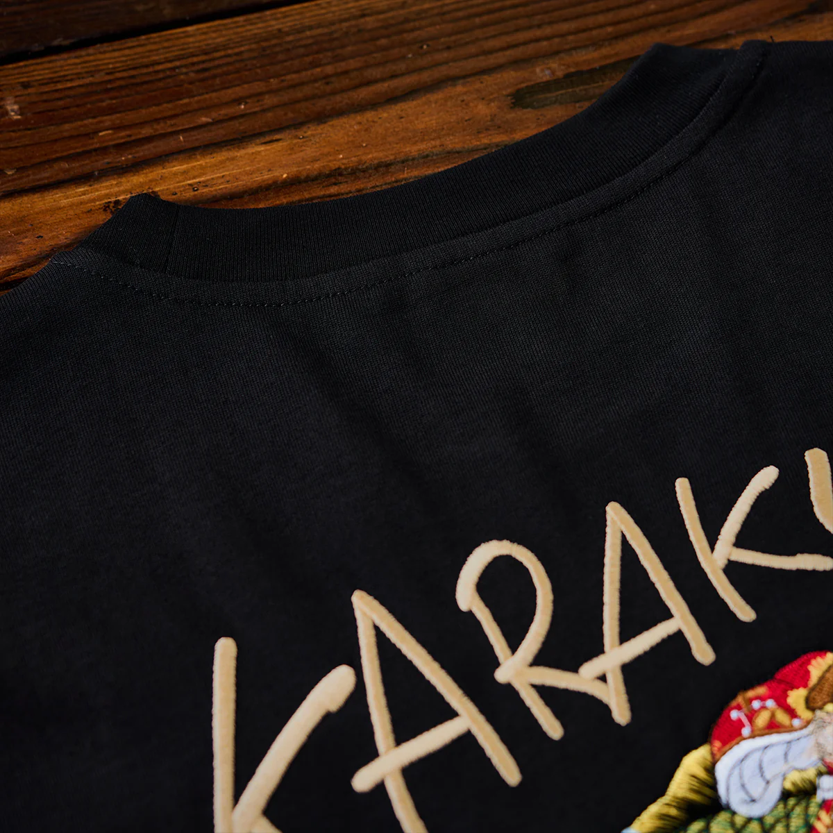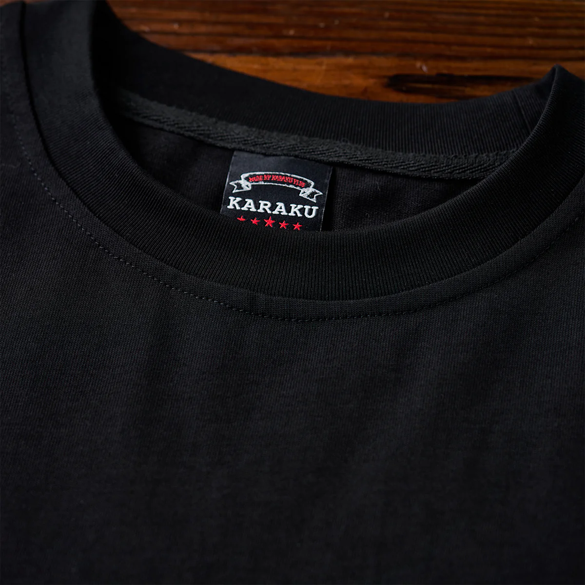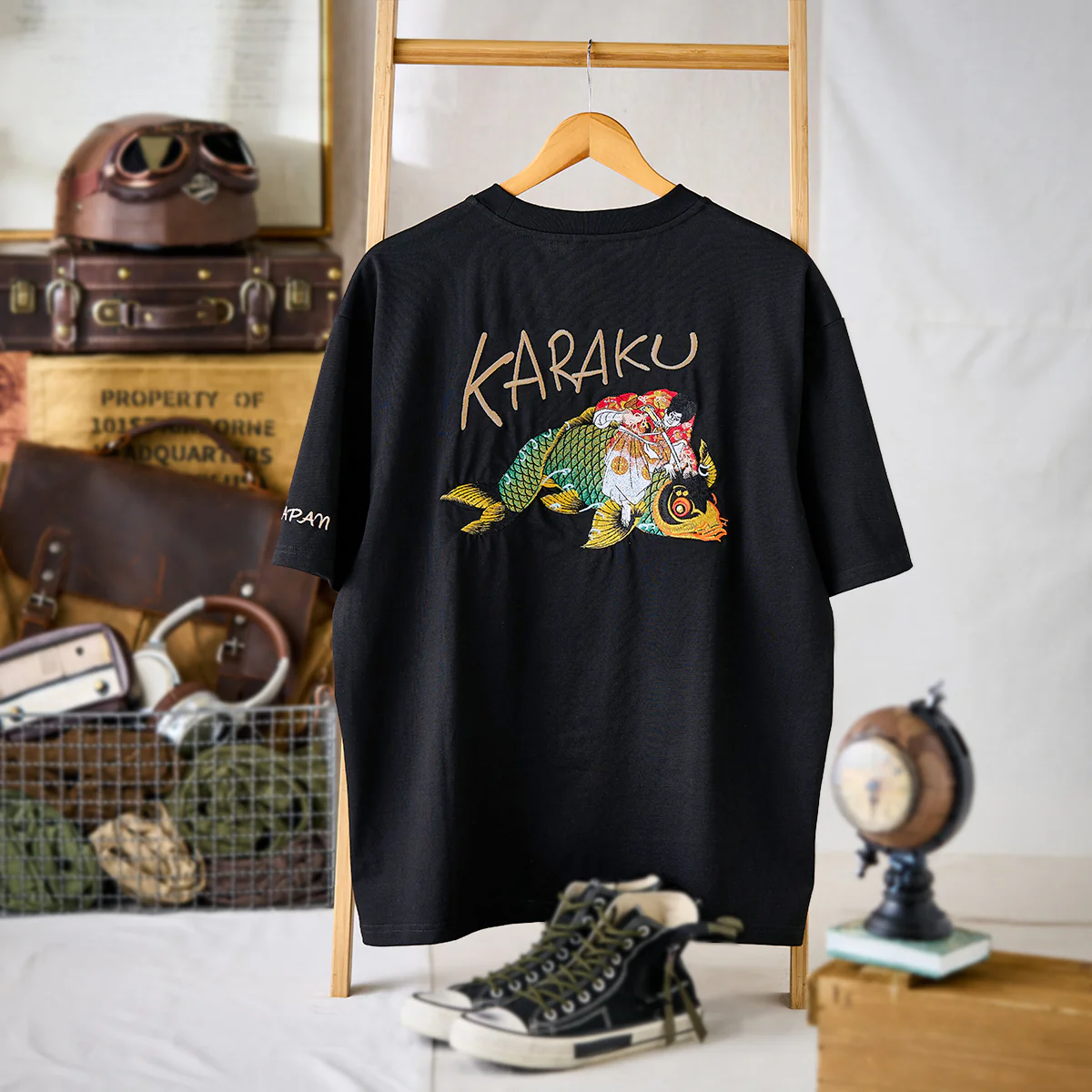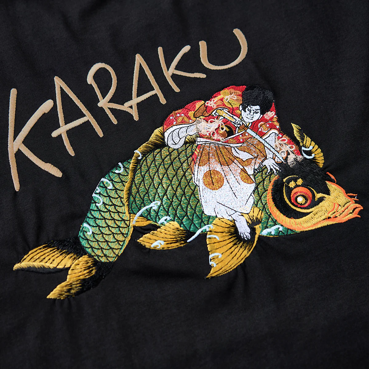 江戸時代の浮世絵師・魚屋北渓(Totoya Hokkei)による鯉の図をモチーフに、背面に豪華な刺繍で表現した一枚。水面を力強く泳ぐ鯉の姿を、浮世絵の繊細な筆致を活かしながら立体感のある刺繍で再現しています。アートとしての存在感を背中にまとい、見る者を惹きつける仕上がりに。左袖には「JAPAN」の文字を刺繍であしらい、さりげなく和のスピリットを主張。ボディは上質なコットン、ブラックカラーが刺繍の美しさを引き立てます。伝統と現代が響き合う、粋なTシャツです。