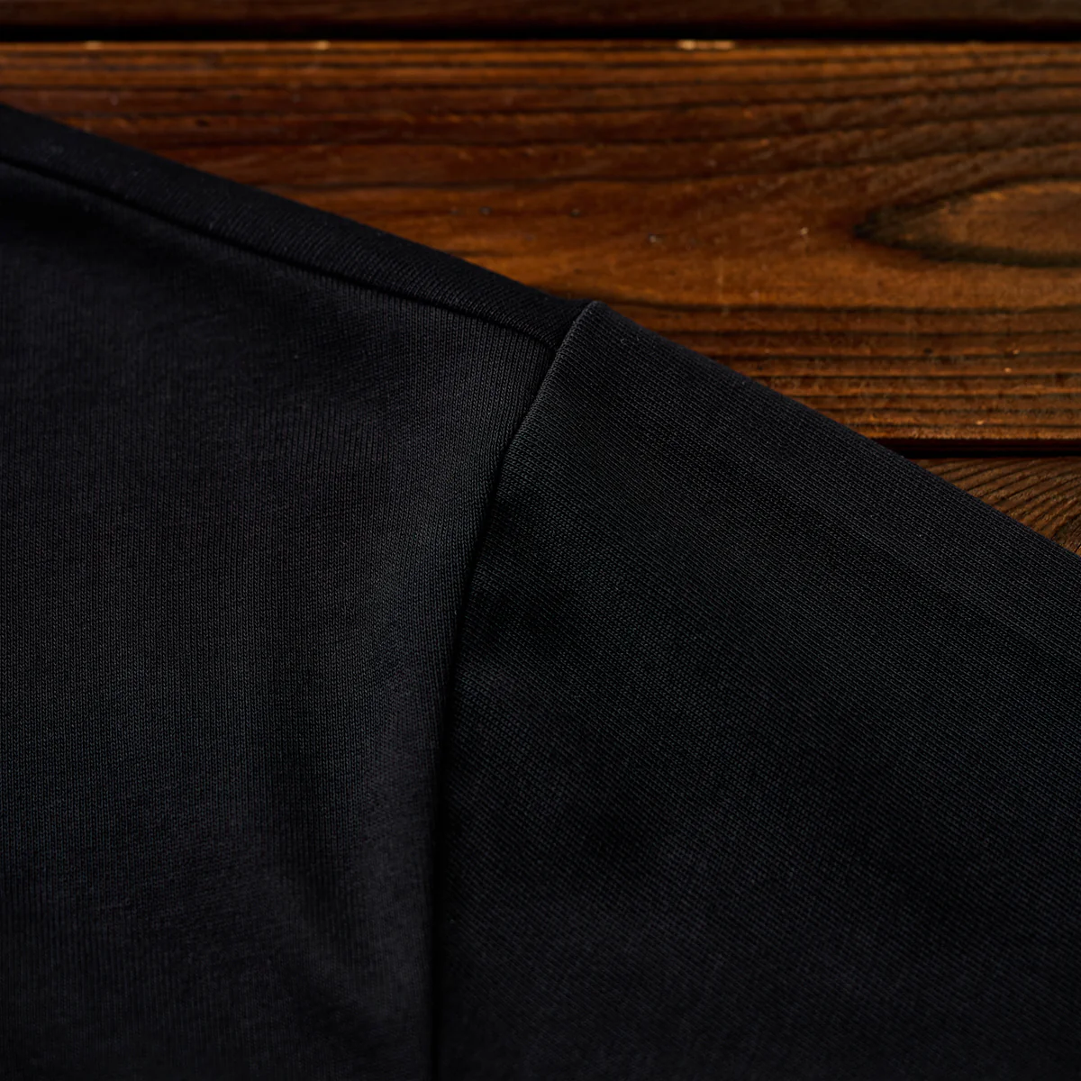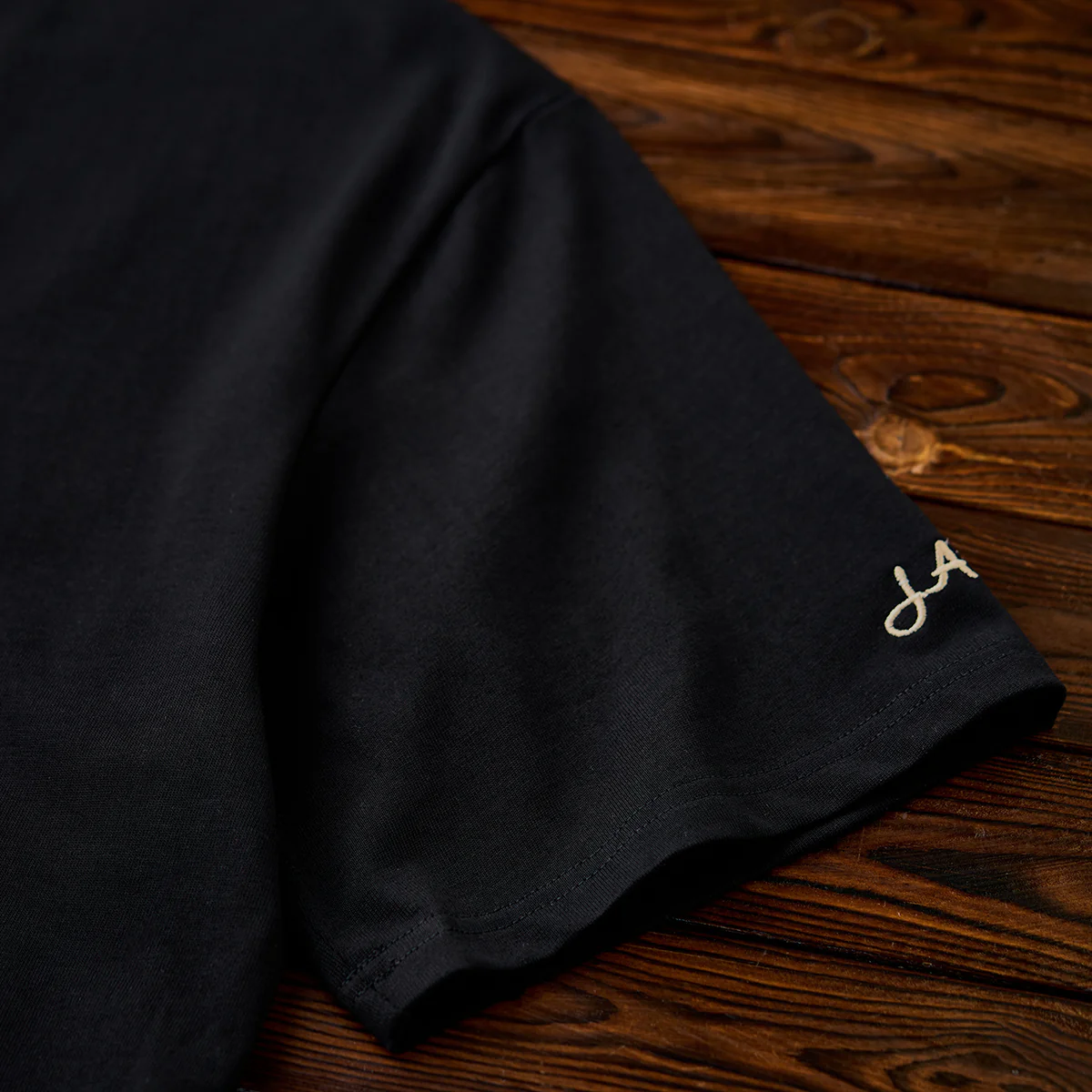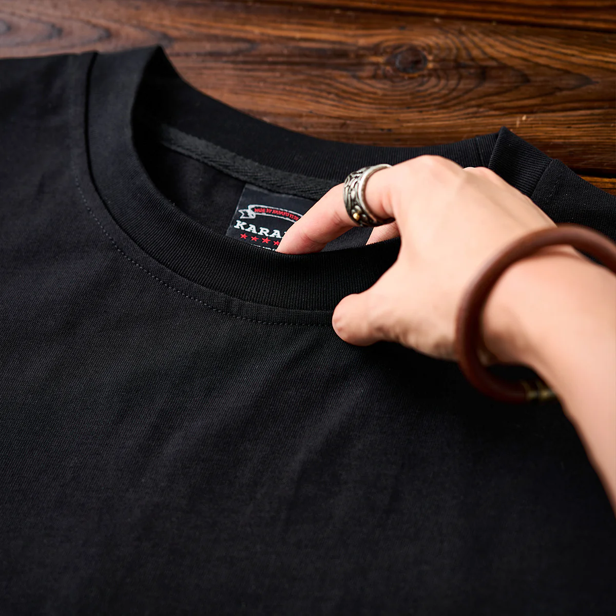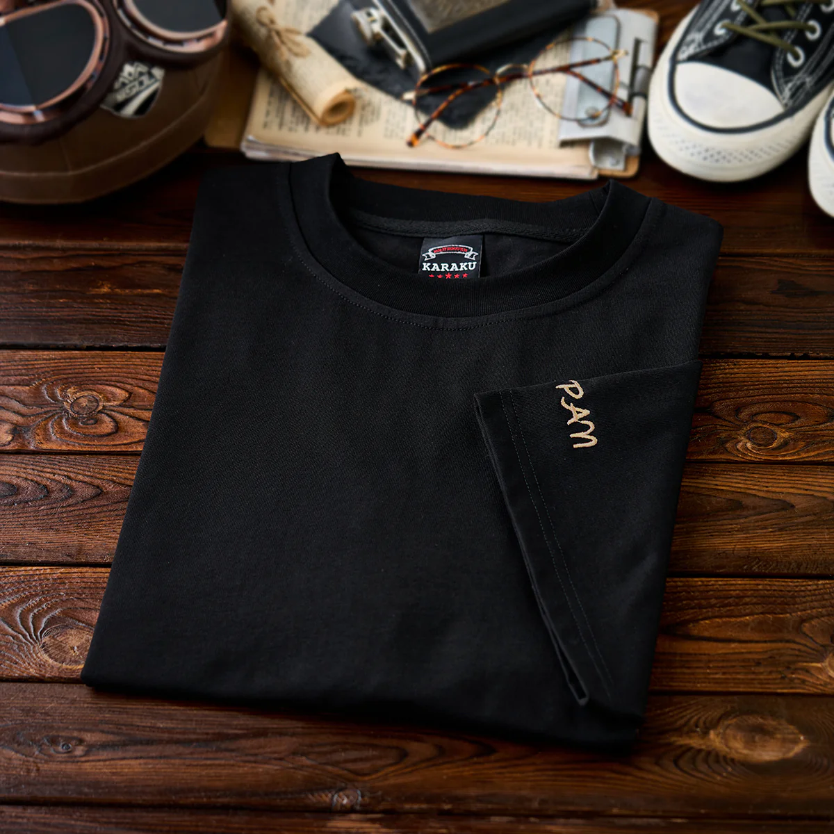 江戸時代の浮世絵師・魚屋北渓(Totoya Hokkei)による鯉の図をモチーフに、背面に豪華な刺繍で表現した一枚。水面を力強く泳ぐ鯉の姿を、浮世絵の繊細な筆致を活かしながら立体感のある刺繍で再現しています。アートとしての存在感を背中にまとい、見る者を惹きつける仕上がりに。左袖には「JAPAN」の文字を刺繍であしらい、さりげなく和のスピリットを主張。ボディは上質なコットン、ブラックカラーが刺繍の美しさを引き立てます。伝統と現代が響き合う、粋なTシャツです。
